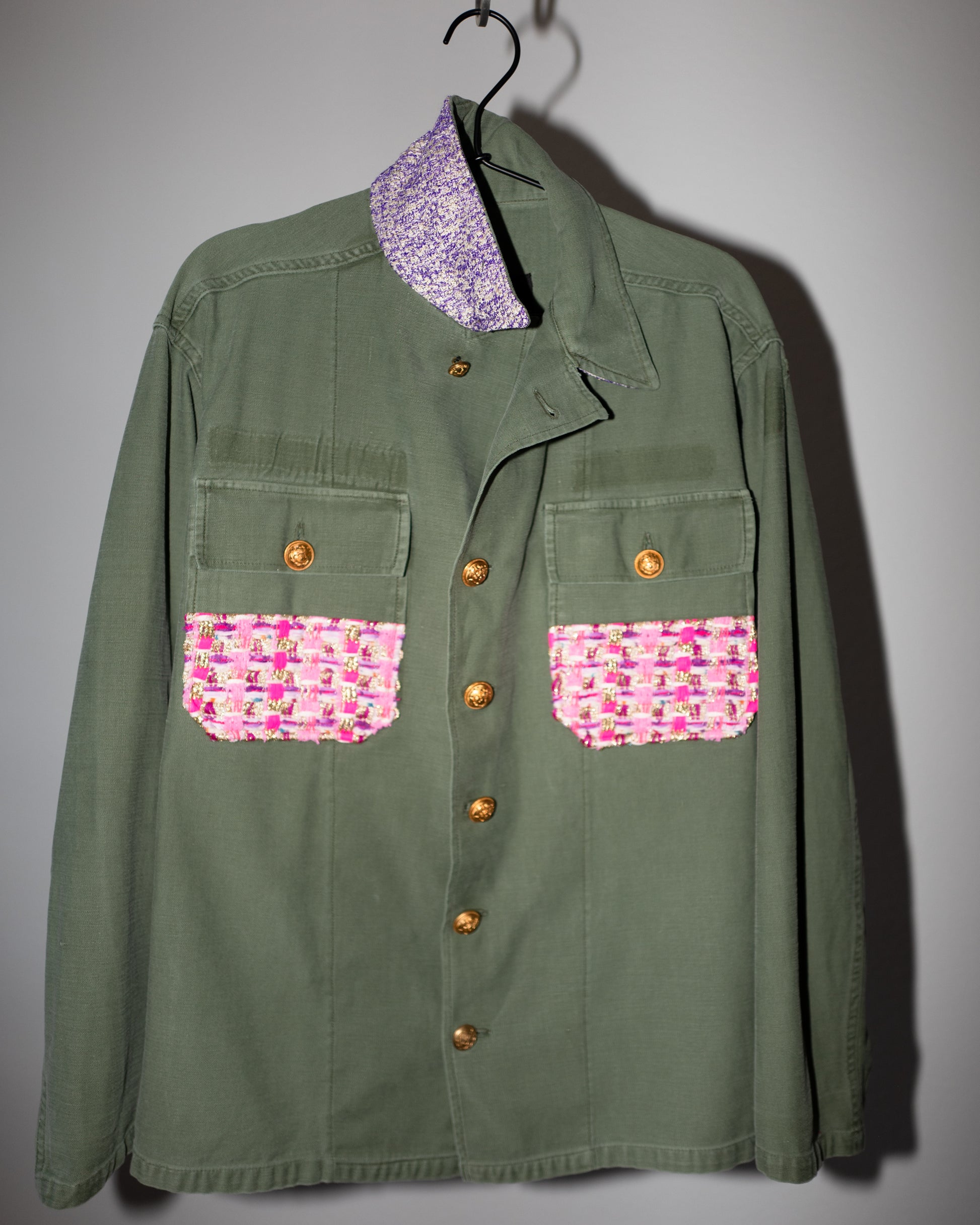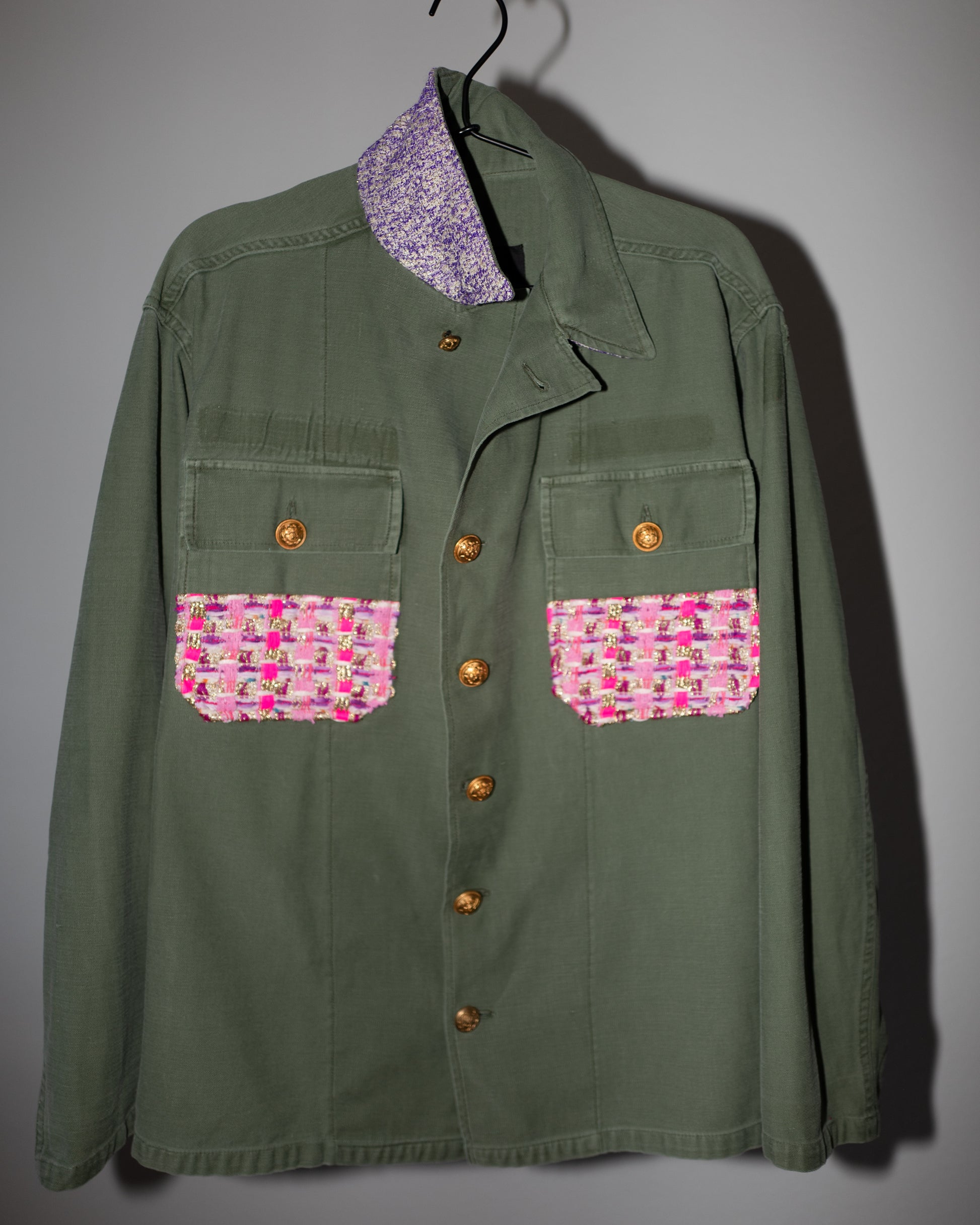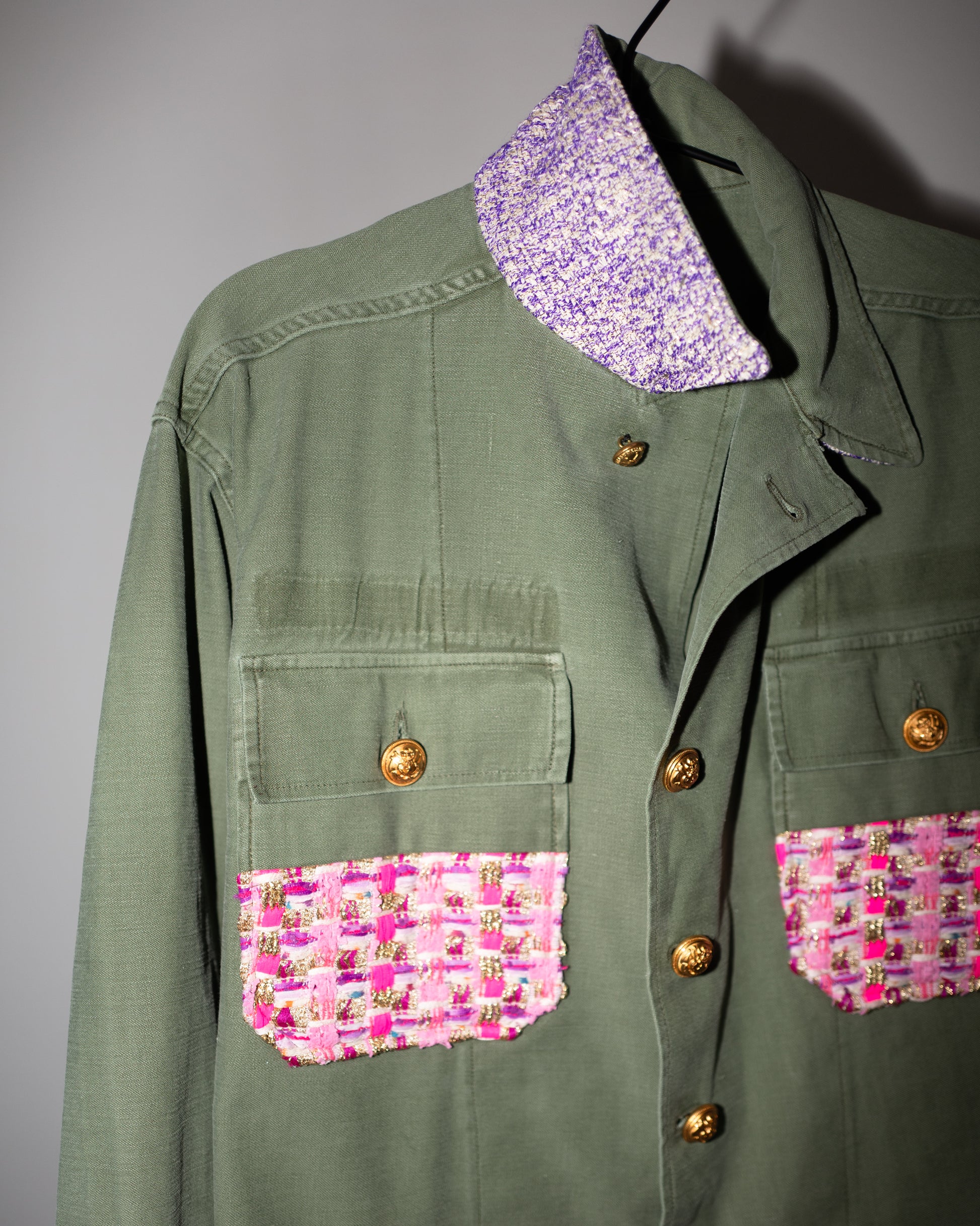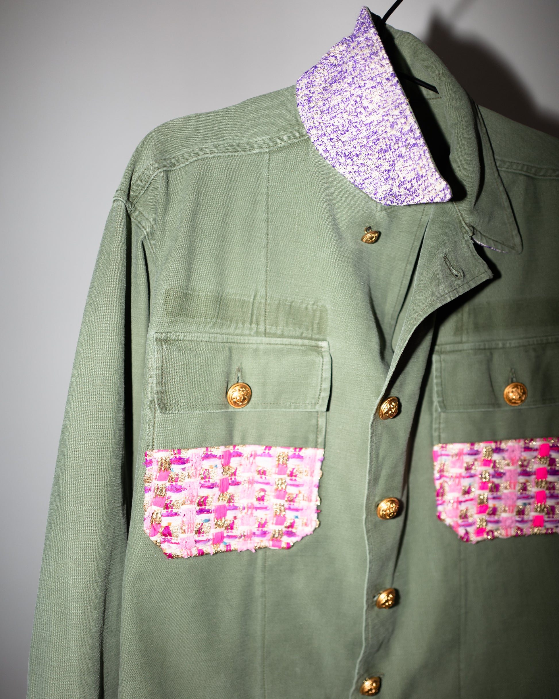 Our one of a kind, zero waste, up-cycled jackets are made from vintage, natural fibers, military clothing and french workwear from the period 1940-1970's. We then repurpose and embellish with the finest details of intricate precious Italian and French designer tweeds, antique fringes and braids and vintage military buttons,