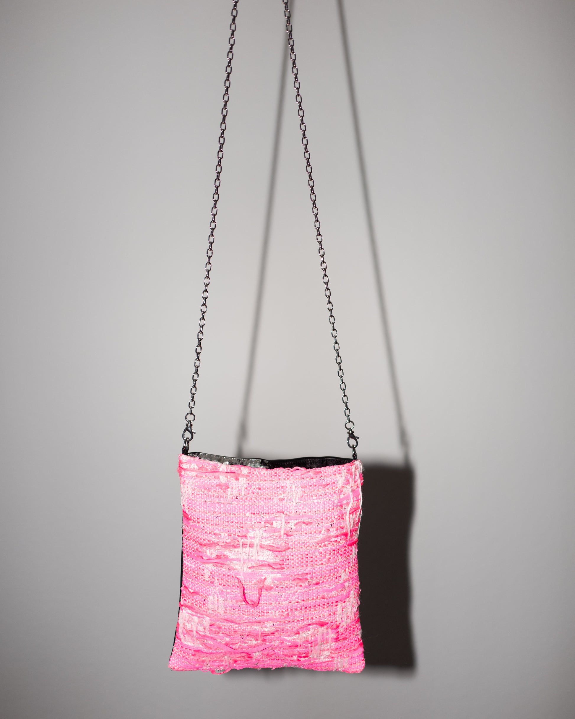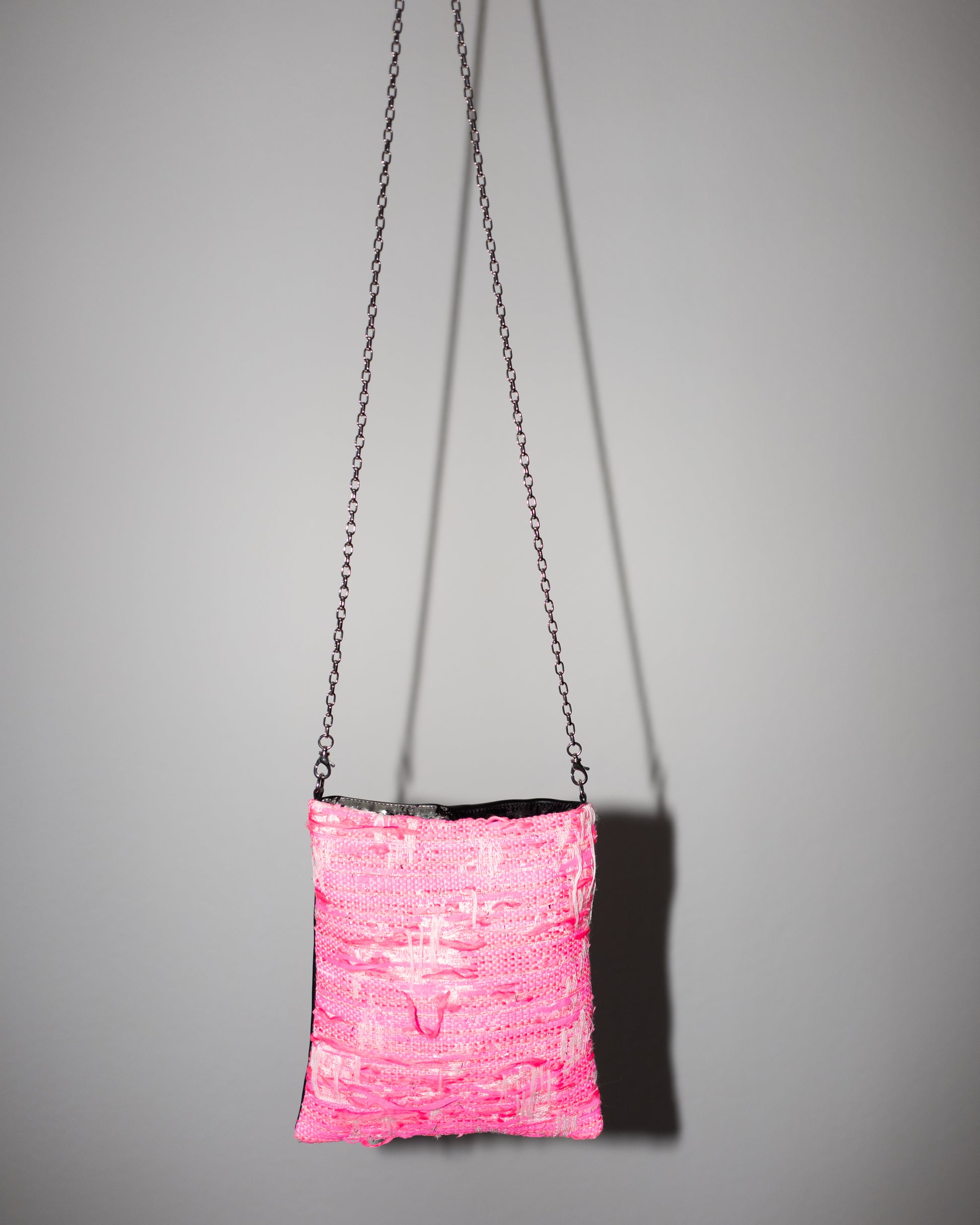 Bag with Neon Pink Tweed and Black Leather Silver Chain