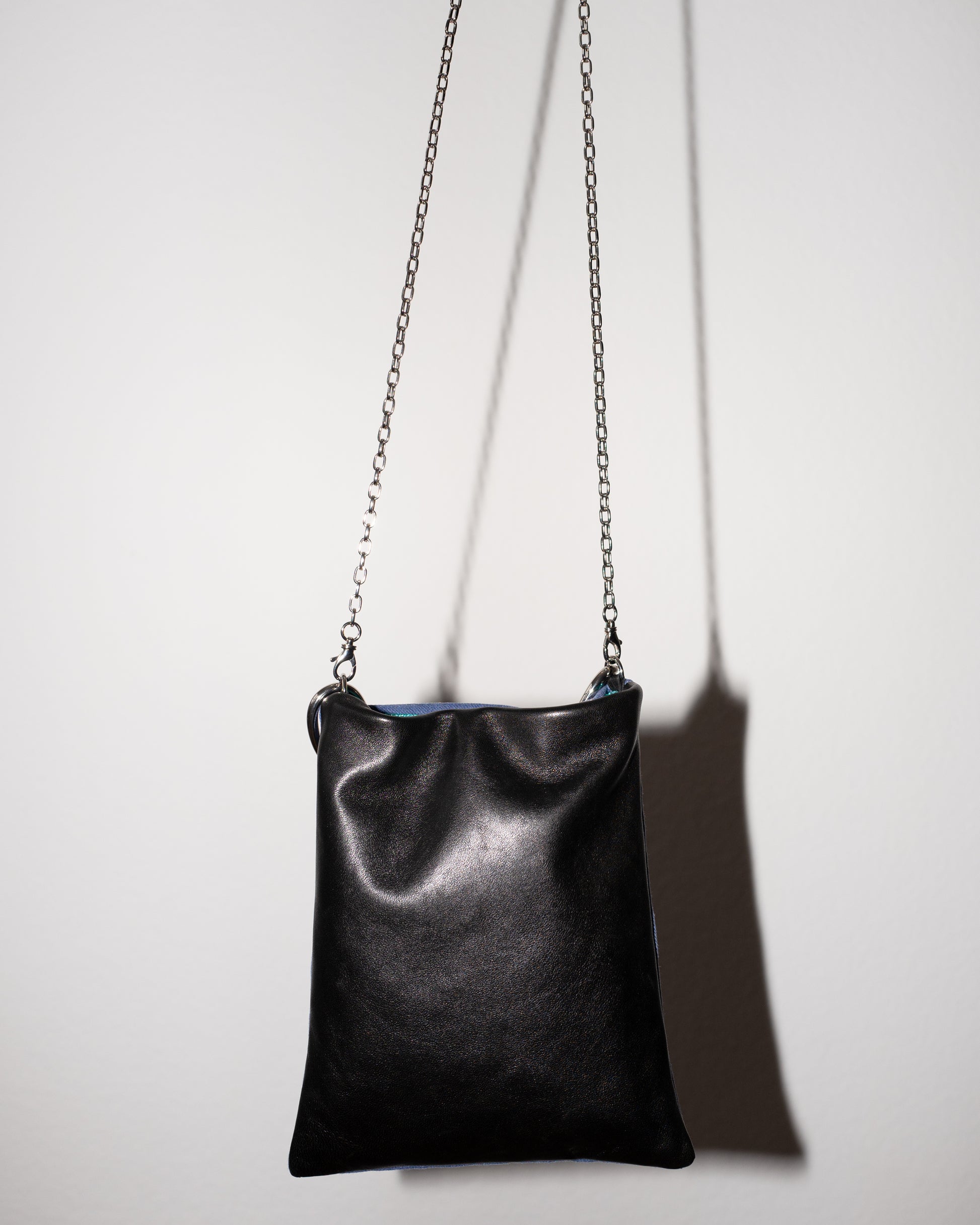 This Leather bag is a one of a kind bag made of French Vintage Workwear, Italian Napa Leather and Italian Chains. It is light weight and easy to carry. It's the perfect party bag but can be worn in more causal settings as well. It's a fun, unique piece that are meant to spread joy and make you happy. Enough with heavy boring leatherbags that make you look like everybody else, we feel that you are unique, and a bag should match your individuality but also make you happy. A bag shall be irresistible and talk to your emotions, a piece that creates conversation and makes you dream.