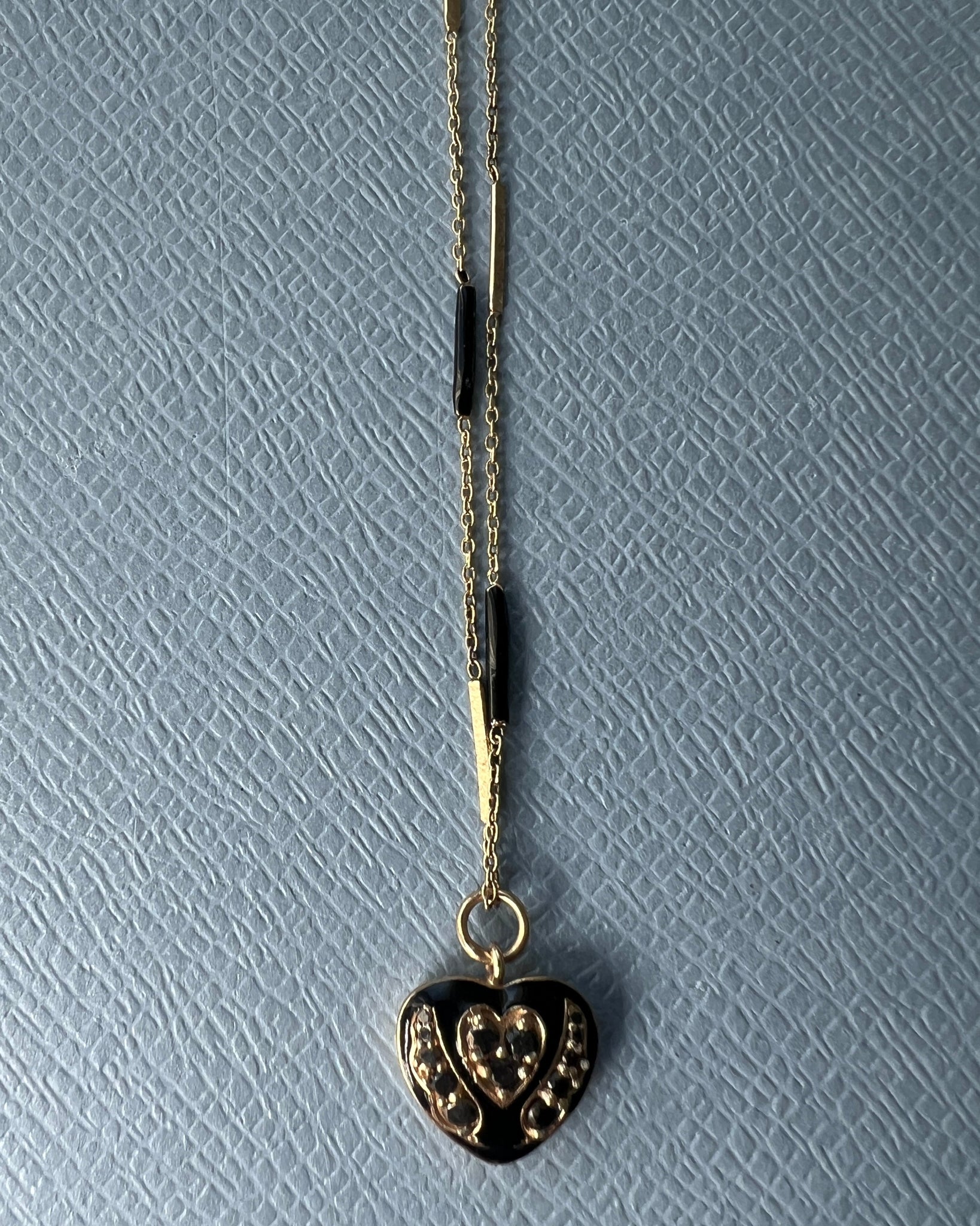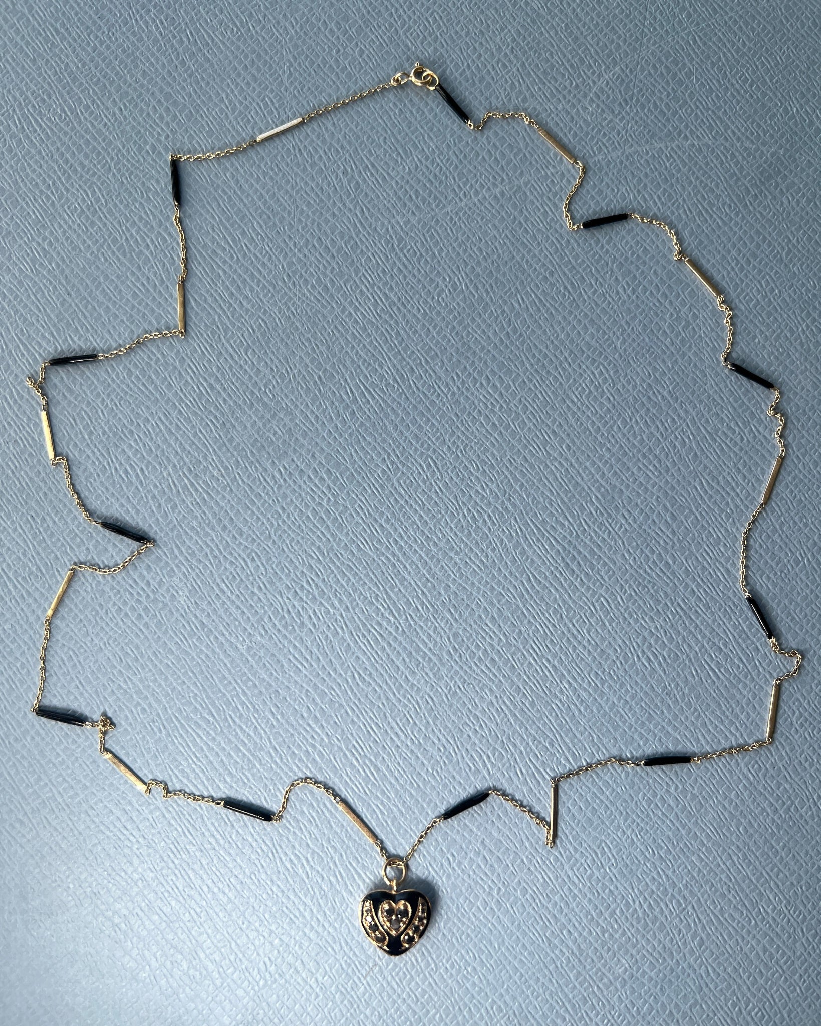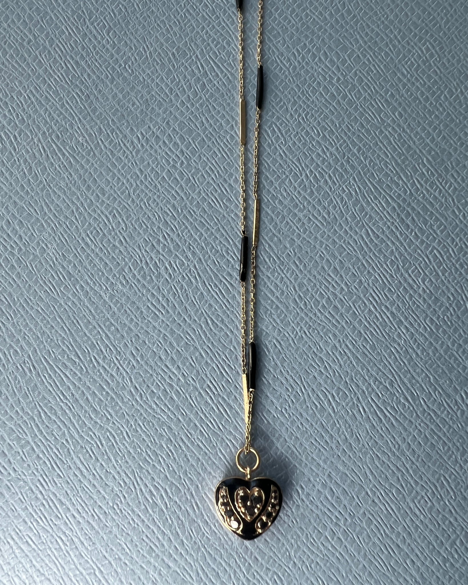 Black Diamond set on Heart Pendant, paired with a Black Enamel 14K Gold Plated Silver Chain