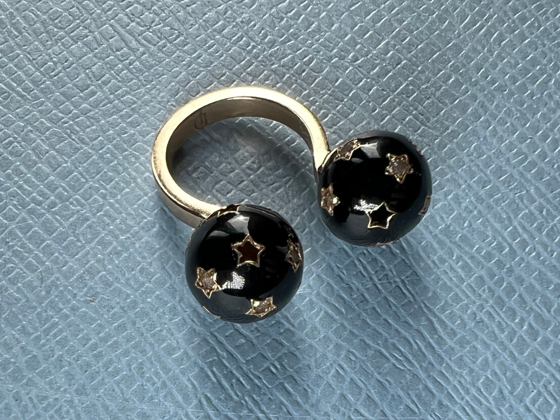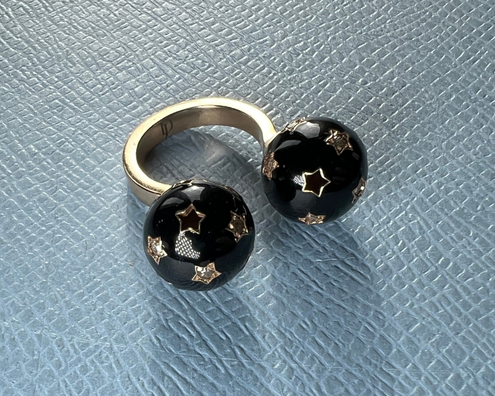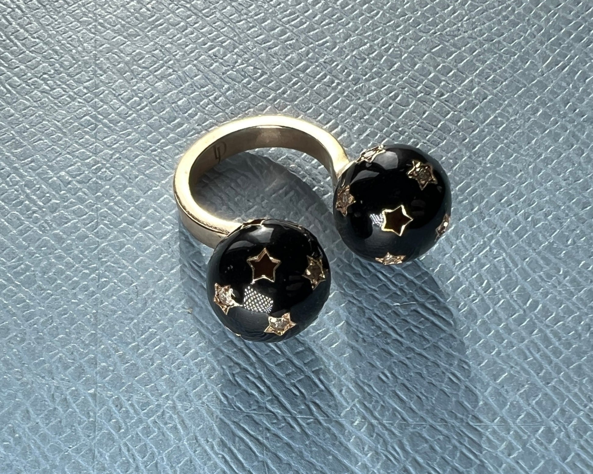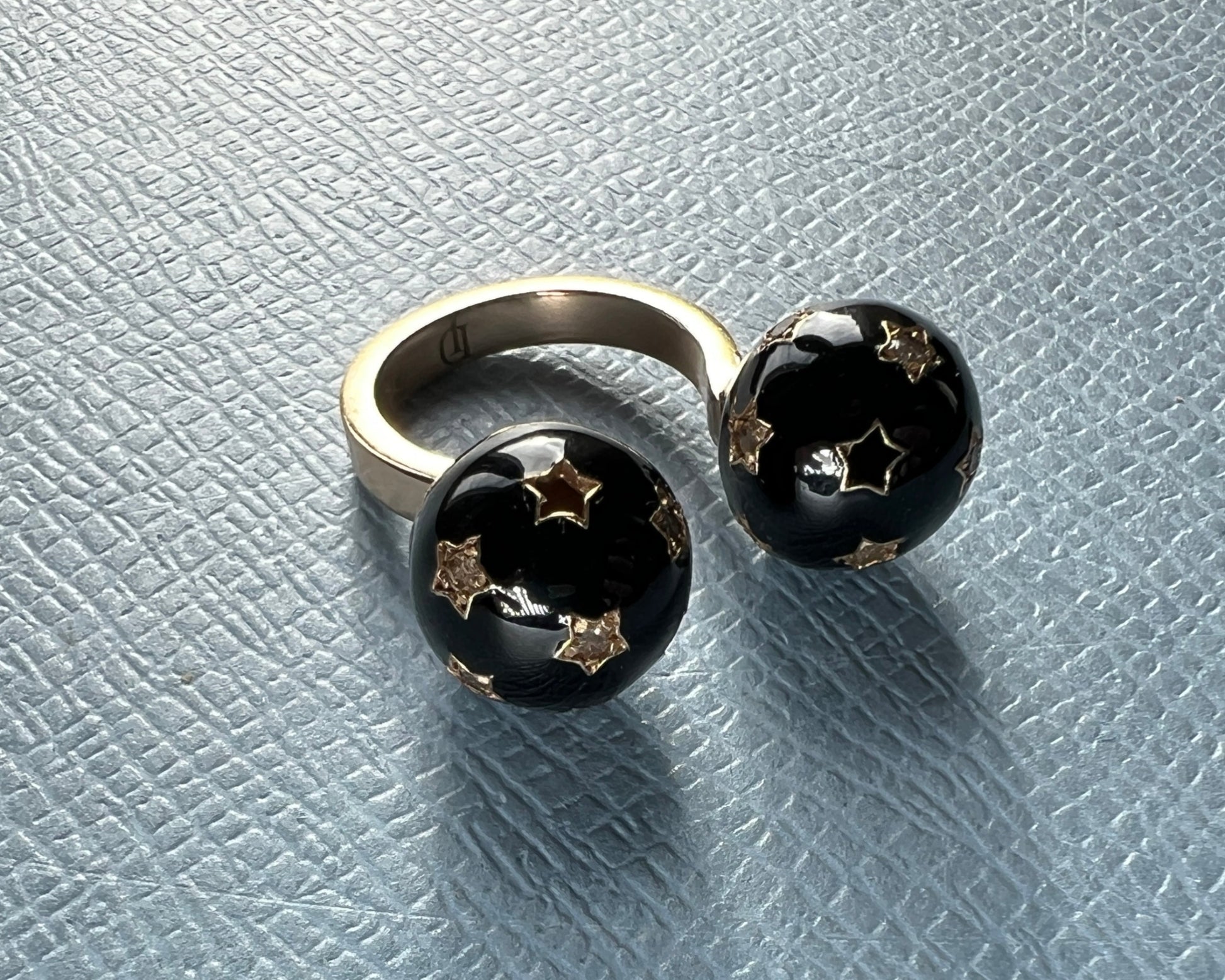 This Open Ring has two spheres facing each other, the spheres has engraved stars, within the stars there are black diamonds.