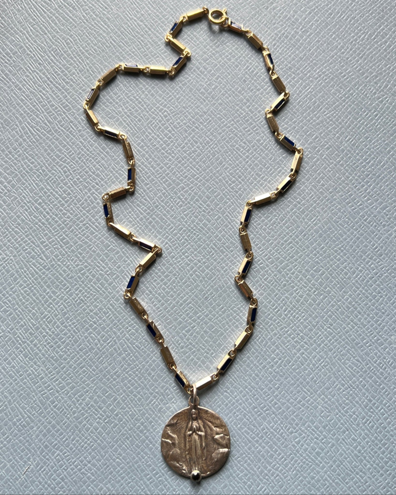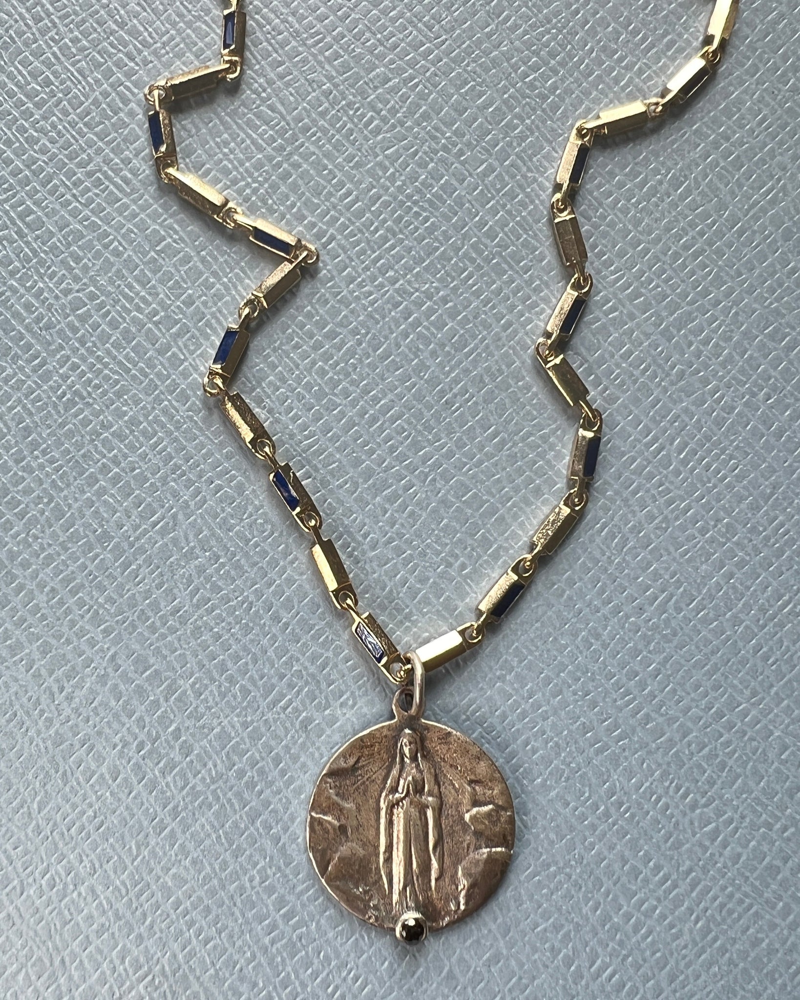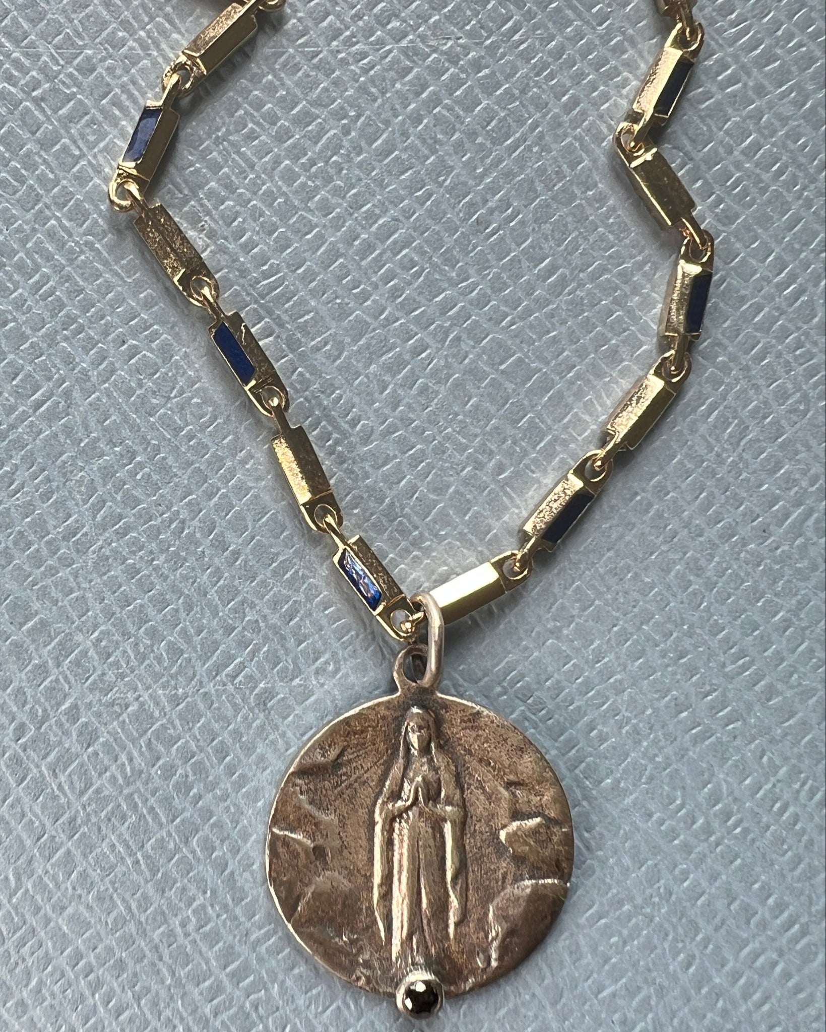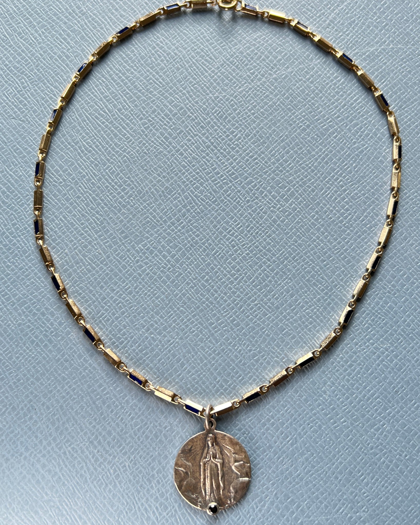 A Virgin Mary medal set with 1 Black Diamond, crafted from solid silver, paired with a 14k gold-plated Royal Blue Enamelled Chain