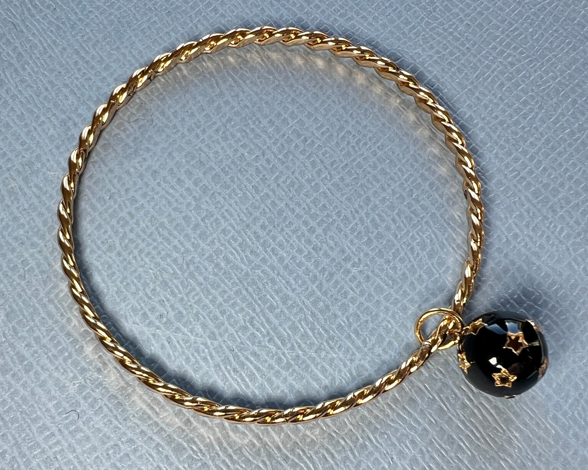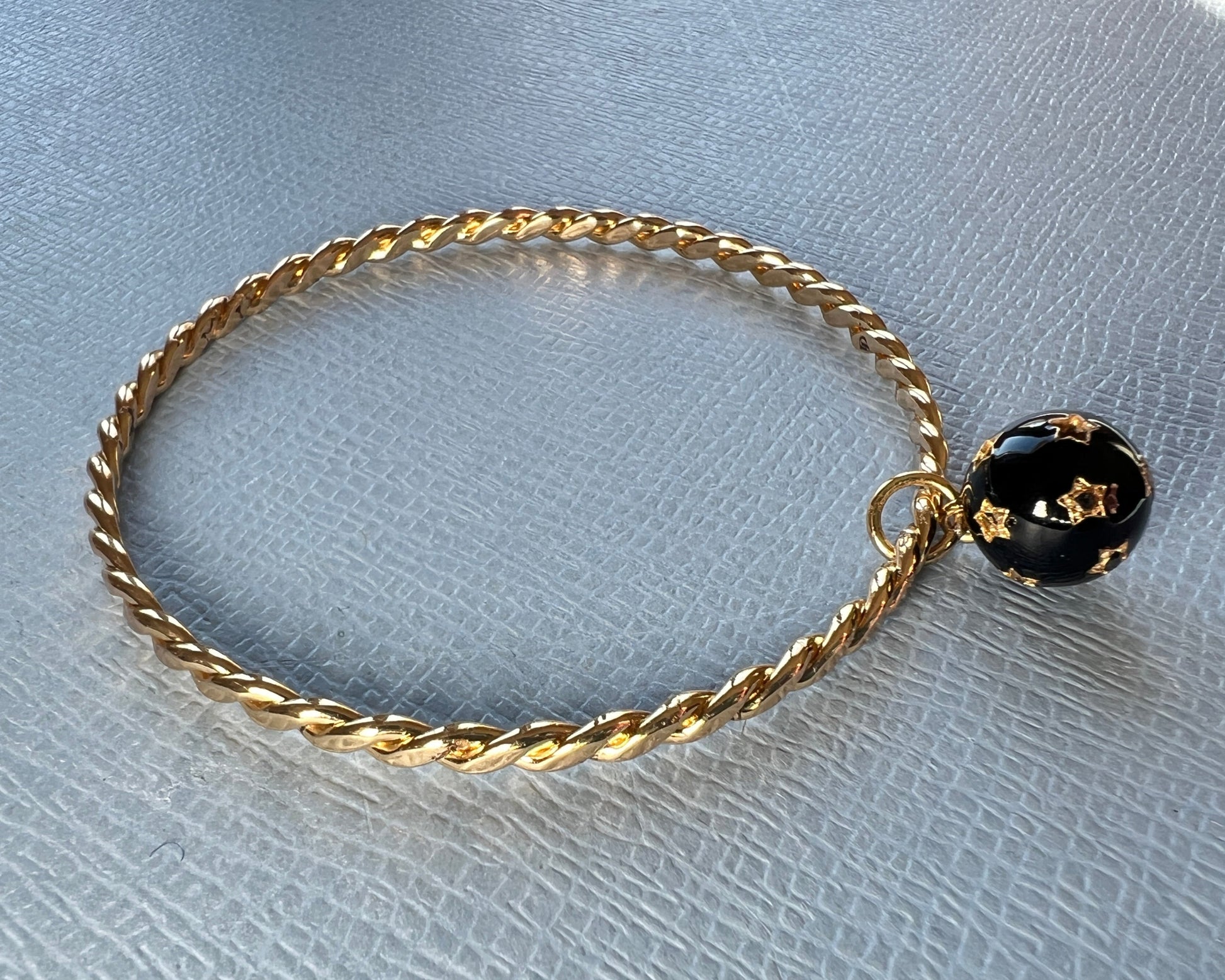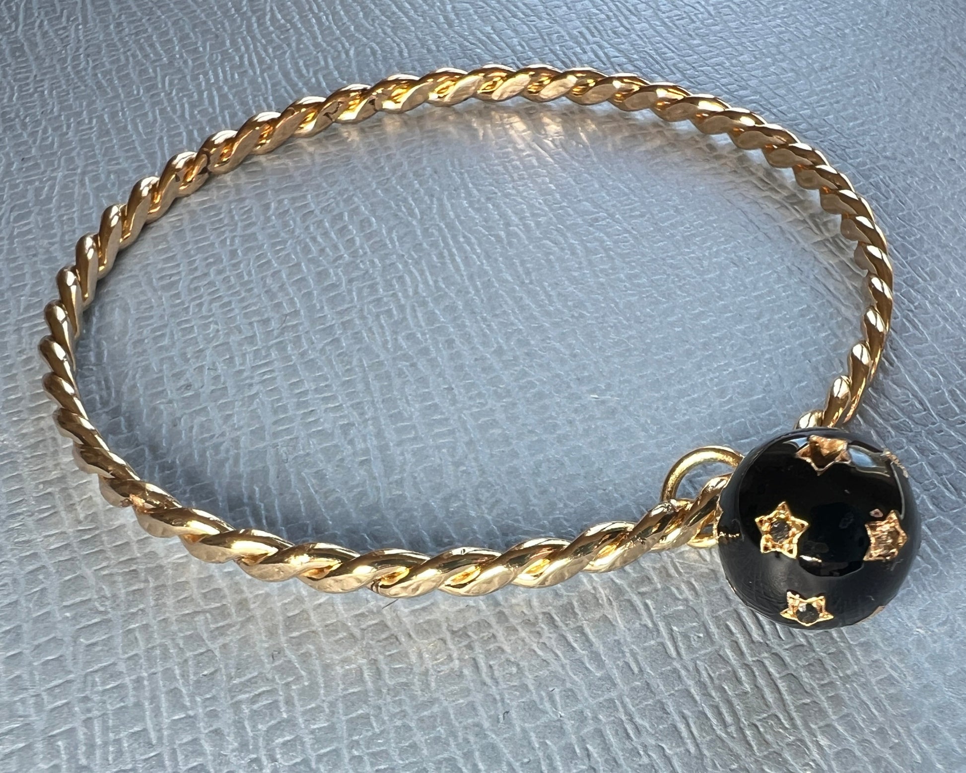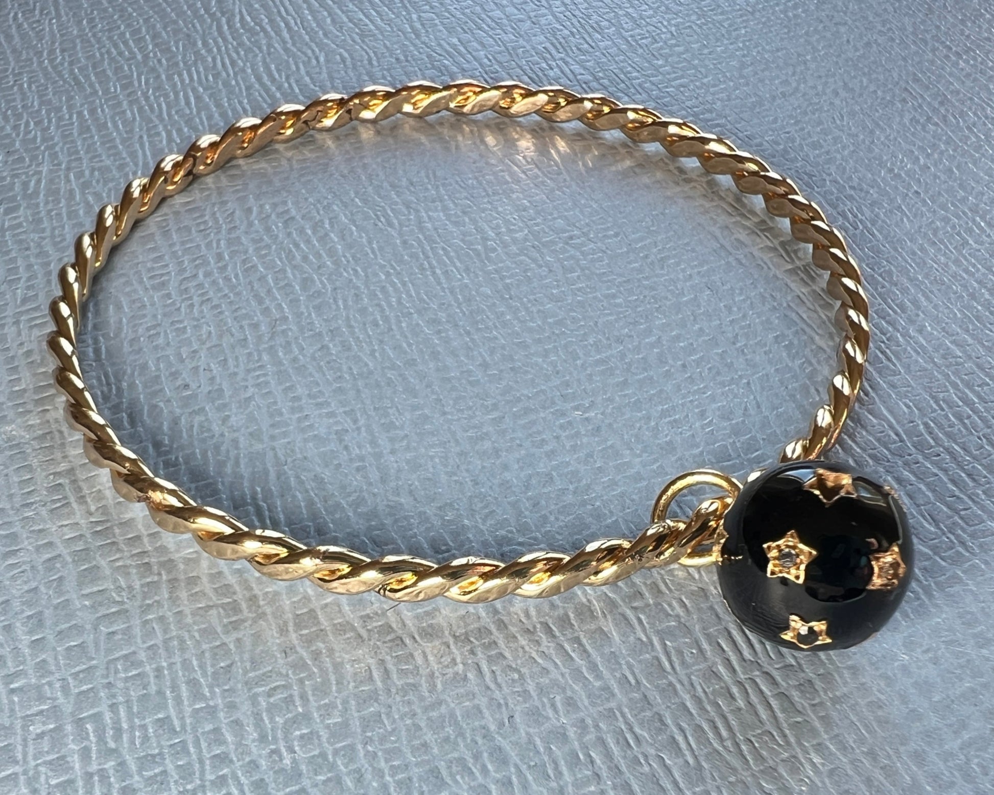 White and Black Diamond Dangling Sphere Bangle Black Enamel – 14K Gold Plate