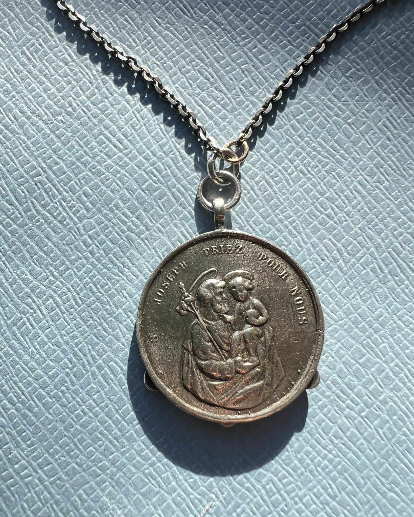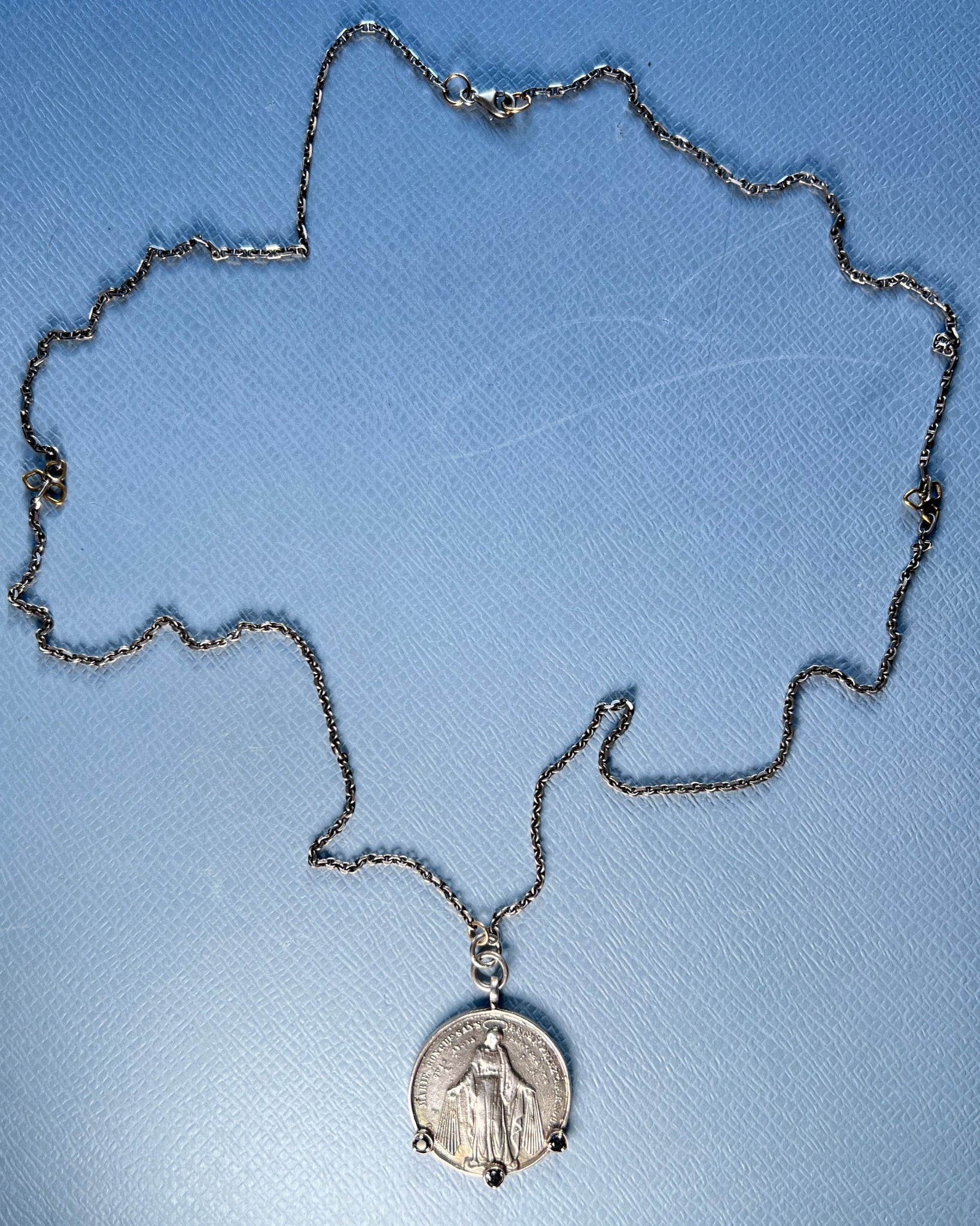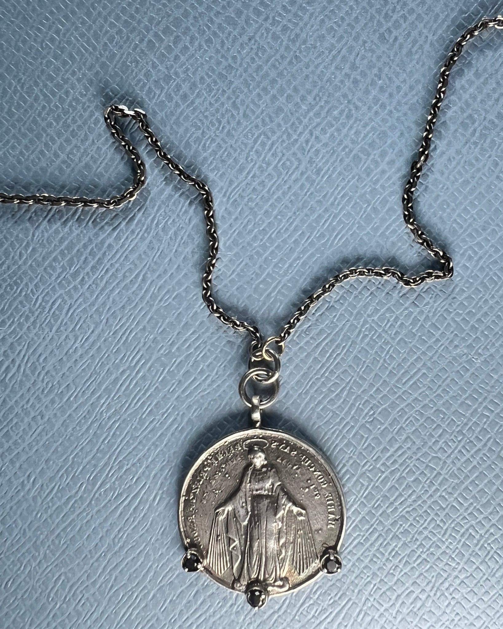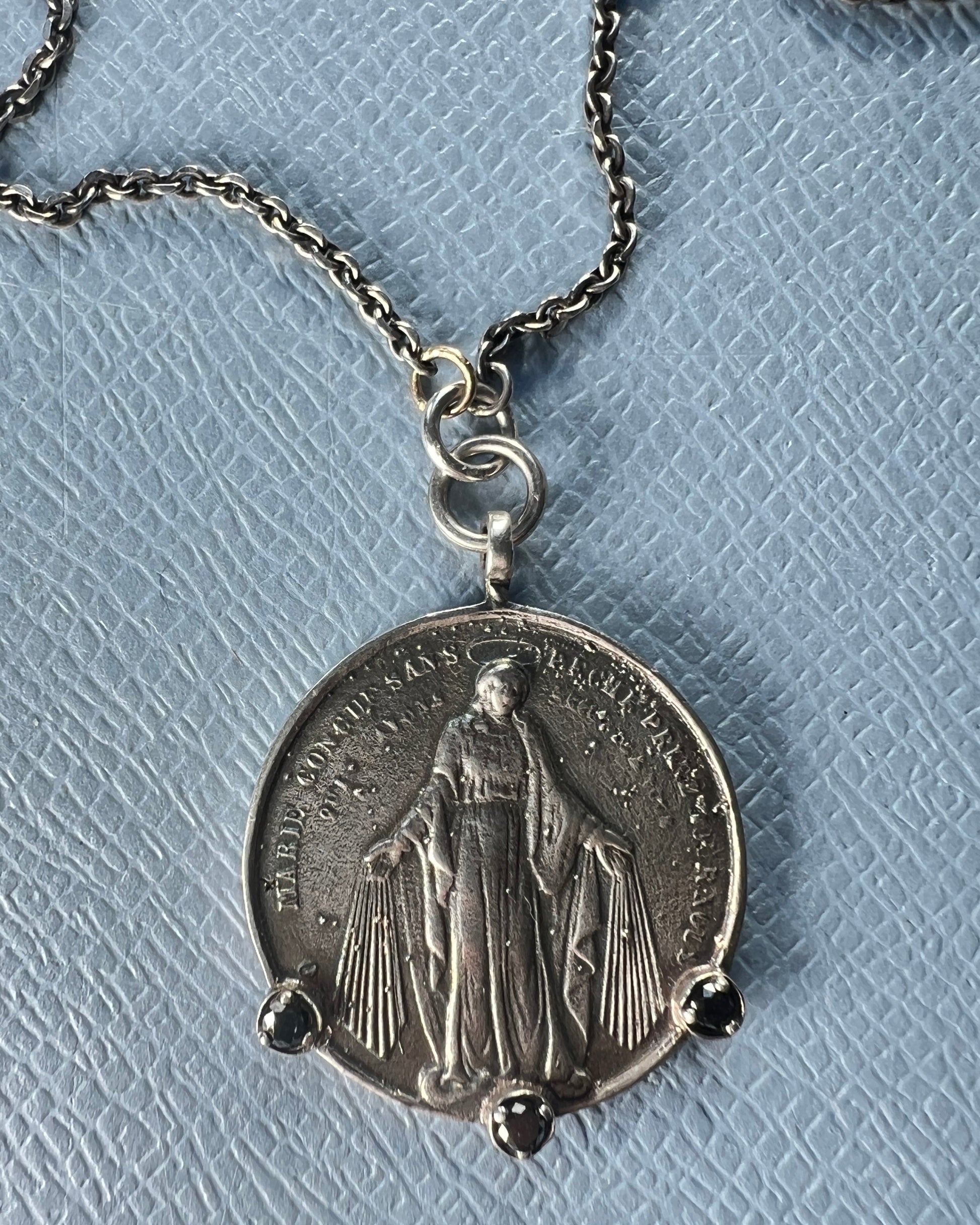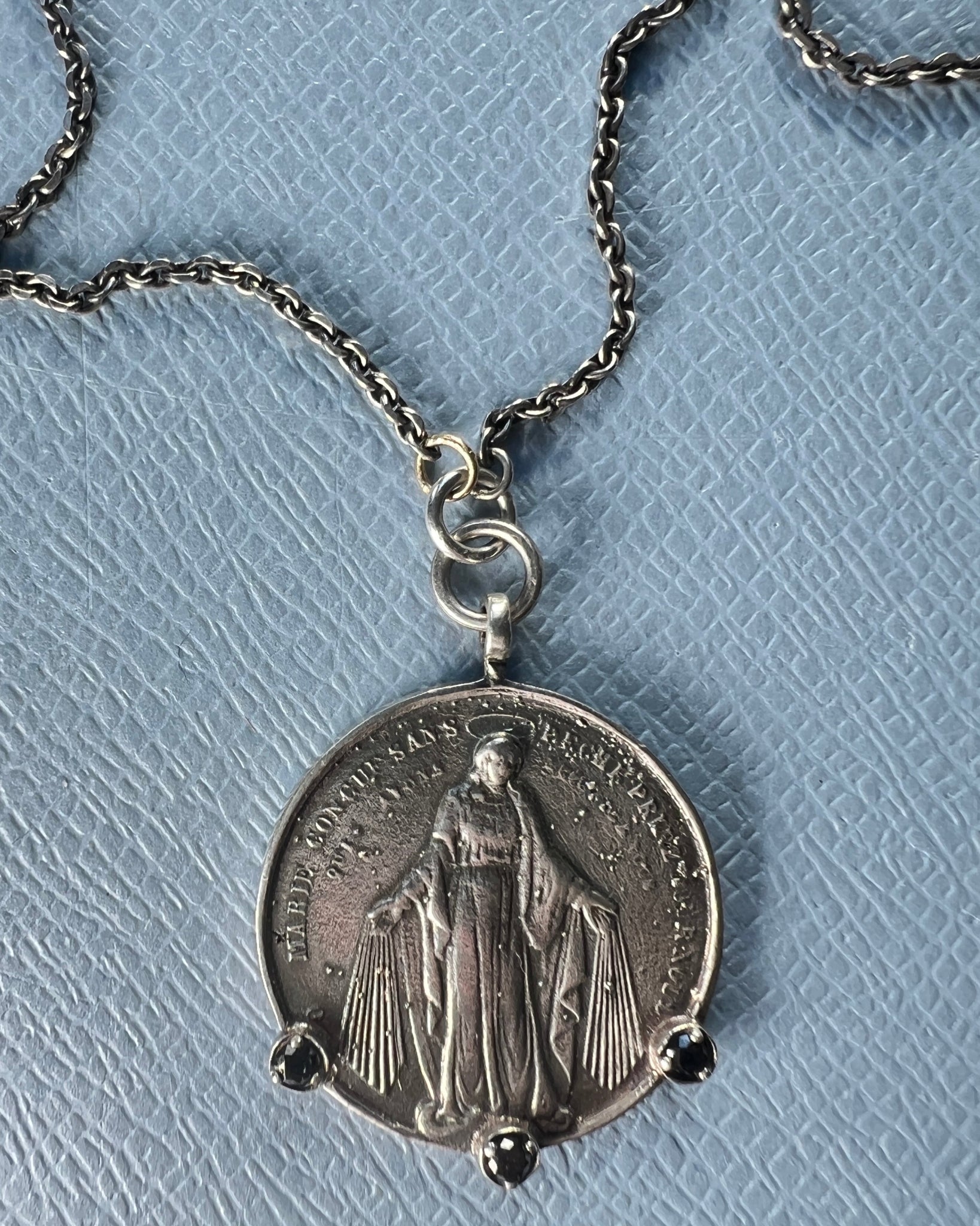 A Virgin Mary medal set with 3 Black Diamonds, pendant crafted from solid silver, paired with a VTG Silver J Dauphin chain