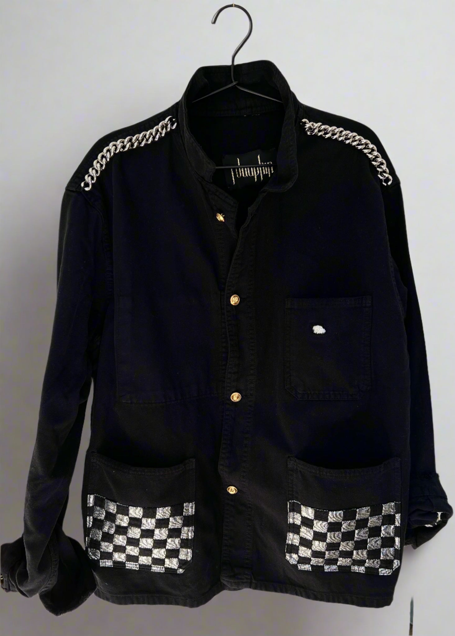 Black French Workwear Jacket – Silver Checker Fabric, Palladium Chain, Vintage Buttons