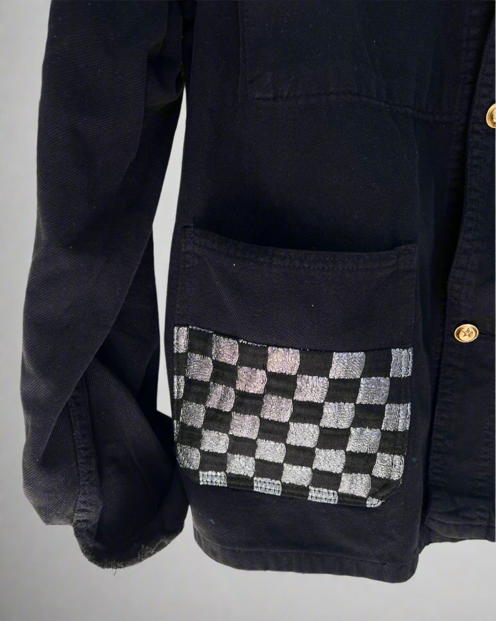 Original French workwear jacket, dyed Black. Embellished with lurex Checker Fabric in Silver and Black. Italian Palladium Platium Brass Chain, and vintage silver-plated brass buttons made in Paris.