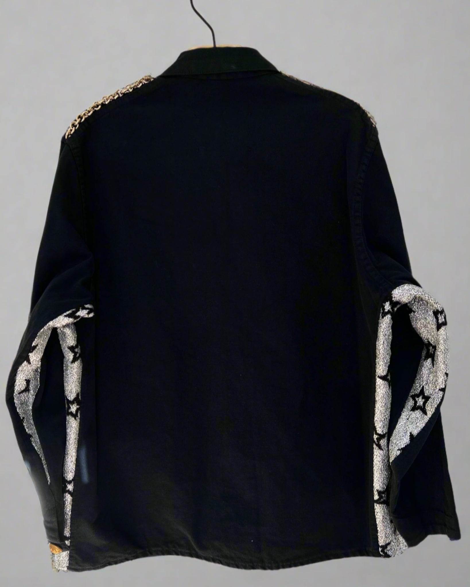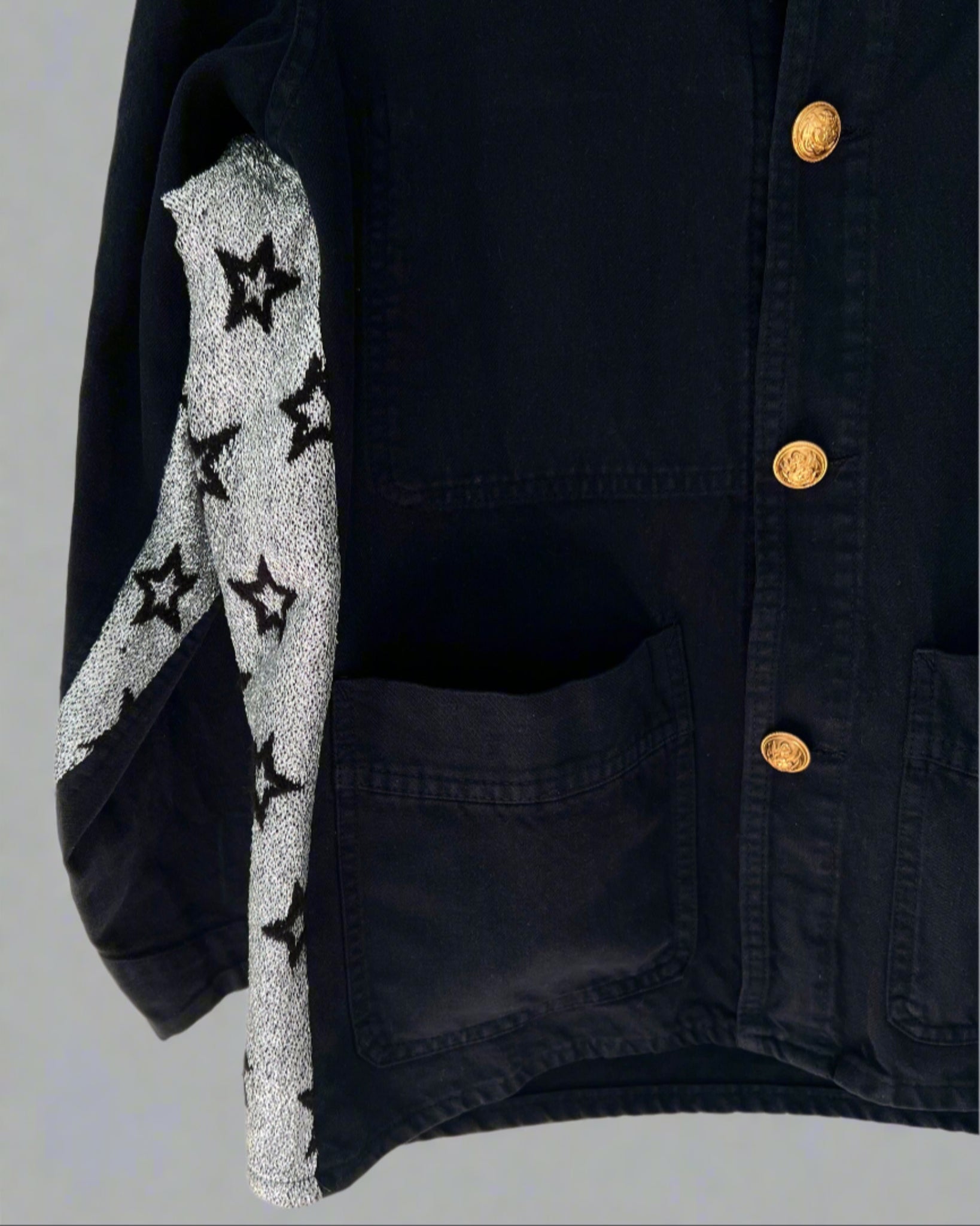 Repurposed Black French Workwear Jacket – Silver Lurex Star Fabric, Brass Chain, Vintage Buttons