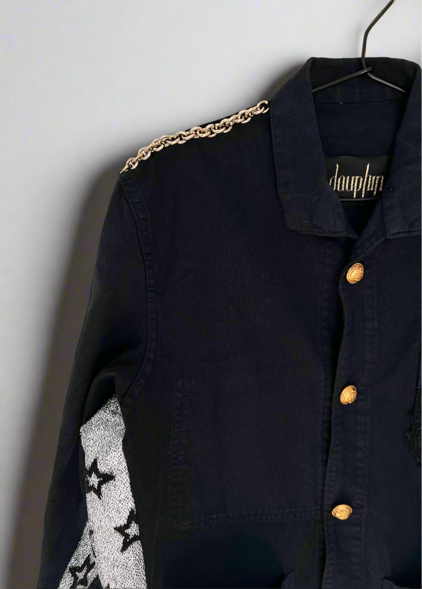 Original French workwear jacket, dyed Black. Embellished with side panels of French Silver lurex Star Fabric, Italian Brass Chain, and vintage Gold Plate Brass buttons made in Paris.