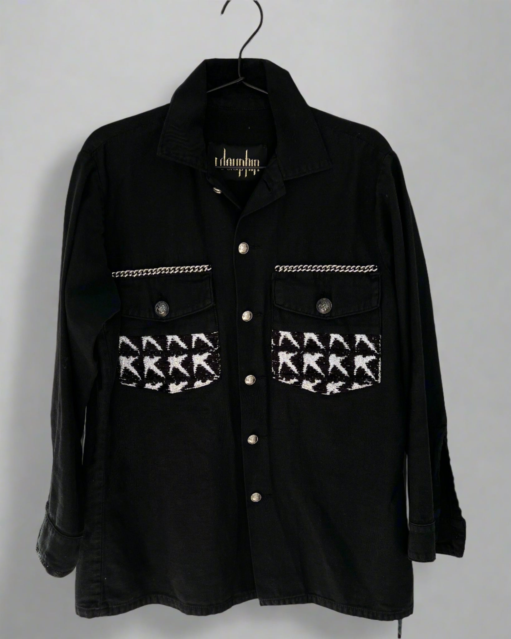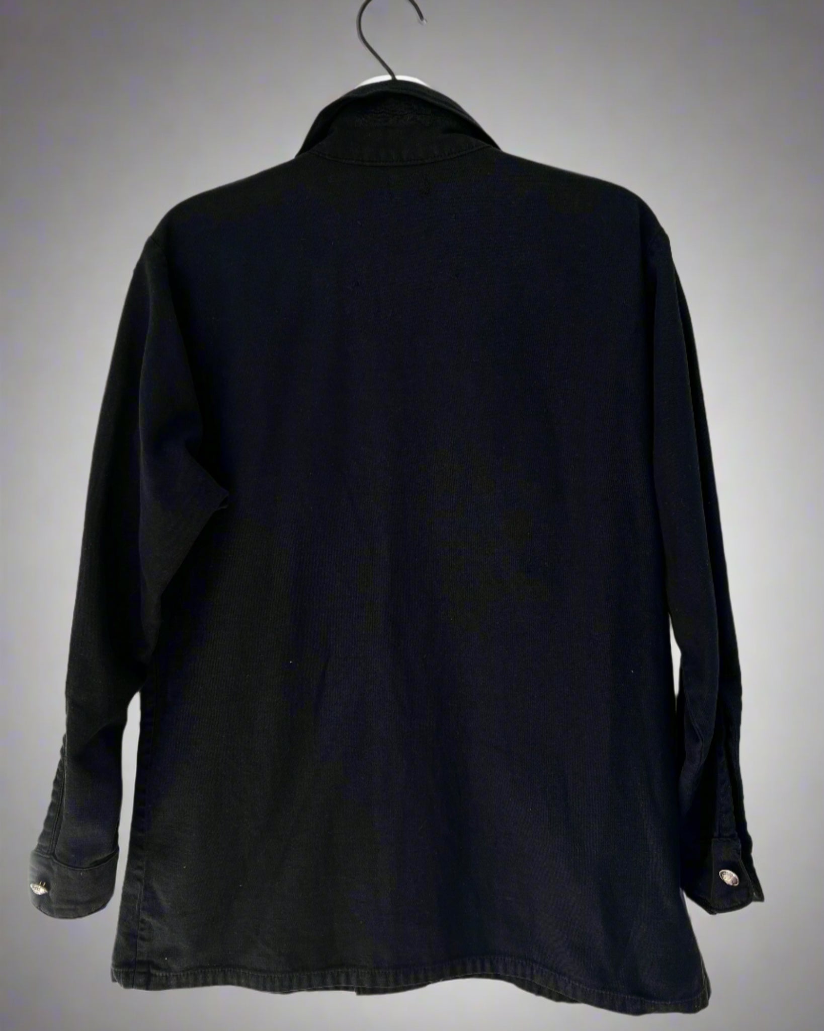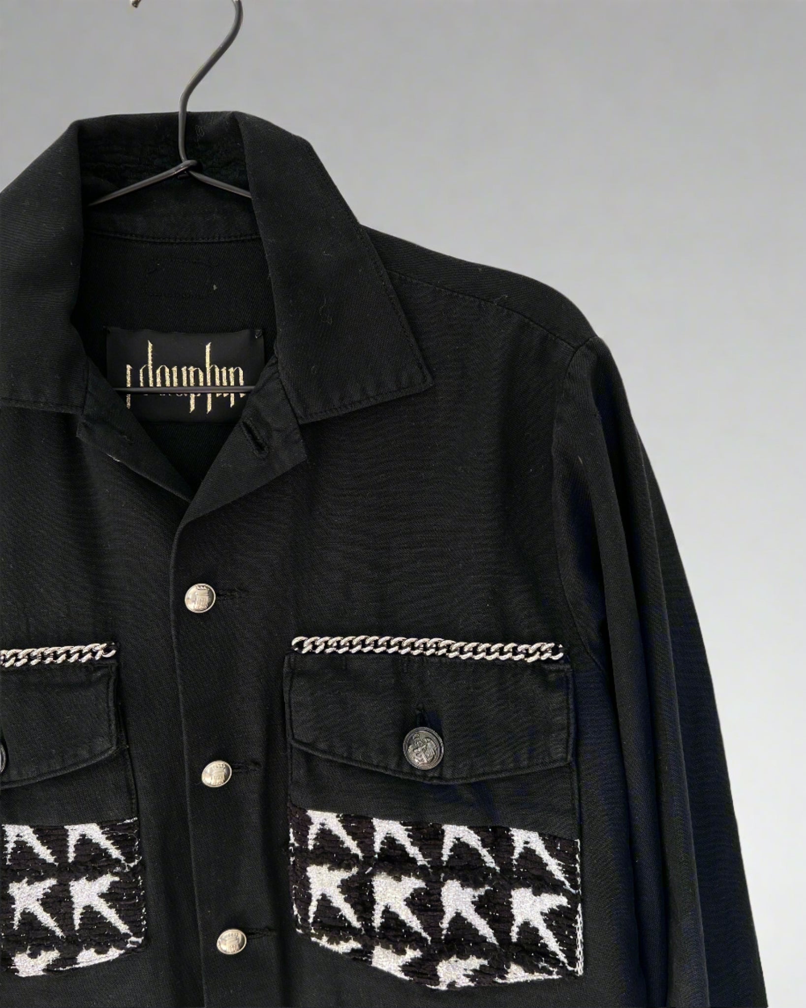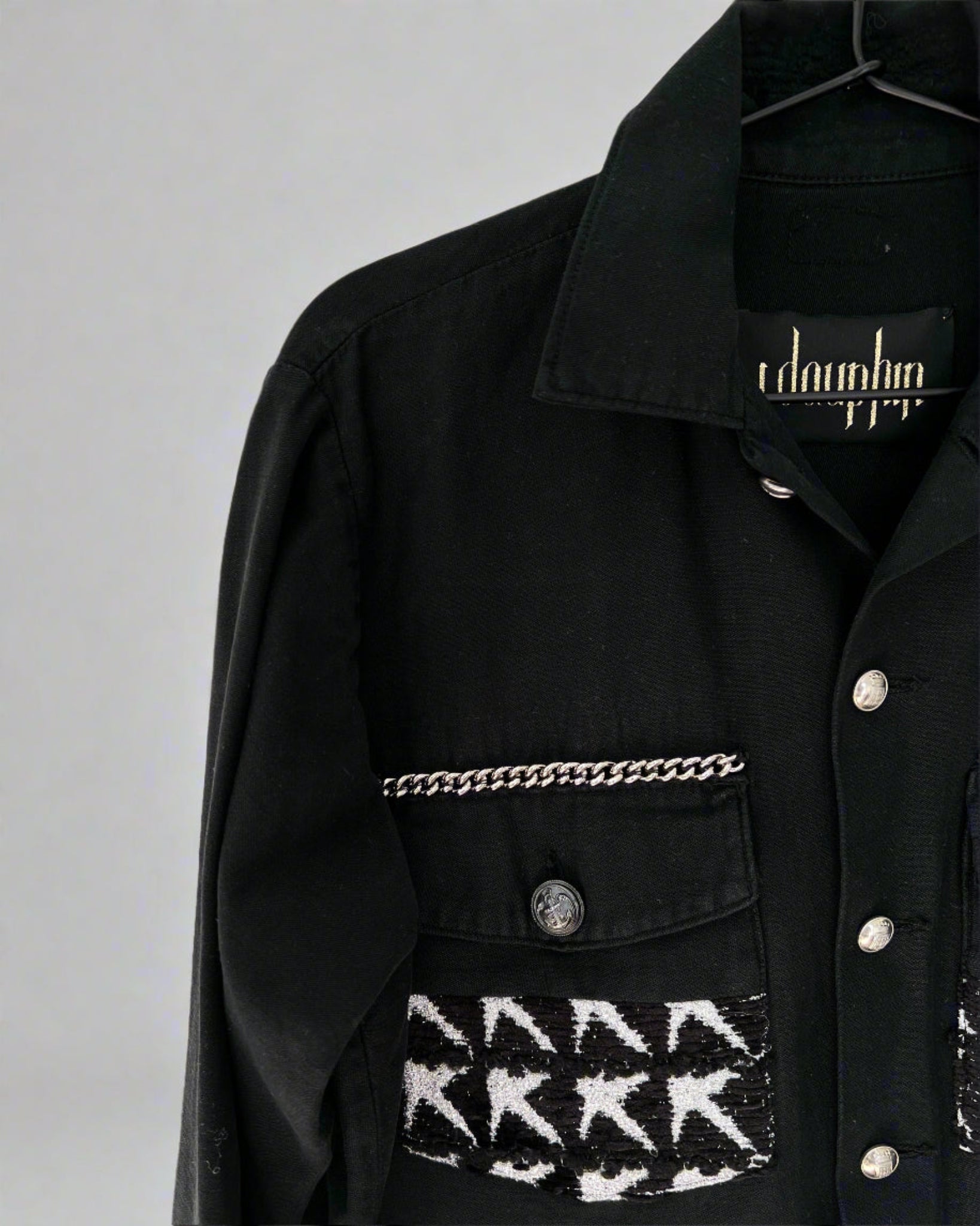 Original vintage military jacket, dyed black and reimagined with French Black Star Tweed Pockets and Palladium Plated Chains above pockets. Made in cotton, with vintage gold-tone brass buttons crafted in Paris.