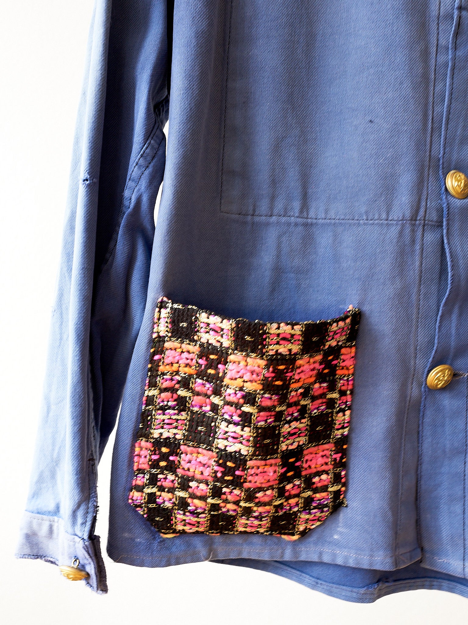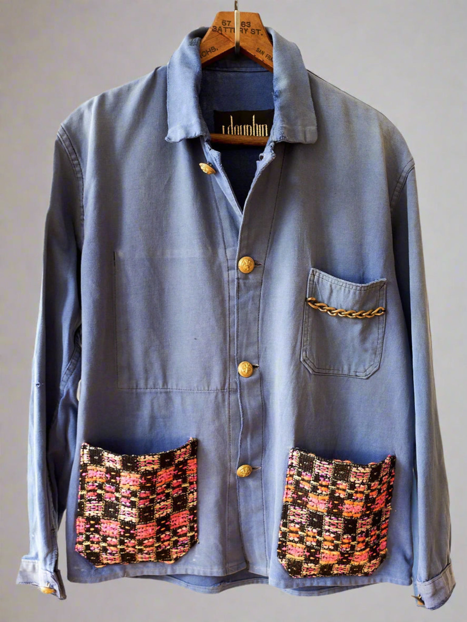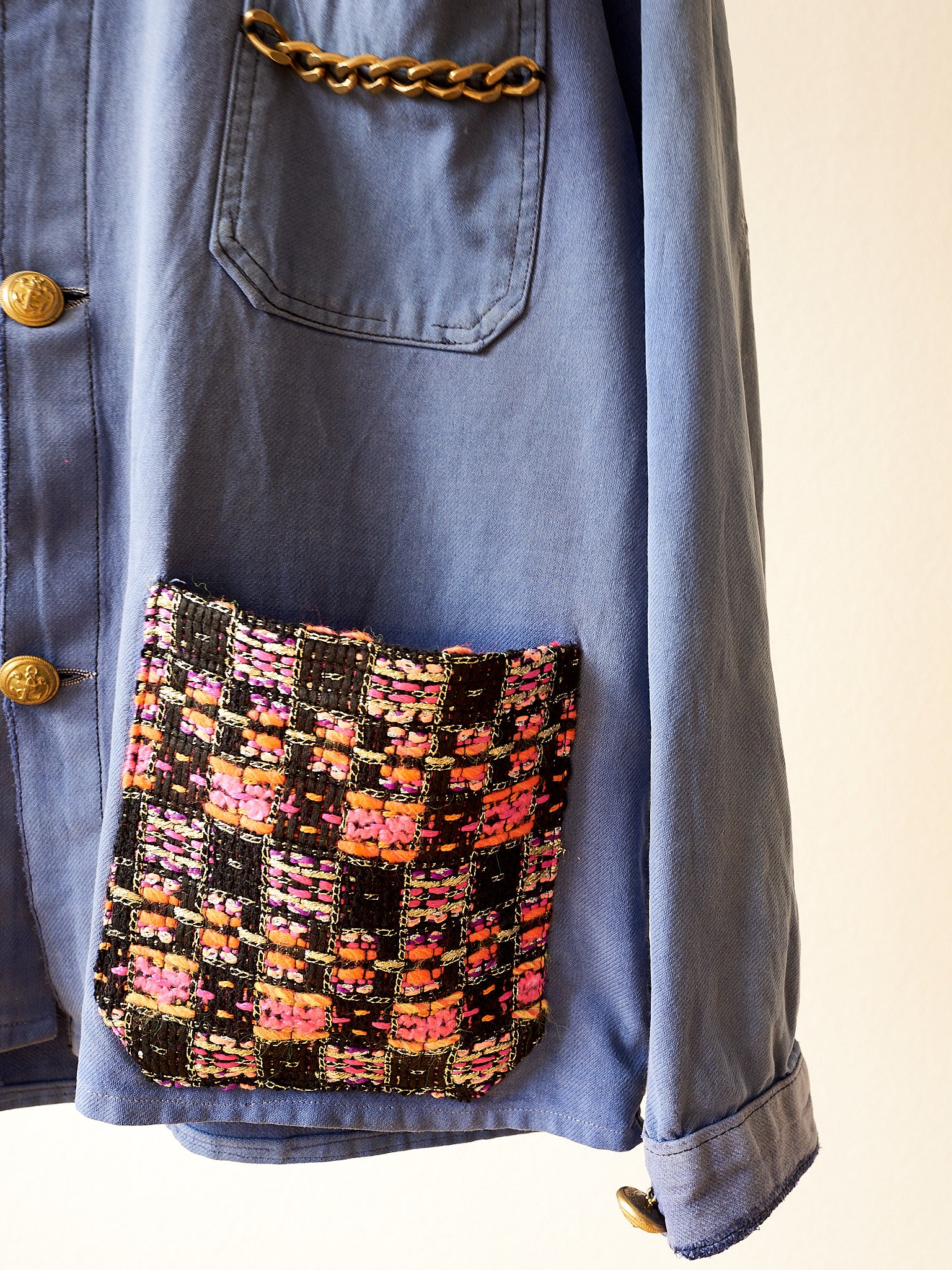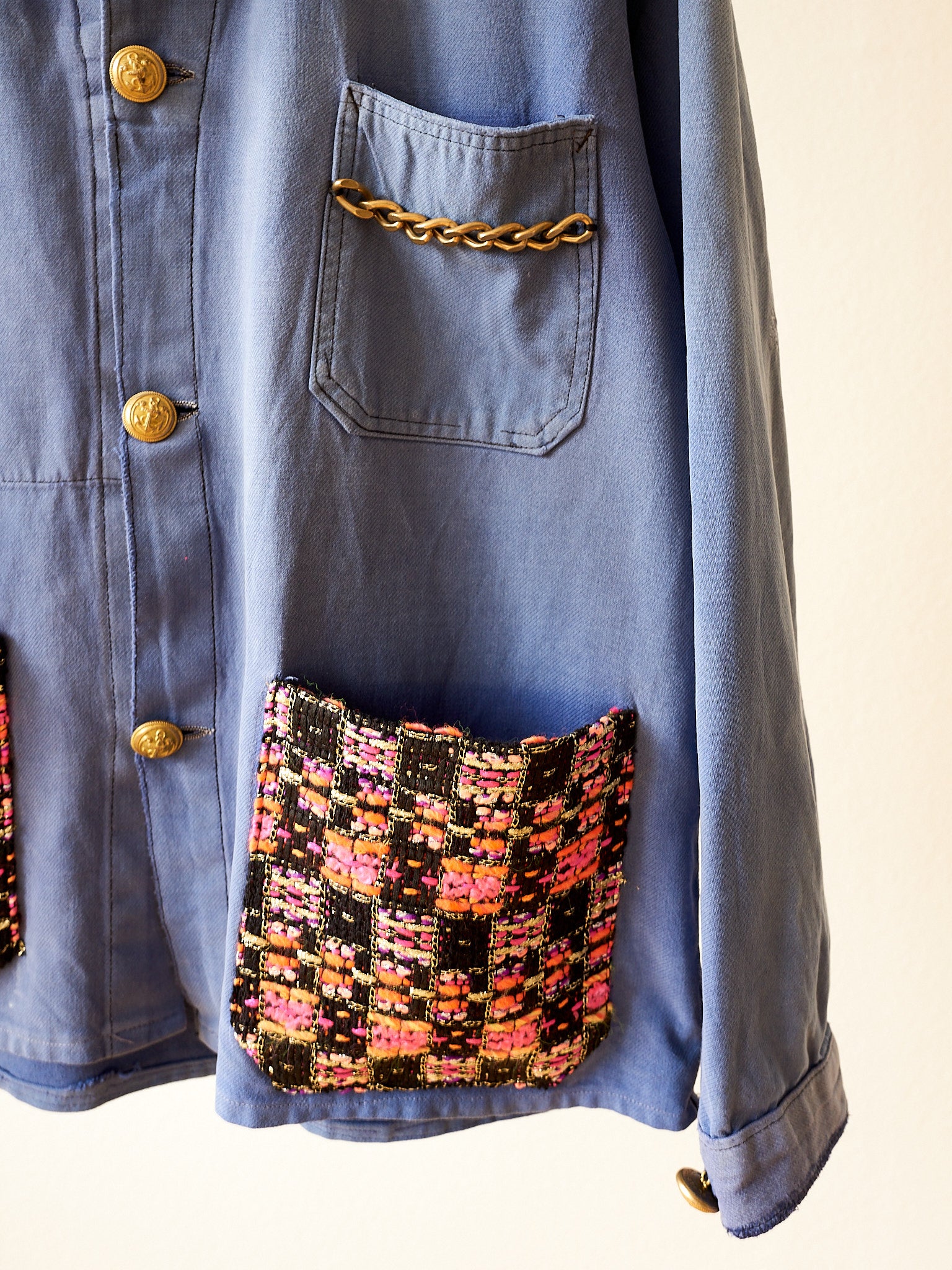 Original 1960s French workwear jacket in distressed blue cotton, reimagined with pink, orange, and gold-black tweed detailing. Embellished with brass chain accents and finished with vintage gold-tone brass buttons made in Paris.