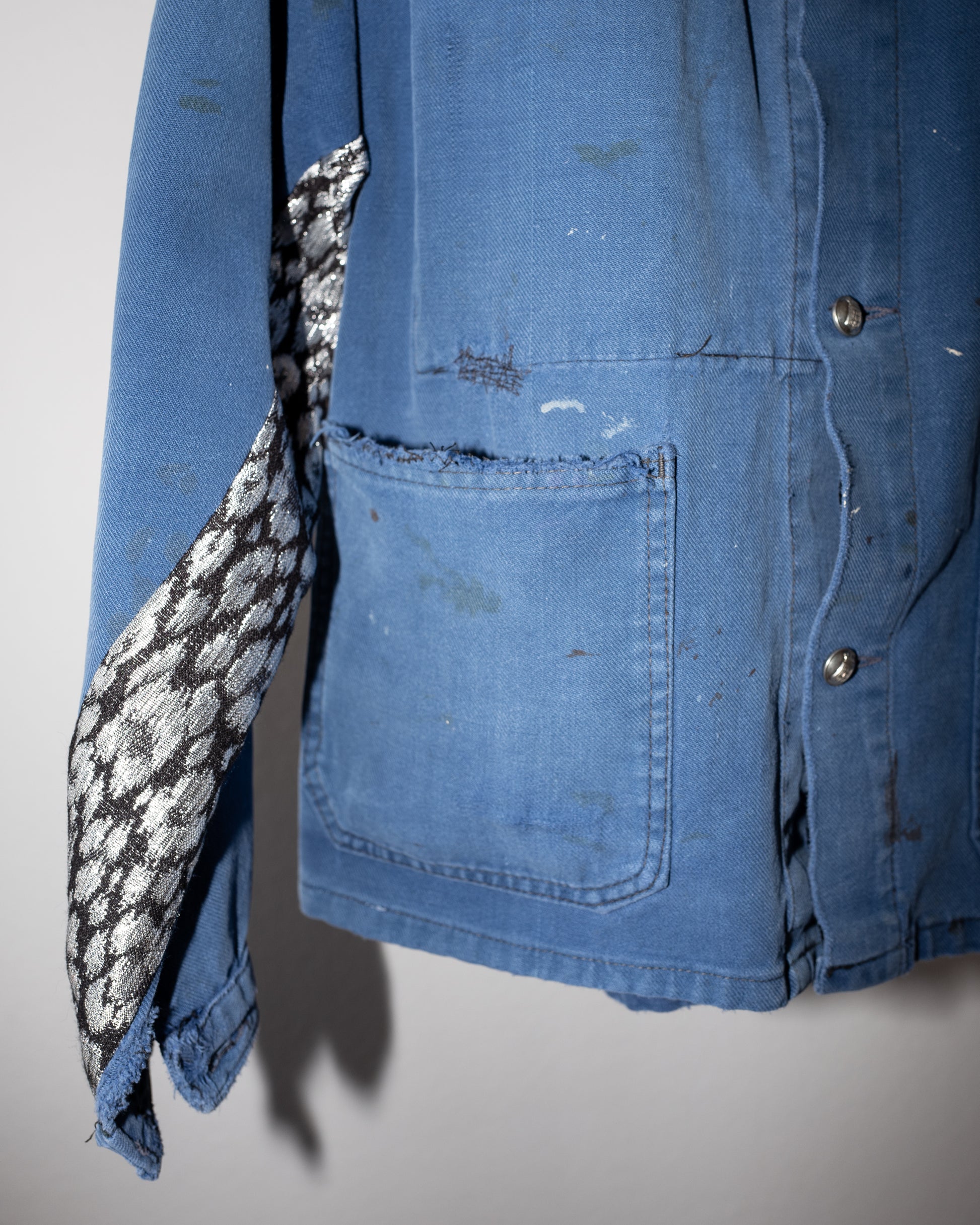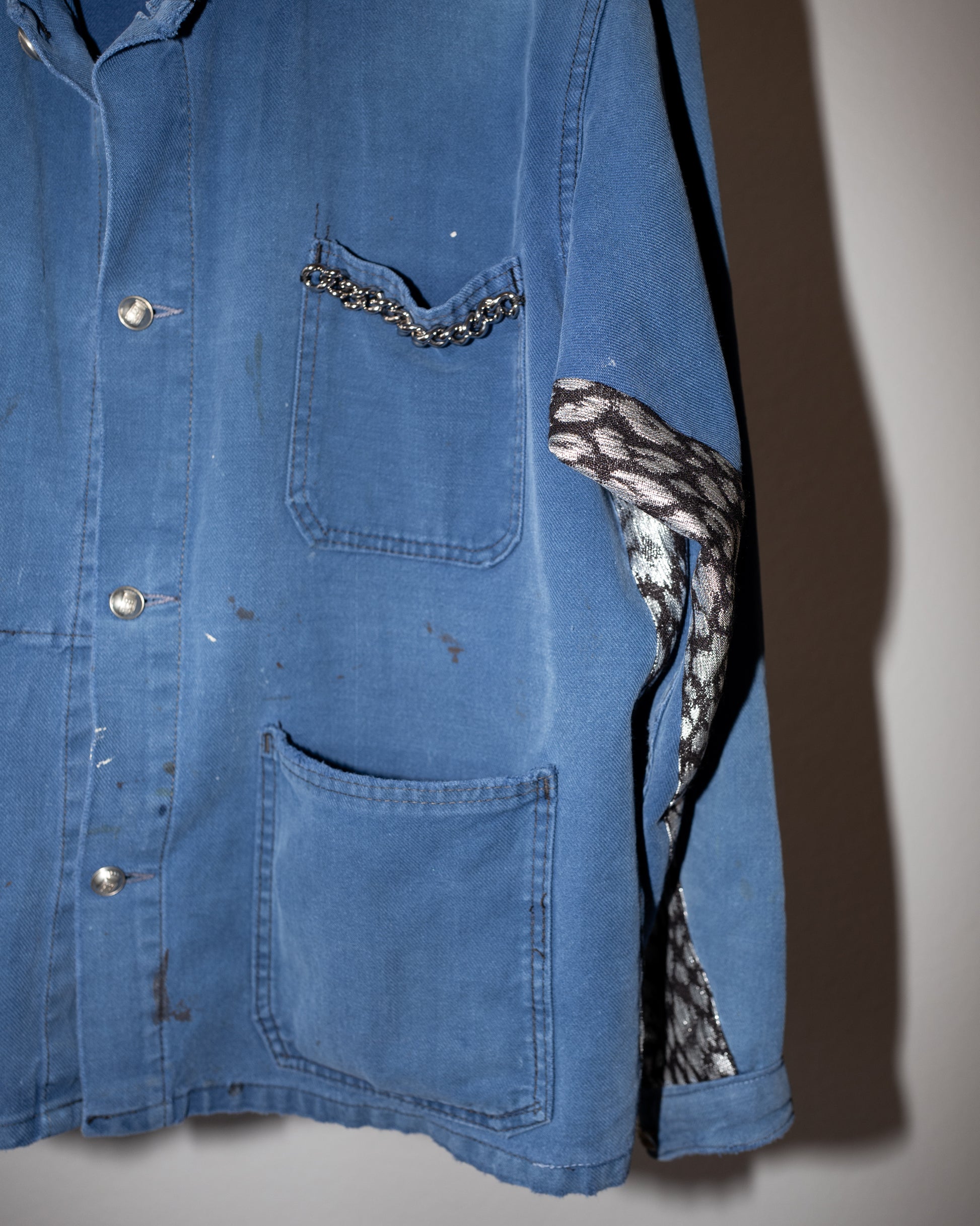 Our one of a kind, zero waste, up-cycled jackets are made from vintage, natural fibers, military clothing and french workwear from the period 1940-1970's. We then repurpose and embellish with the finest details of intricate precious Italian and French designer tweeds, antique fringes and braids and vintage military buttons,