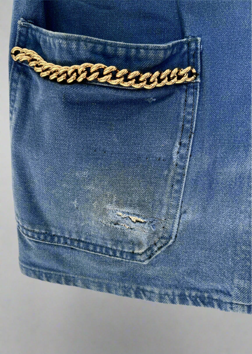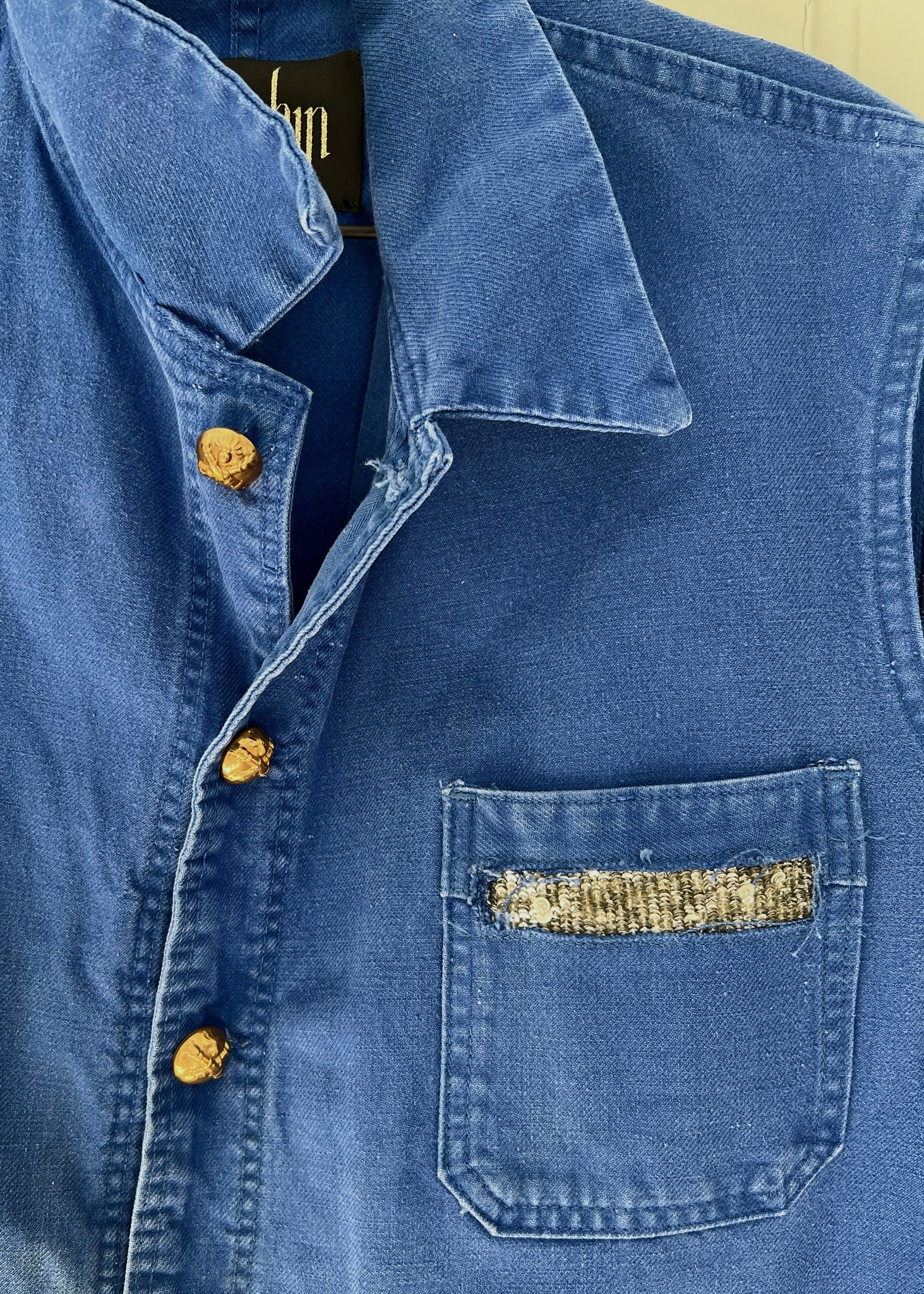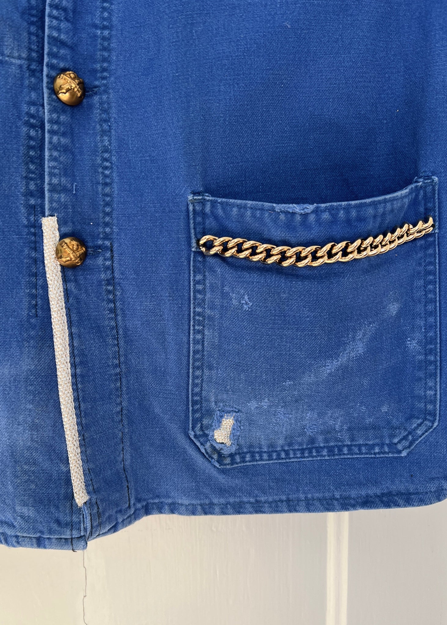 Original 1970s French workwear jacket, sleeveless and dyed cobalt blue, made from natural distressed cotton. Embellished with chain details, silver fabric accents, and vintage military buttons in gold-tone brass, made in Paris.