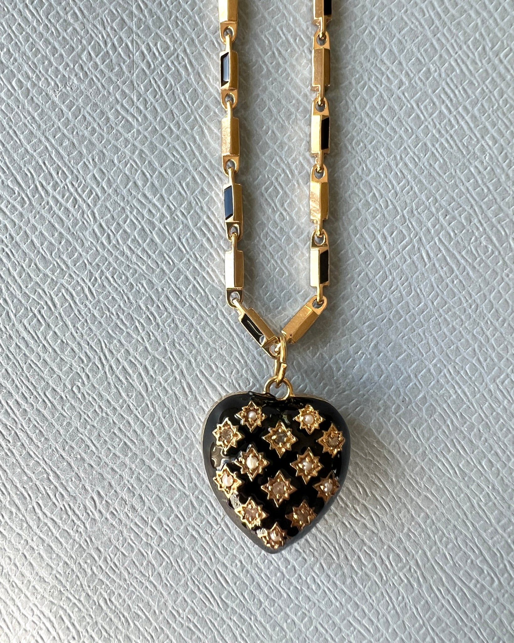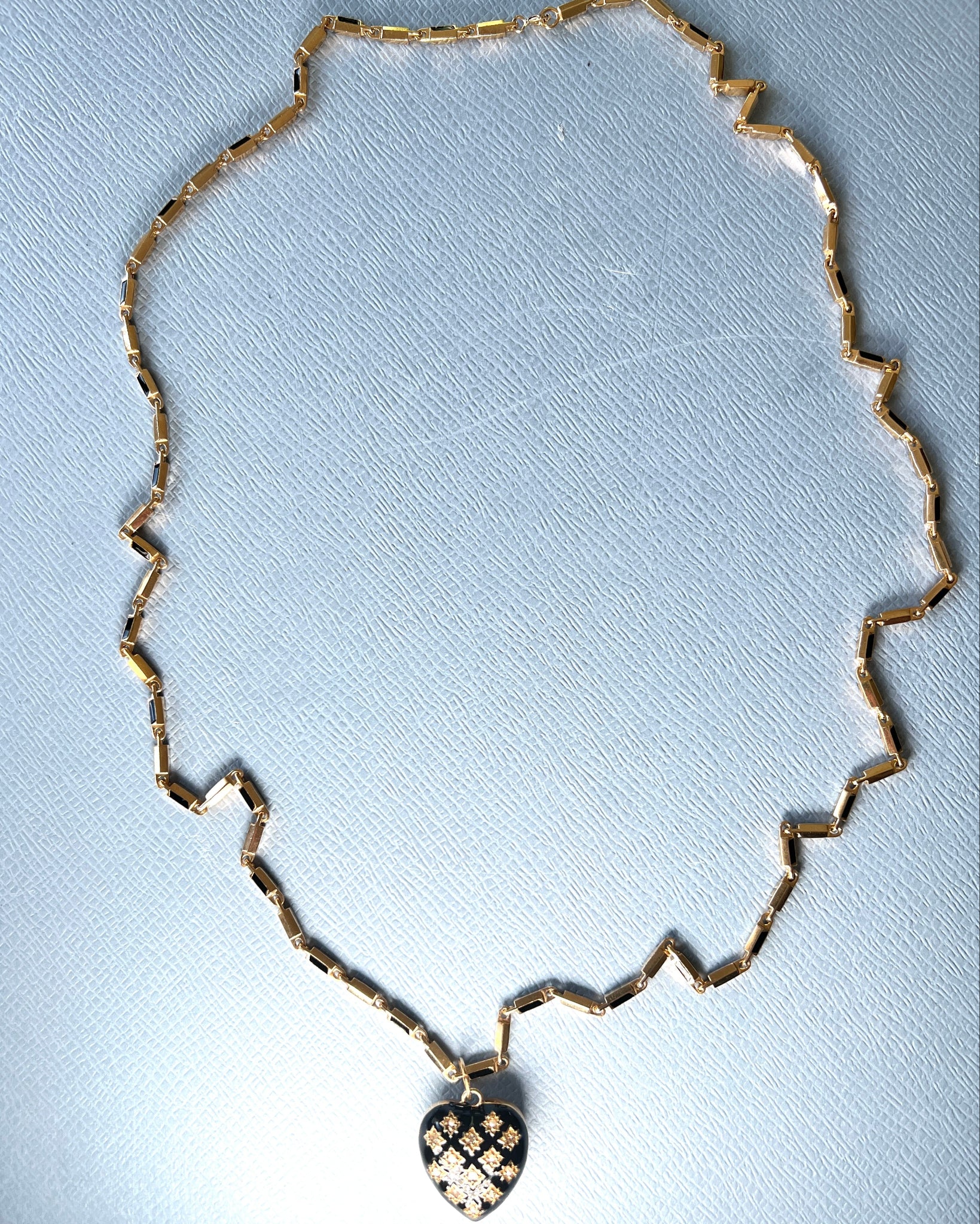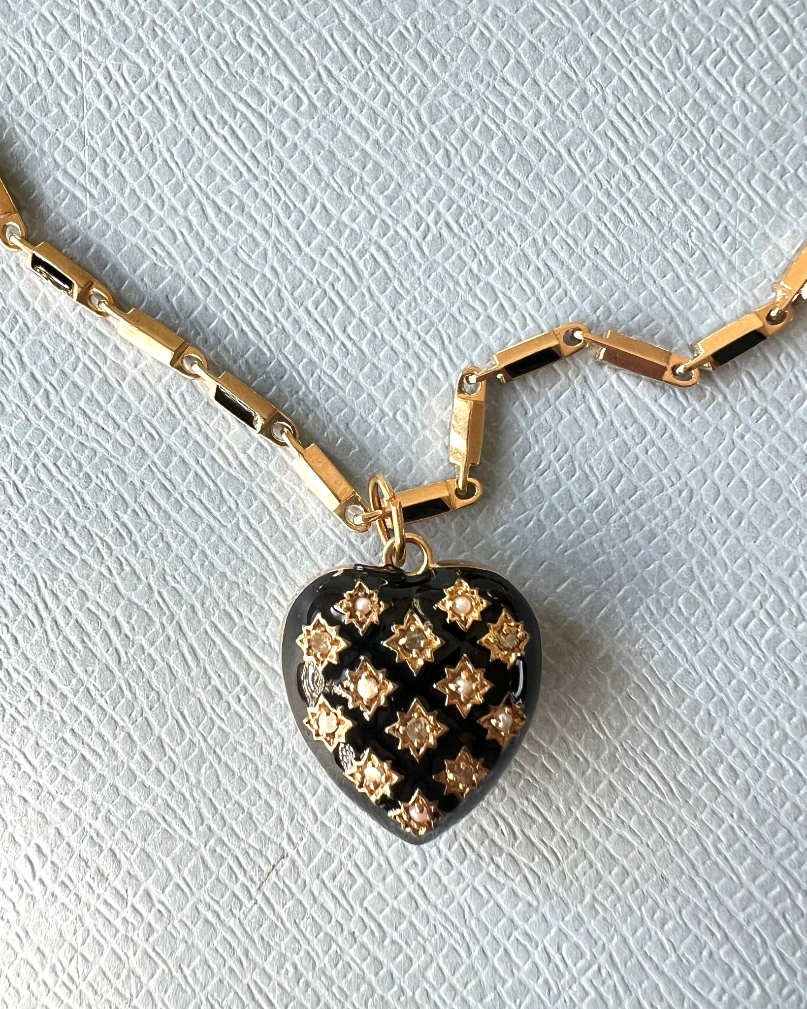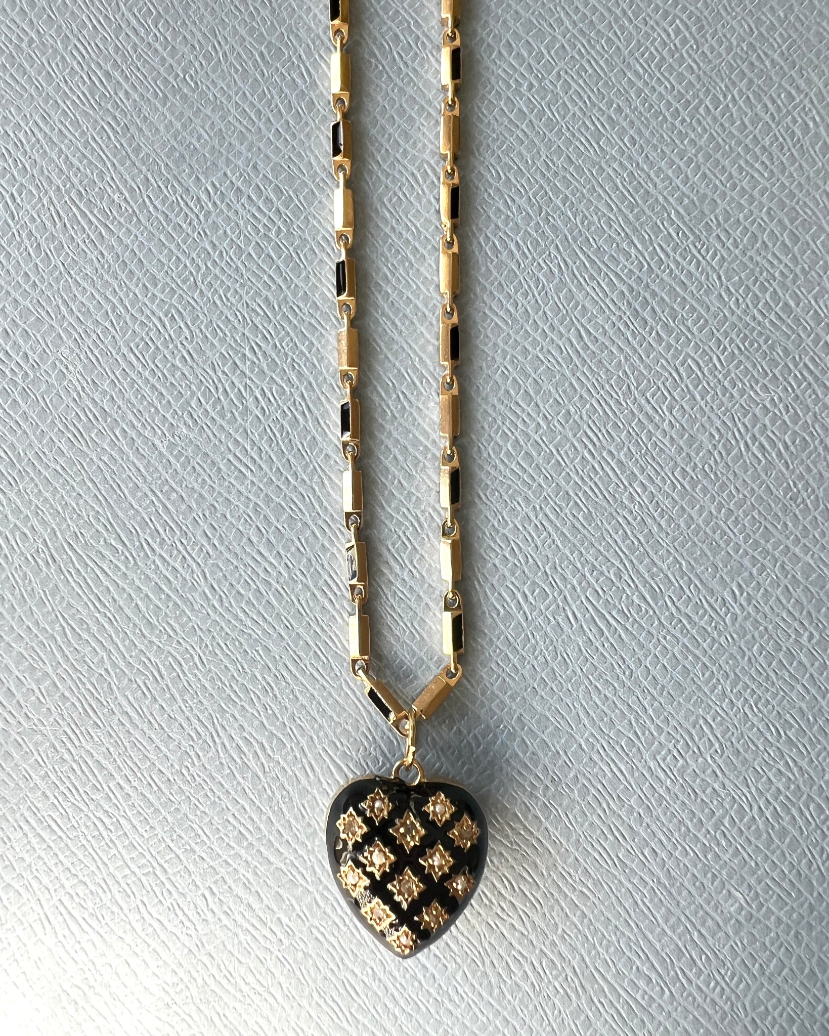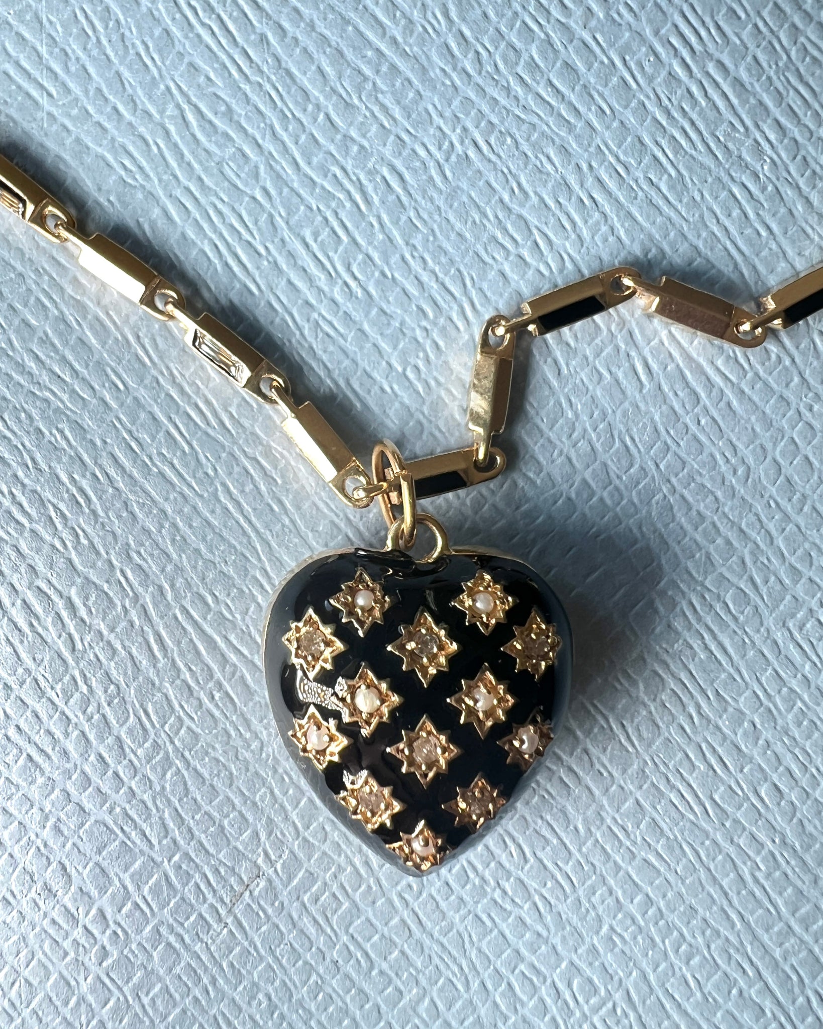 Diamond Pearl Heart Black Enamel Pendant – 14K Gold Plated Silver Hand Painted Enamel Chain