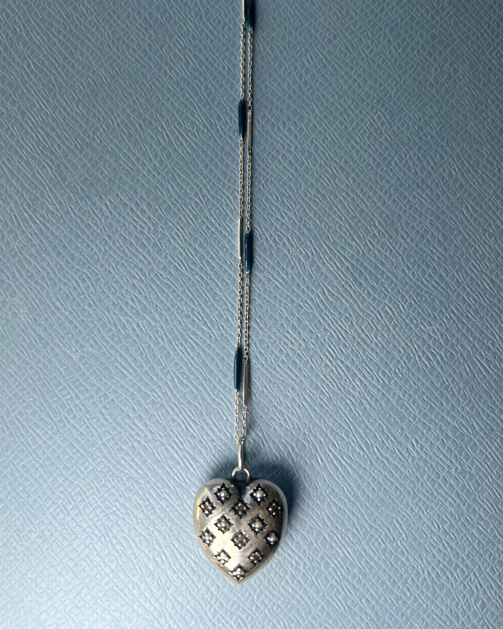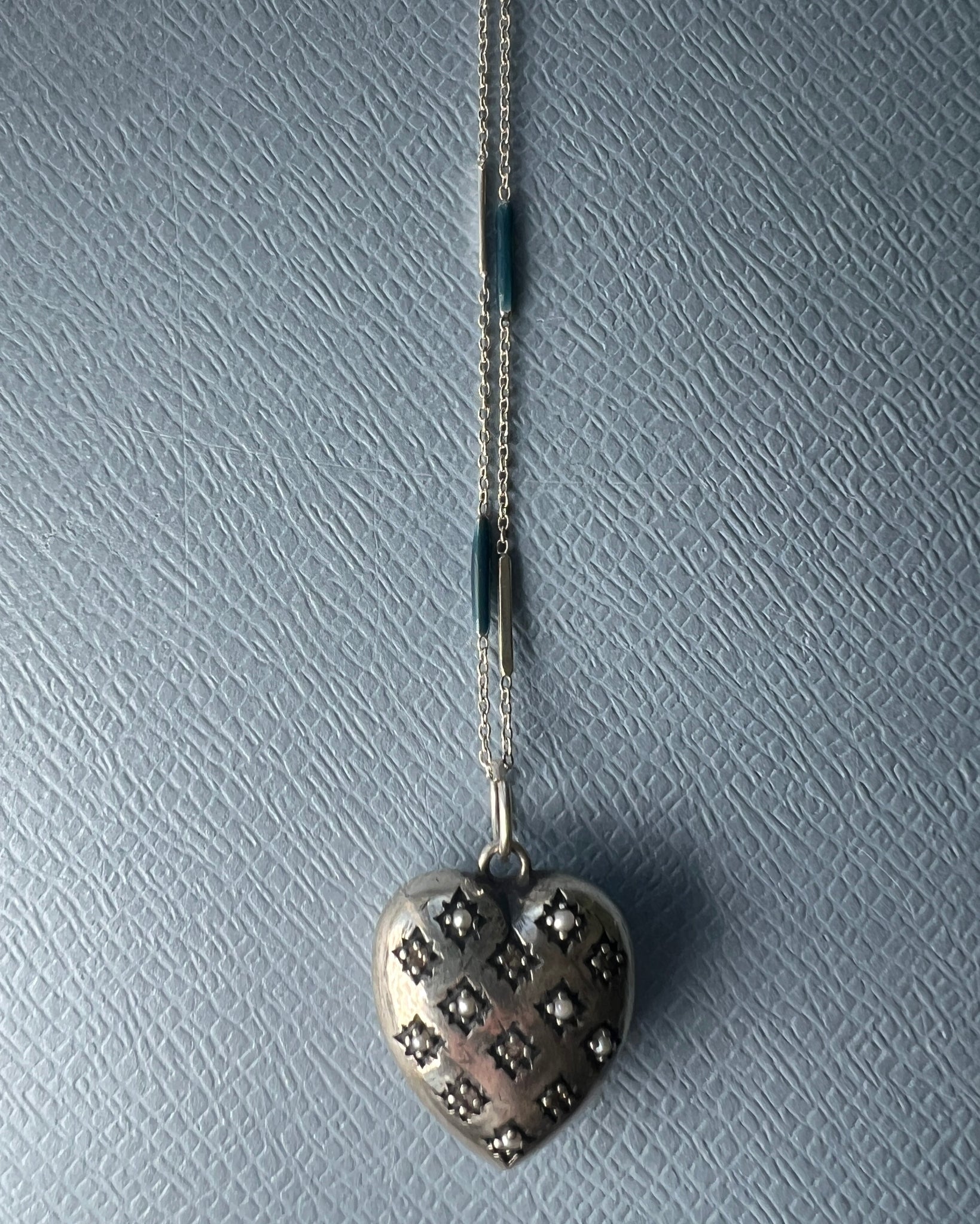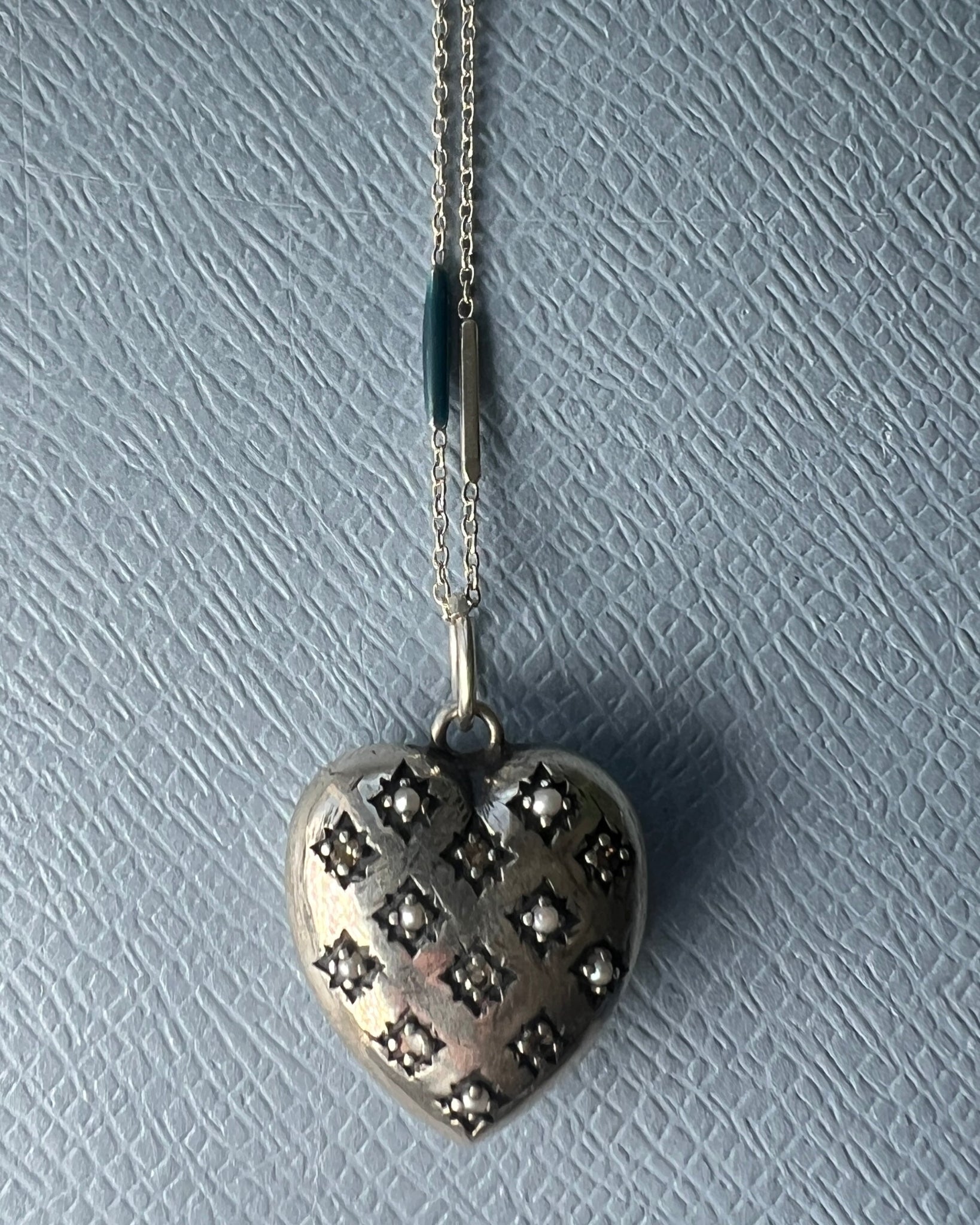 Diamond Pearl Heart Silver Pendant – Vintage Enamel Silver Chain