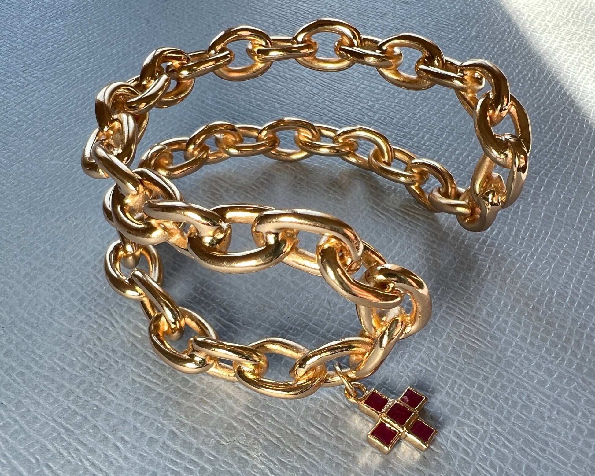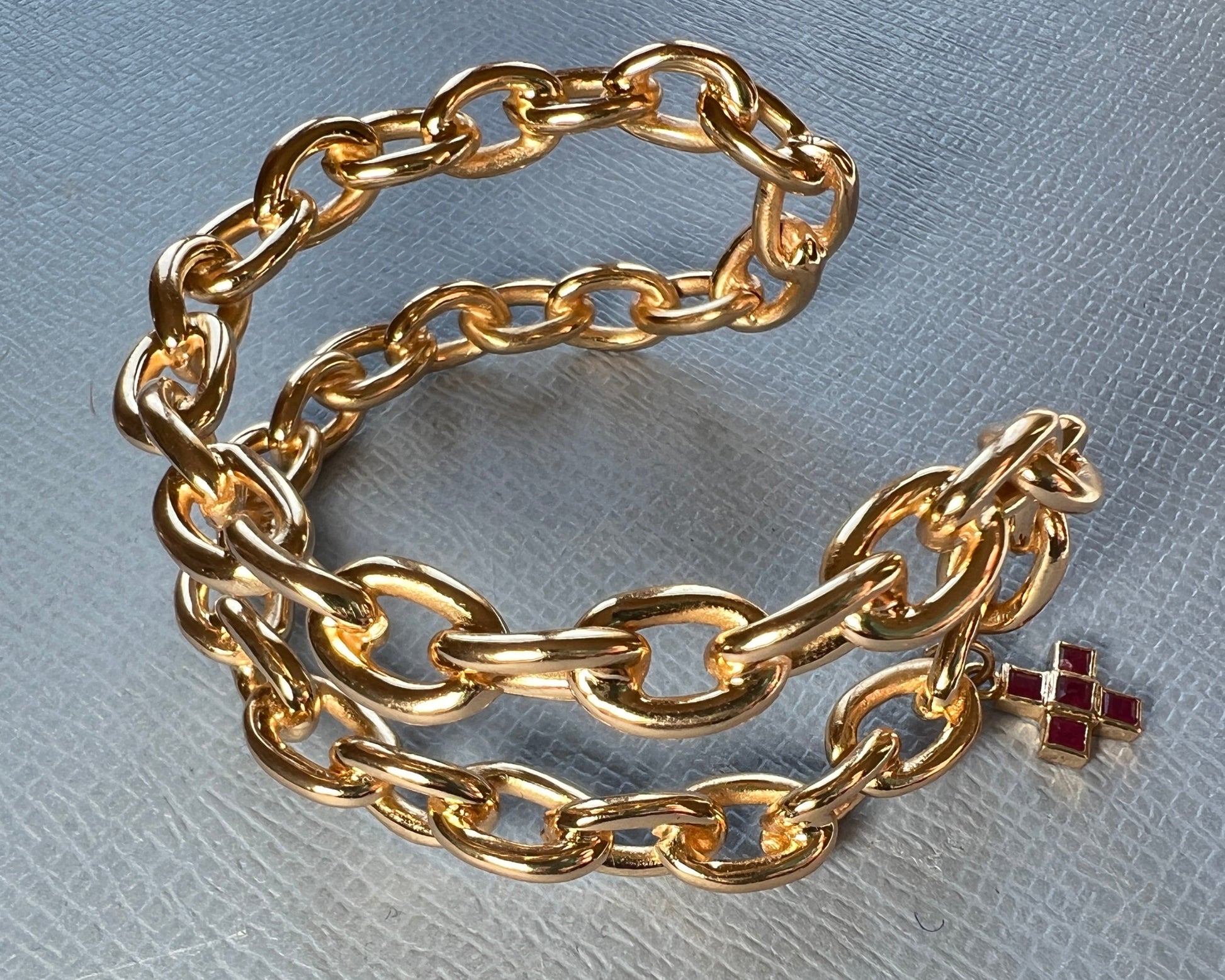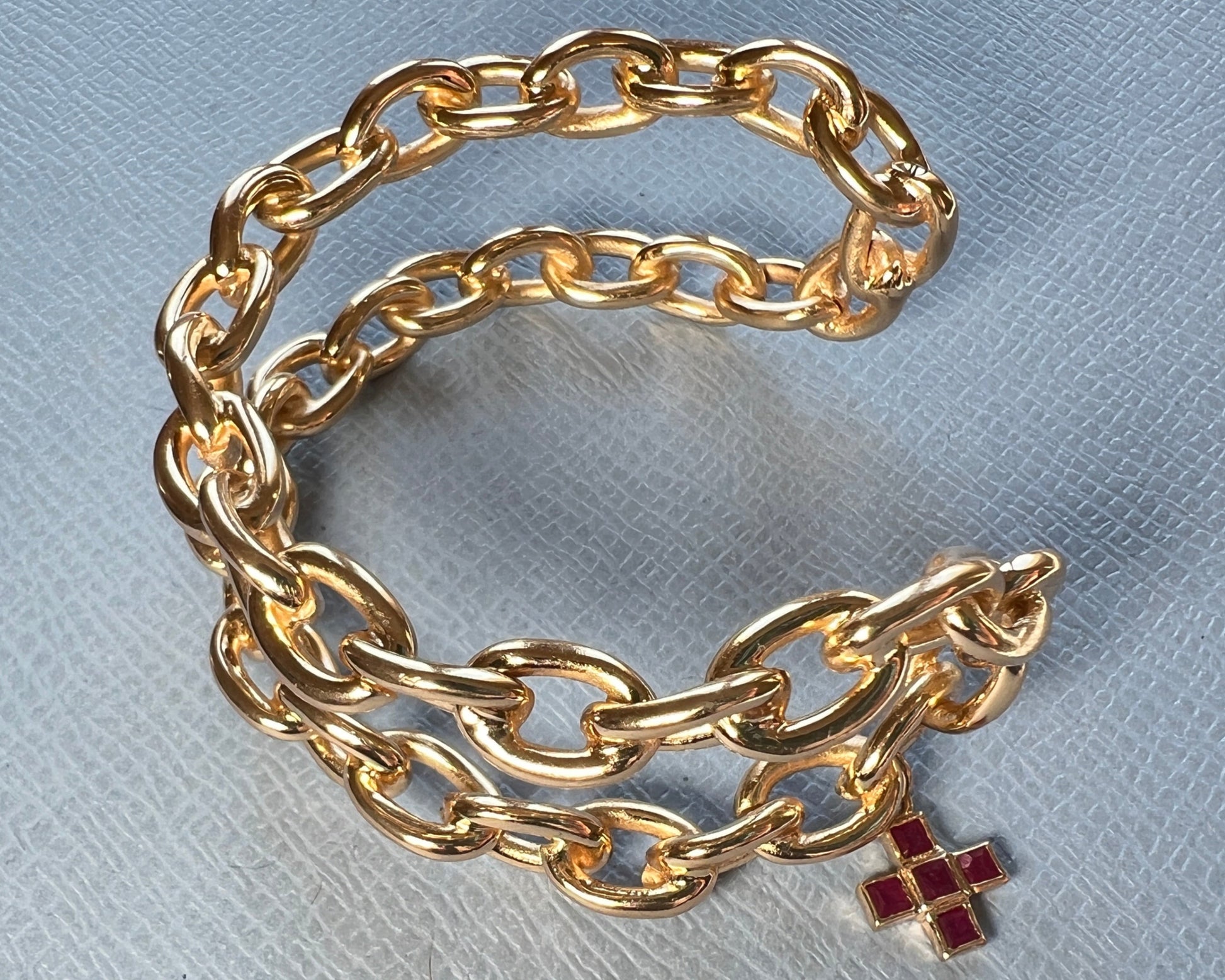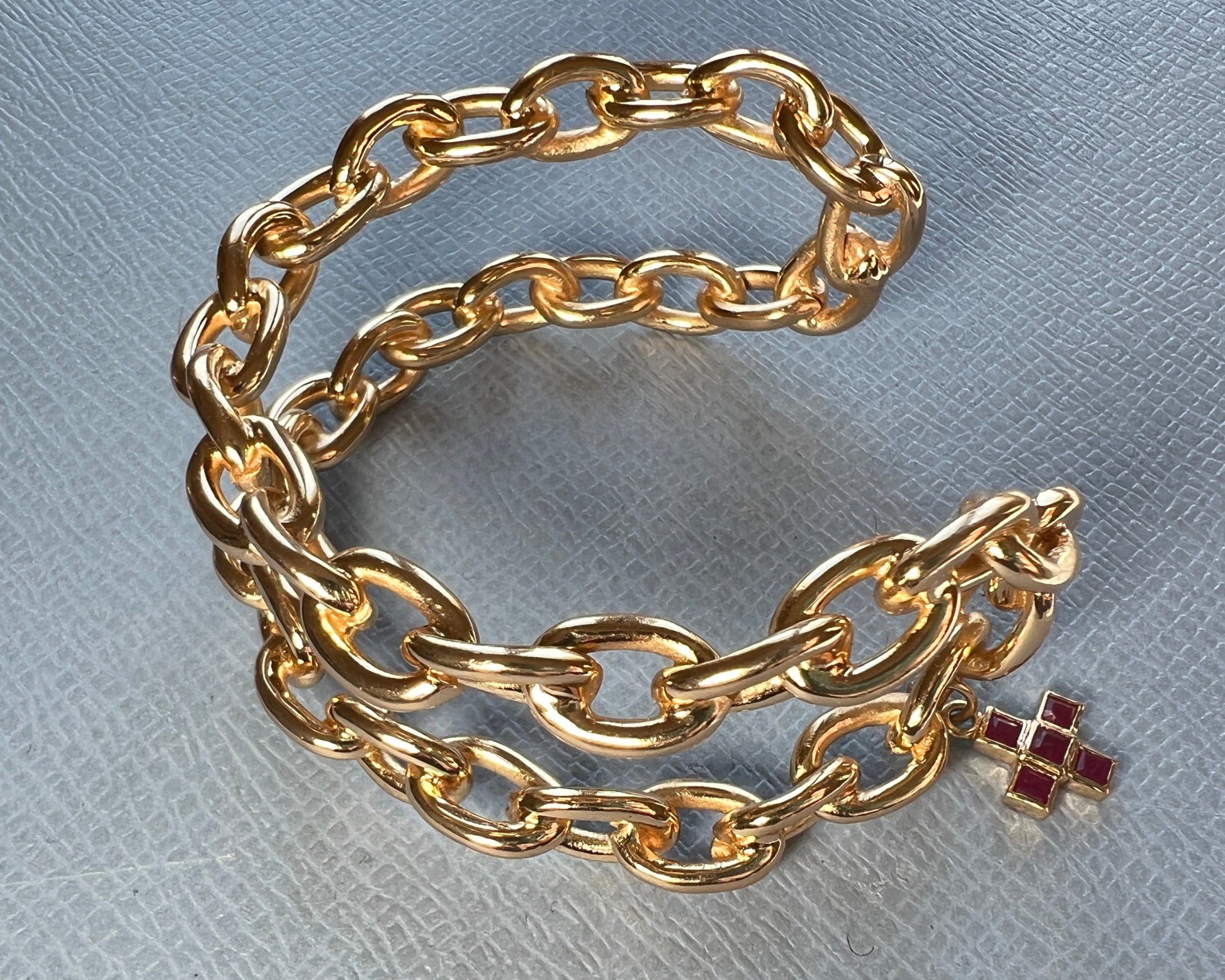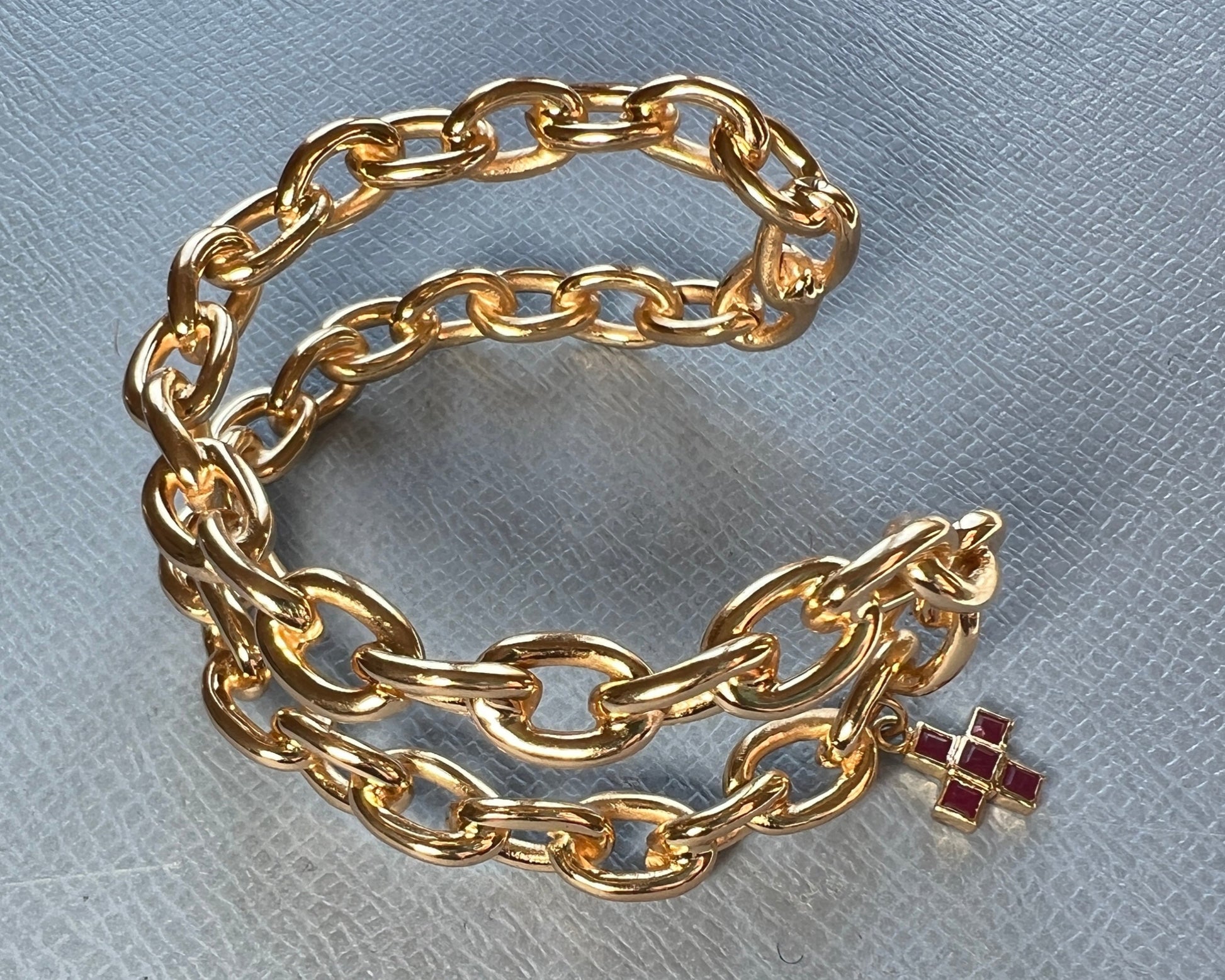 Double Chain Cuff Bracelet Ruby Cross with a dangling Ruby Cross, 14K gold-plated brass.