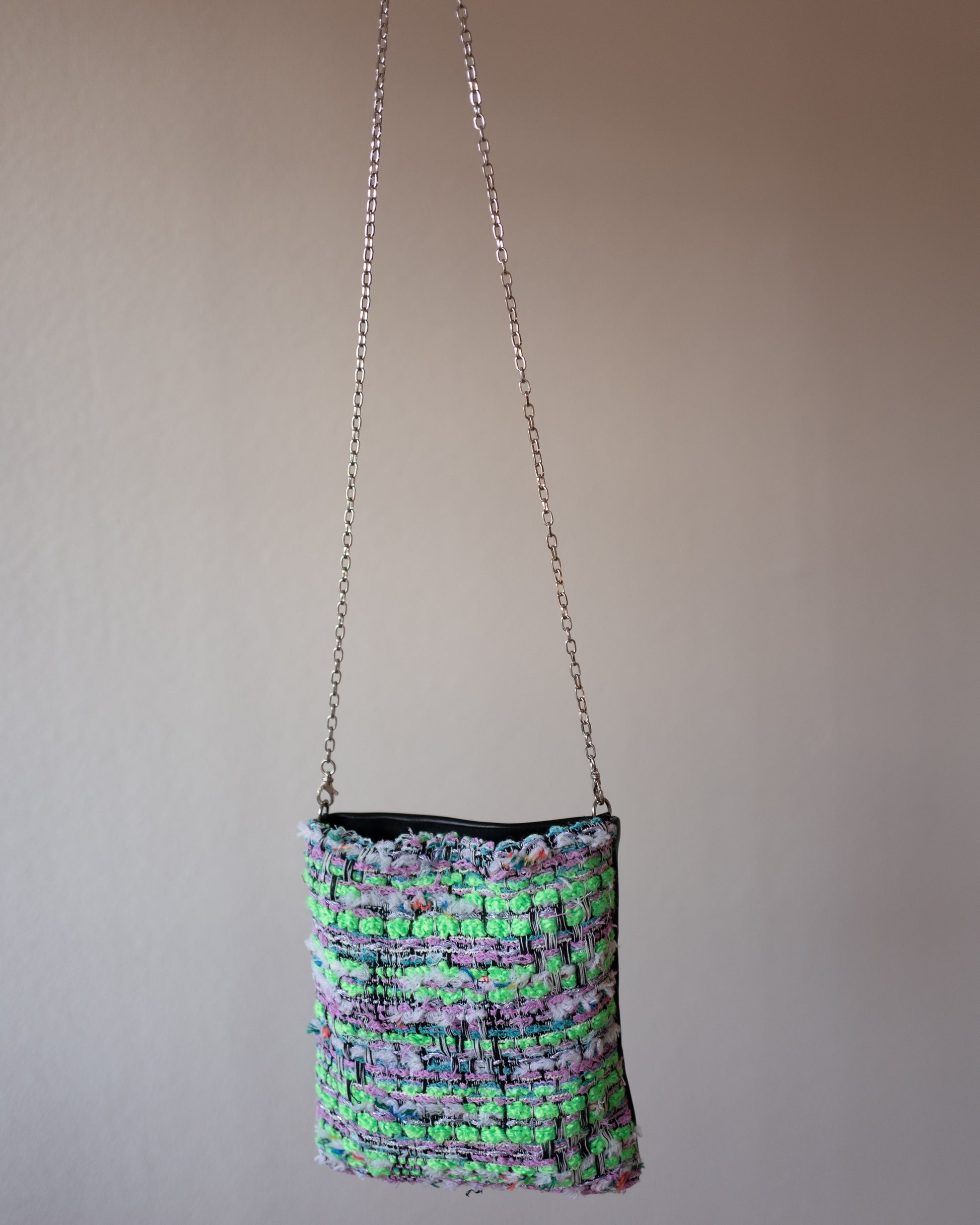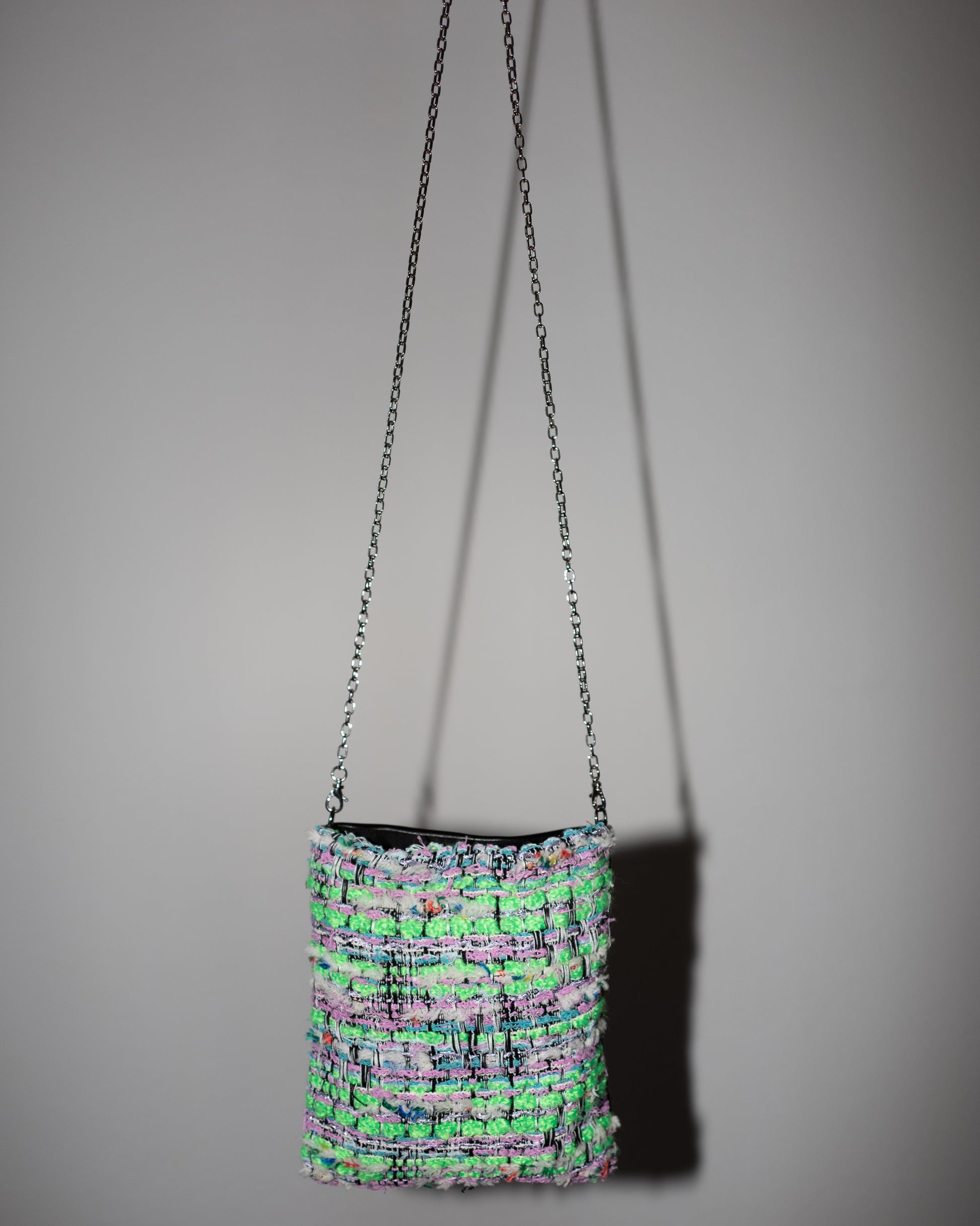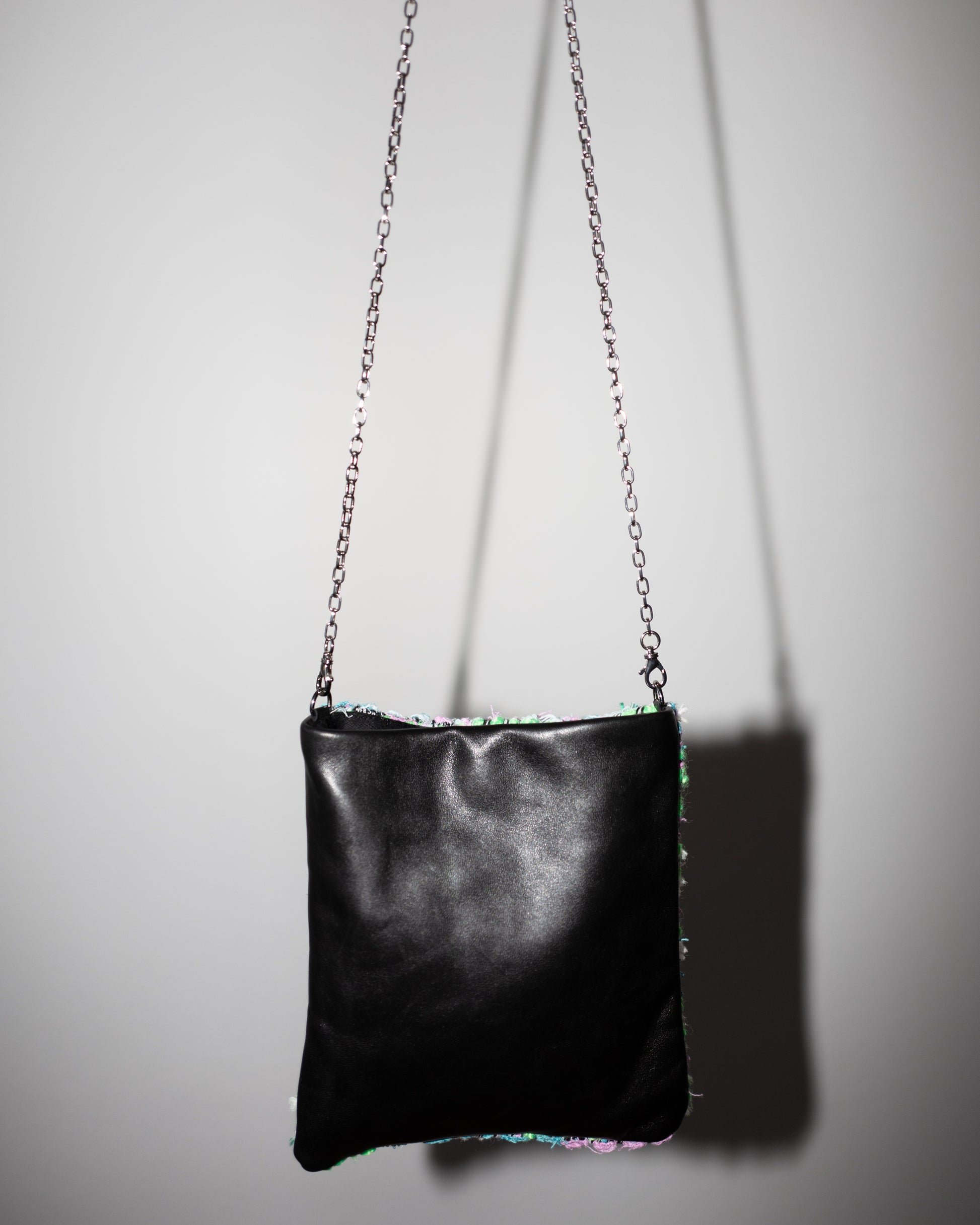 This Leather bag is a one of a kind bag made of Italian Leather napa from Italy, French luxury lurex tweed and Italian Chains. It is light weight and easy to carry. It's the perfect party bag but can be worn in more causal settings as well. It's a fun, unique piece that are meant to spread joy and make you happy. Enough with heavy boring leatherbags that make you look like everybody else, we feel that you are unique, and a bag should match your individuality but also make you happy. A bag shall be irresistible and talk to your emotions, a piece that creates conversation and makes you dream.