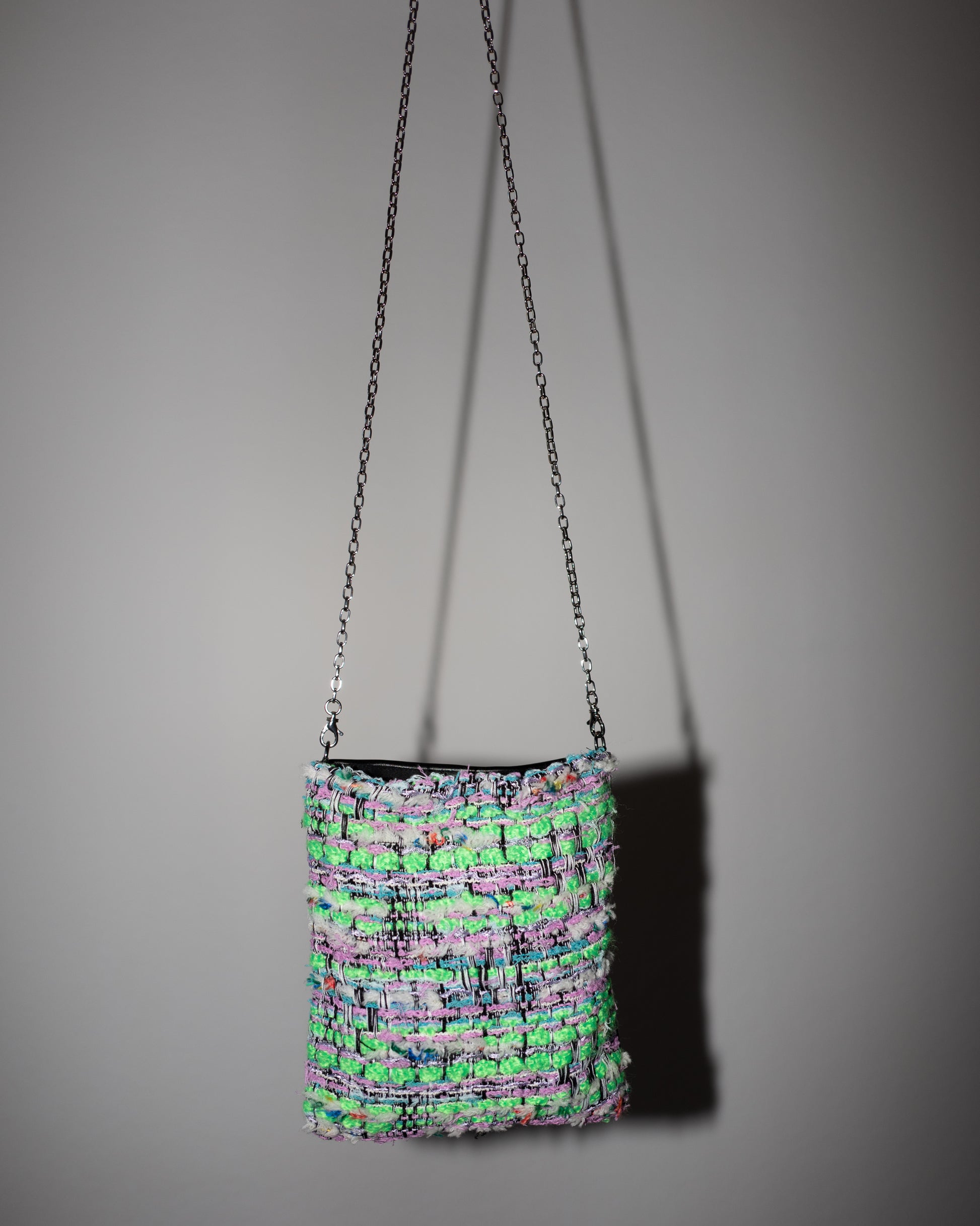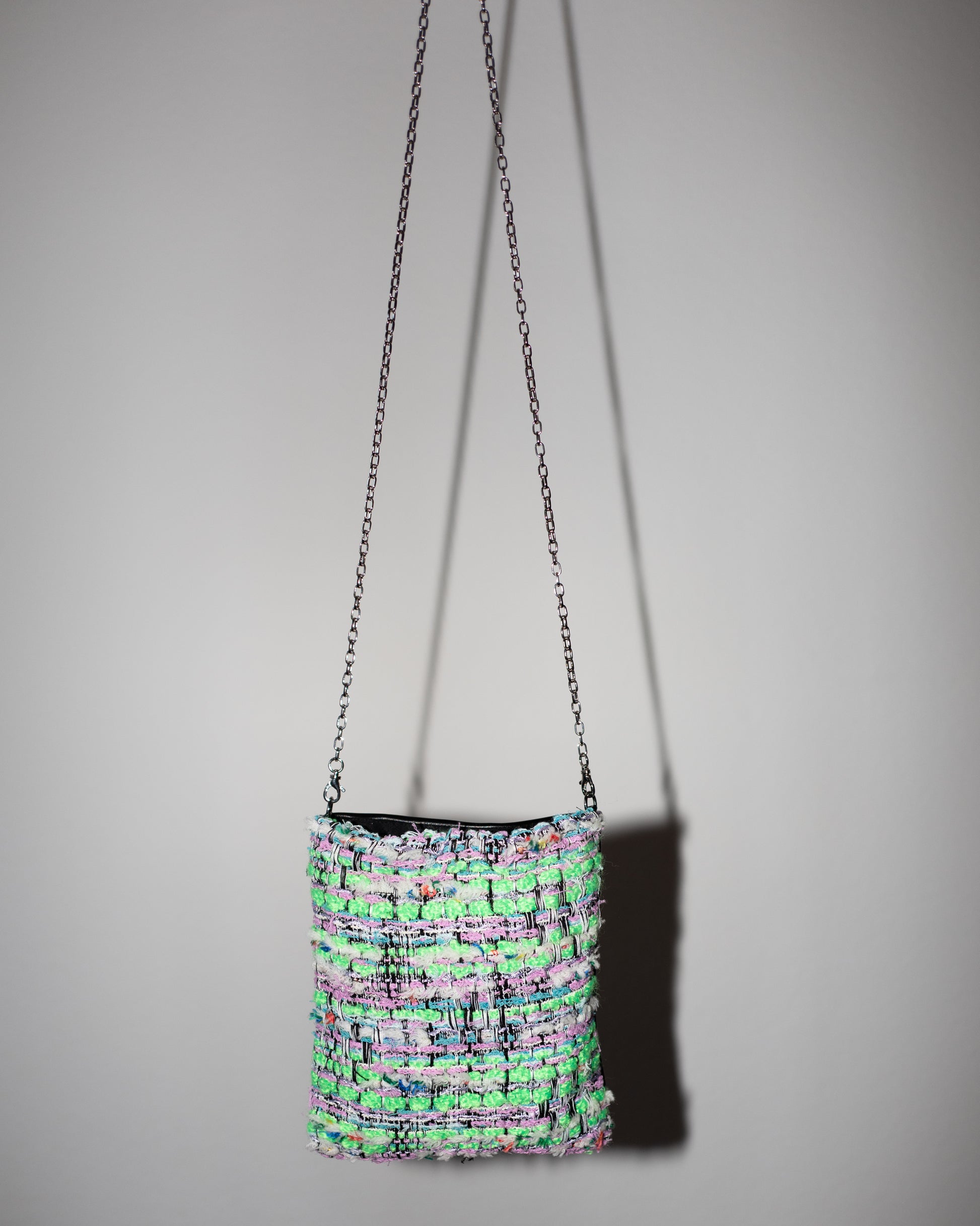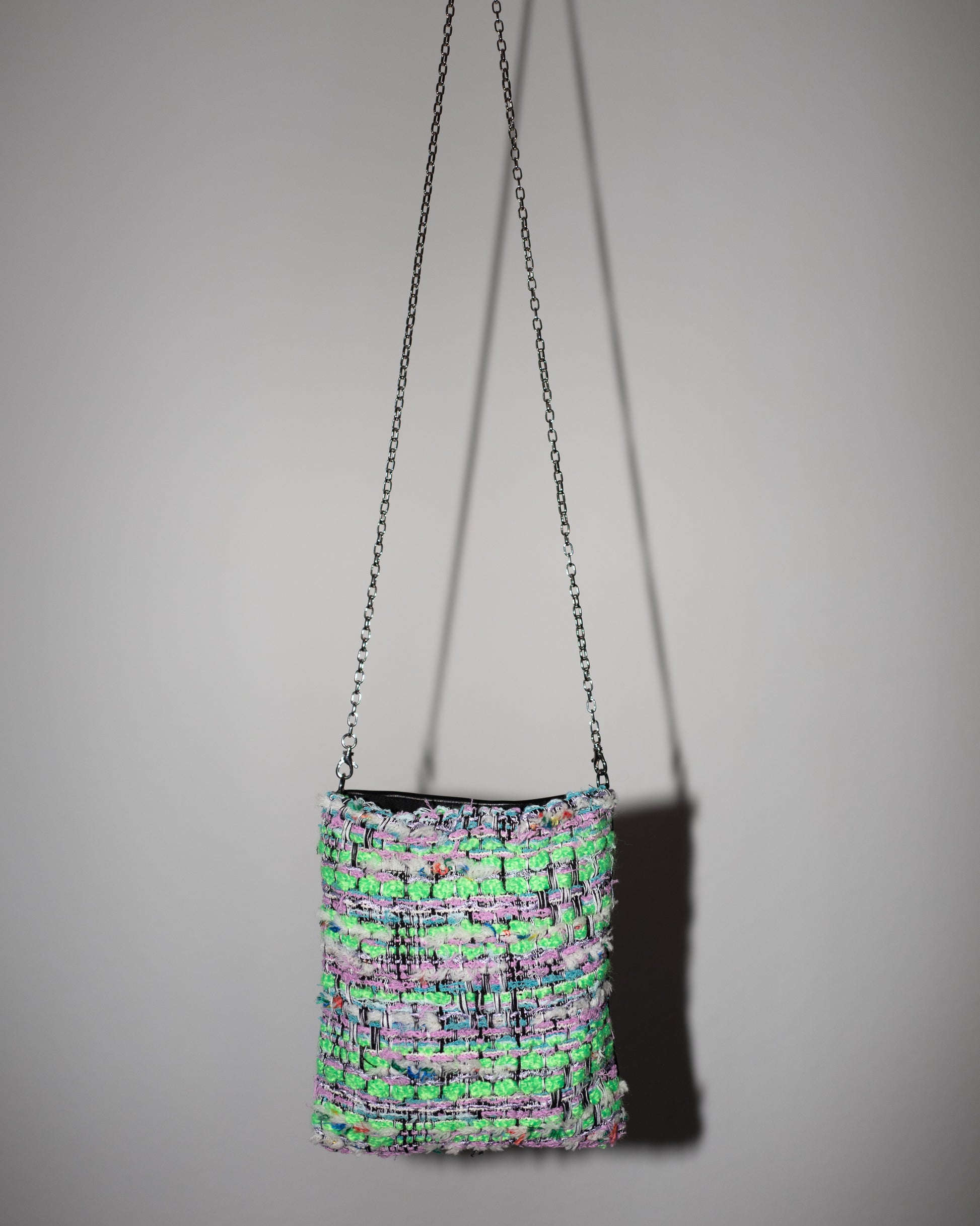 This Leather bag is a one of a kind bag made of Italian Leather napa from Italy, French luxury lurex tweed and Italian Chains. It is light weight and easy to carry. It's the perfect party bag but can be worn in more causal settings as well. It's a fun, unique piece that are meant to spread joy and make you happy. Enough with heavy boring leatherbags that make you look like everybody else, we feel that you are unique, and a bag should match your individuality but also make you happy. A bag shall be irresistible and talk to your emotions, a piece that creates conversation and makes you dream.