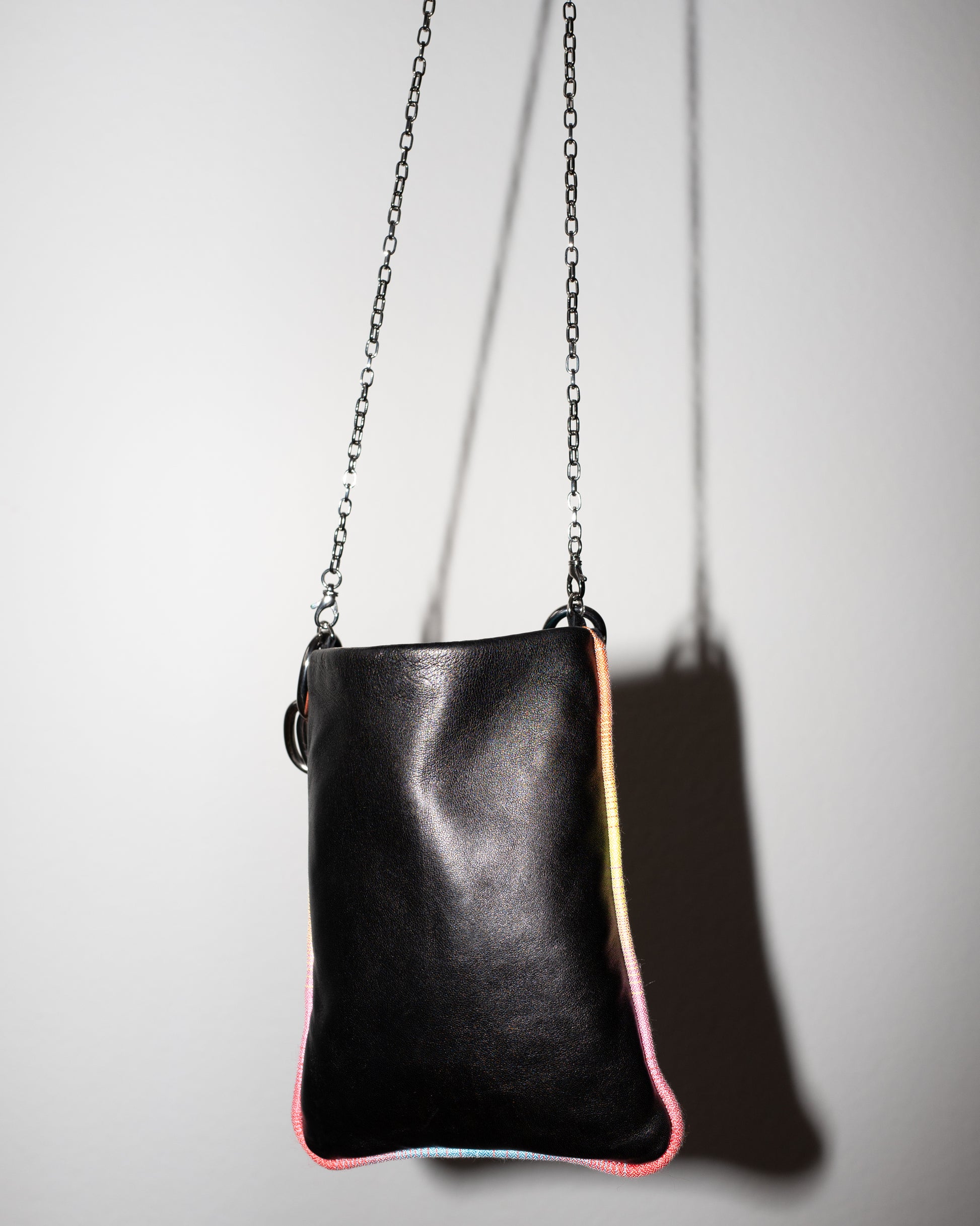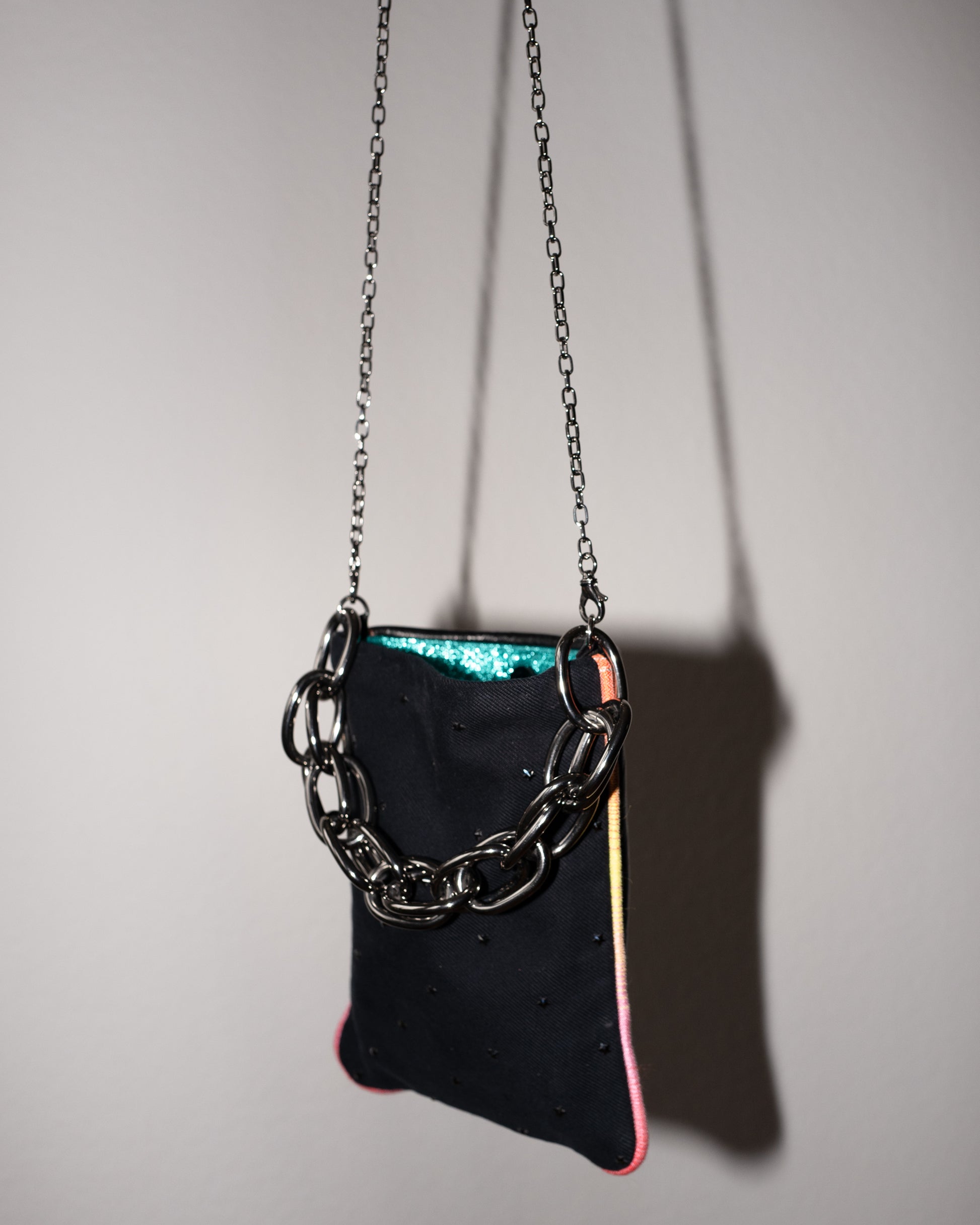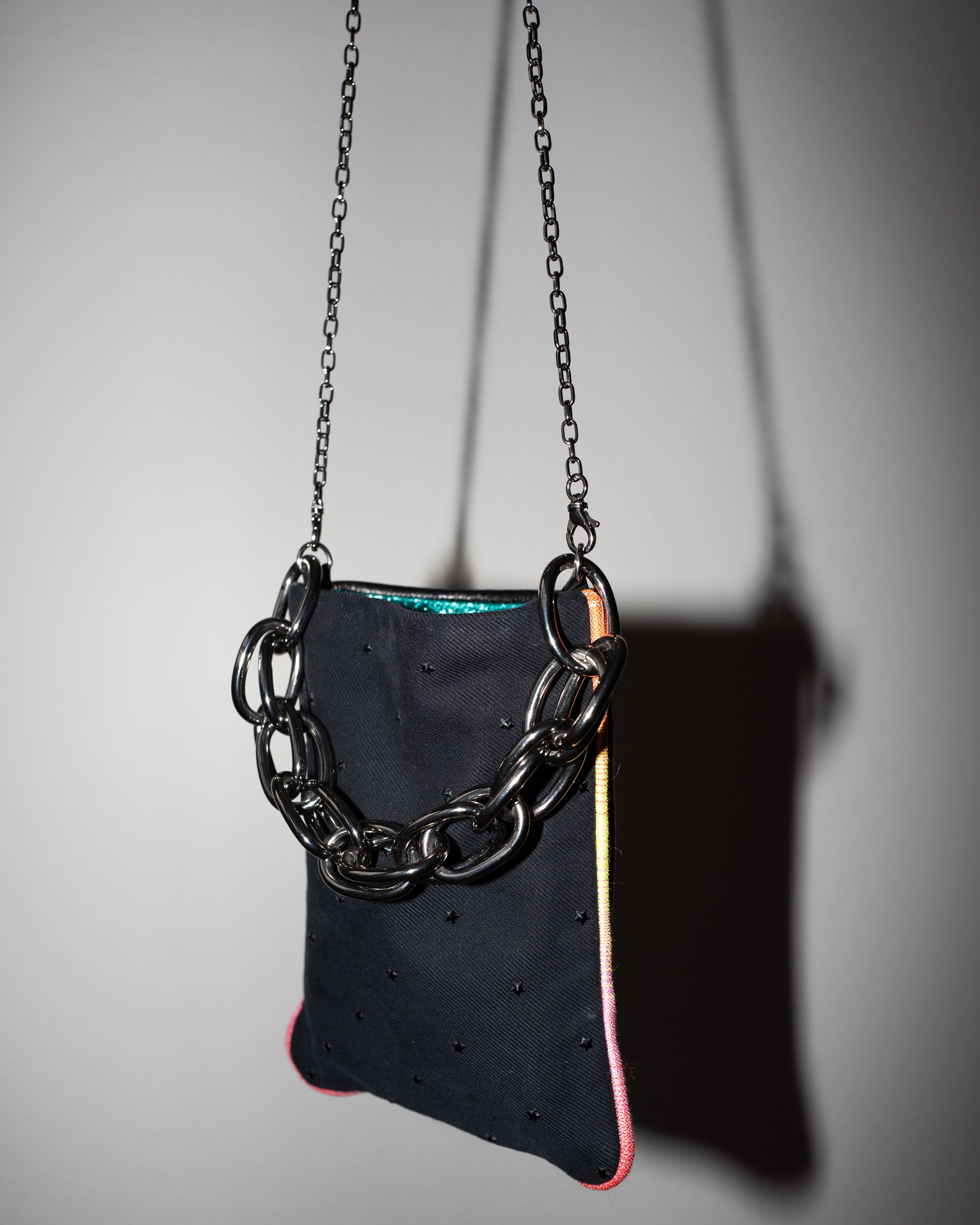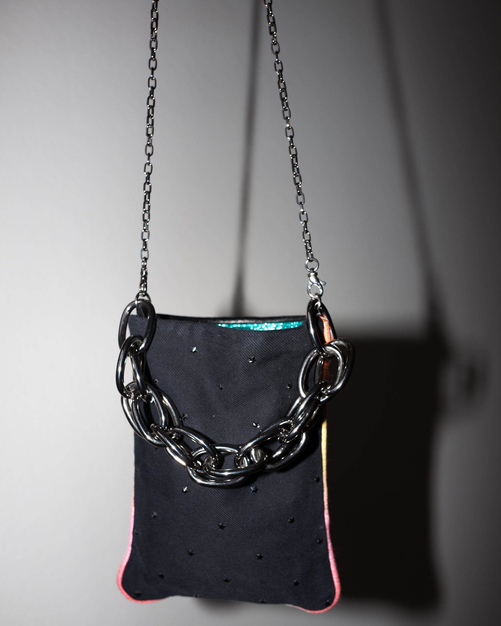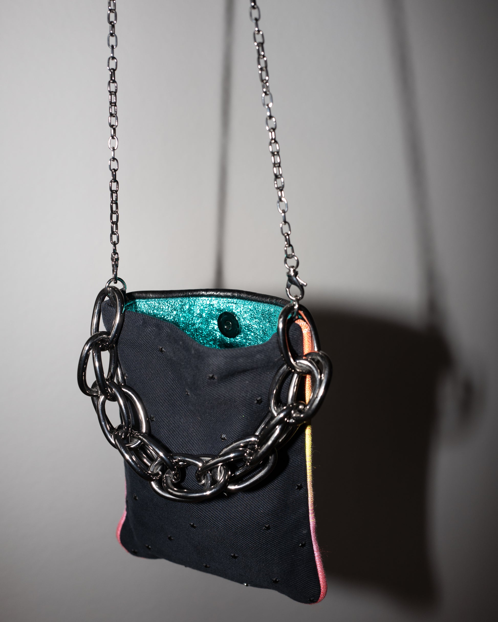 This Leather bag is a one of a kind bag made of  French Vintage Workwear, Italian Napa Leather and Italian Chains. It is light weight and easy to carry. It's the perfect party bag but can be worn in more causal settings as well. It's a fun, unique piece that are meant to spread joy and make you happy. Enough with heavy boring leatherbags that make you look like everybody else, we feel that you are unique, and a bag should match your individuality but also make you happy. A bag shall be irresistible and talk to your emotions, a piece that creates conversation and makes you dream.
