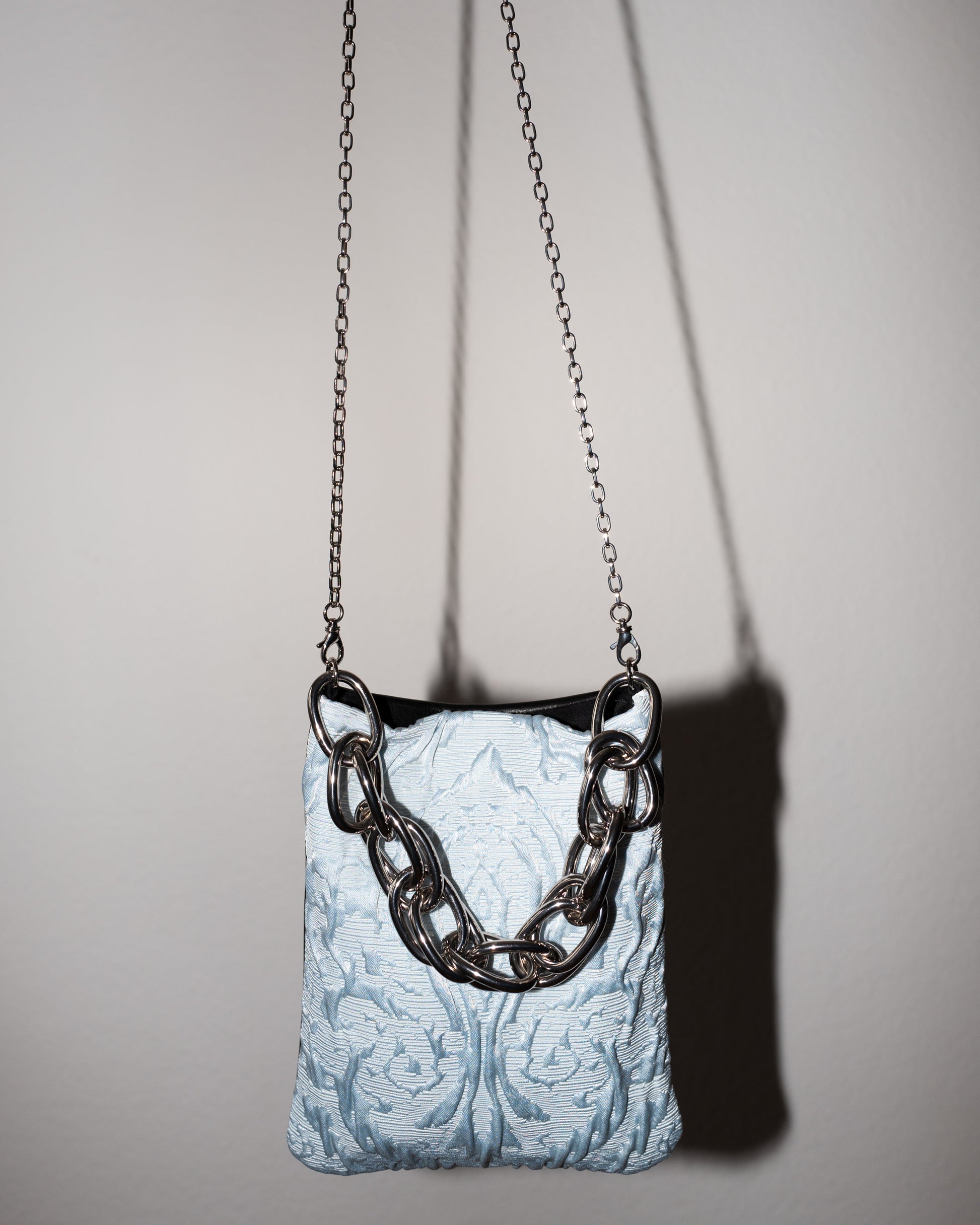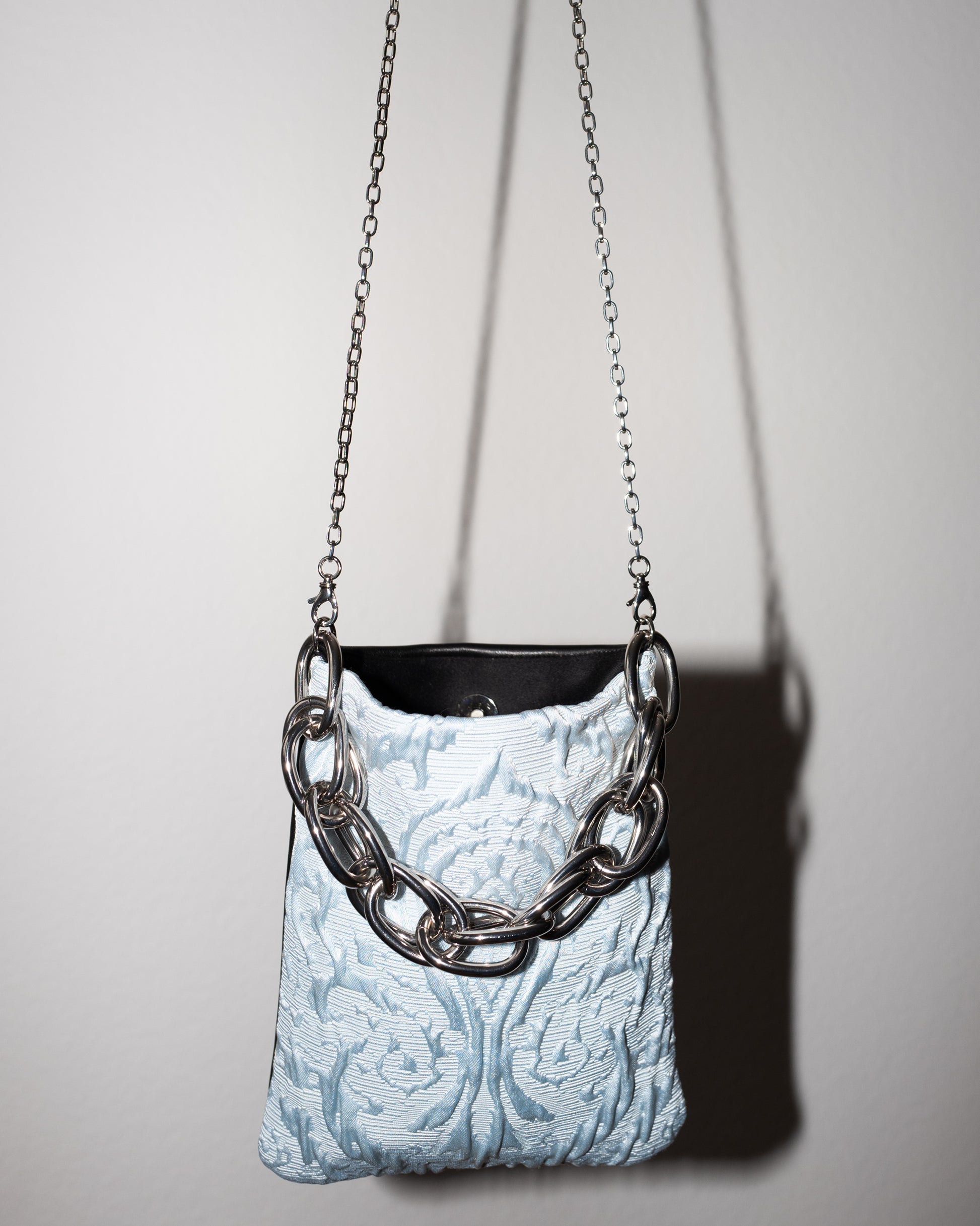 Black Leather Napa Bag with Light Blue Brocade, Black Moleskin Lining, Long detachable Chain Palladium Colored Brass Chain and Chunky Chain Handle in Palladium Metal tone Chain.