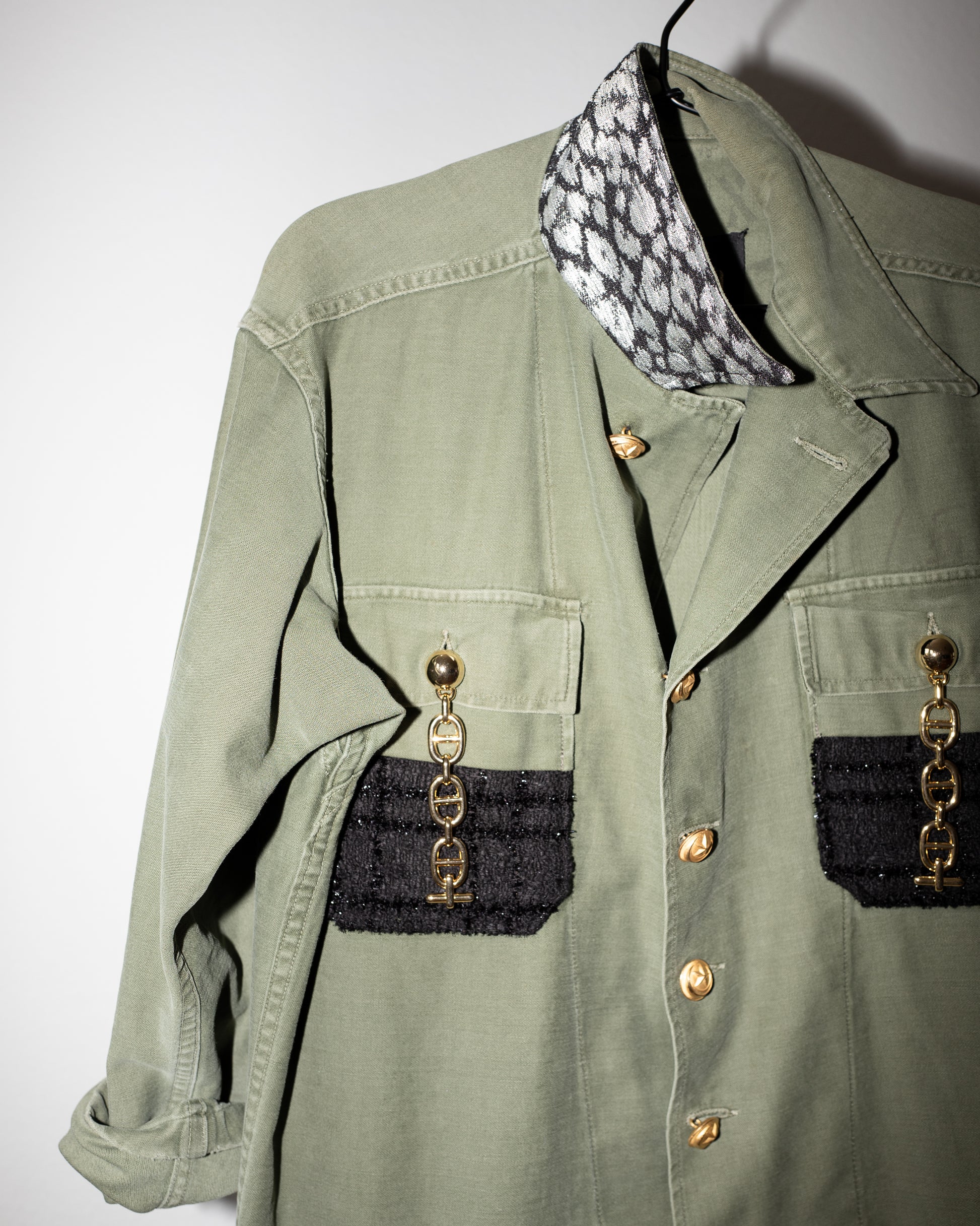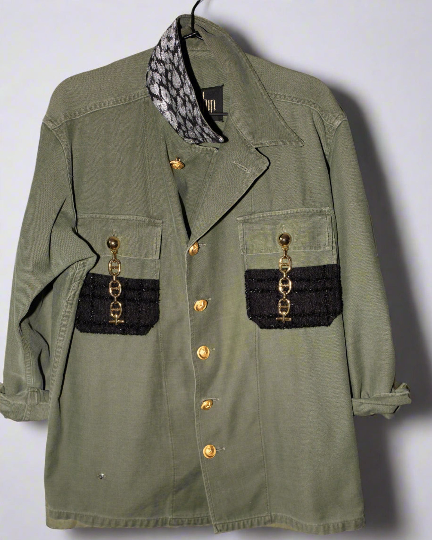 Repurposed Military Green Jacket – Gold Chain, Black & Silver Lurex, Vintage Brass Buttons