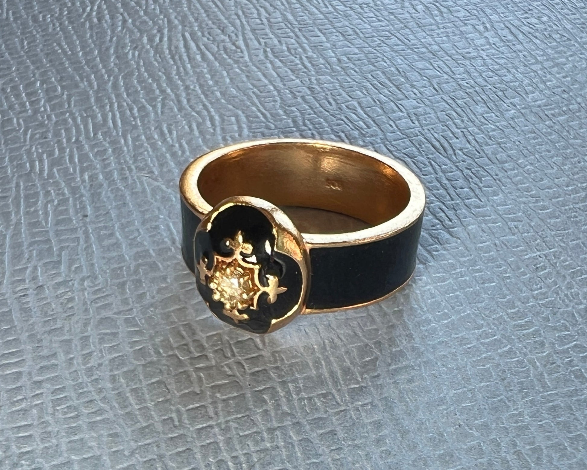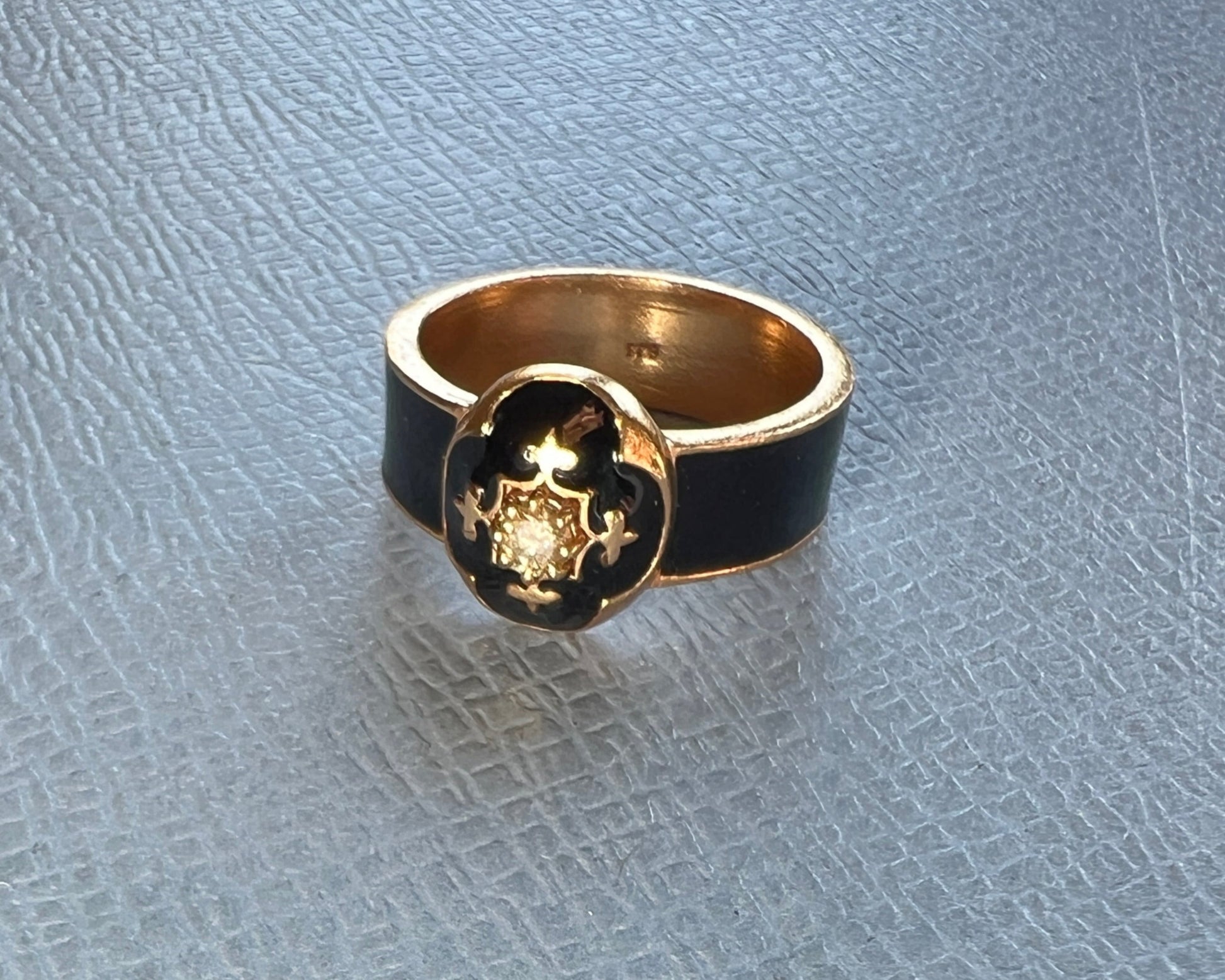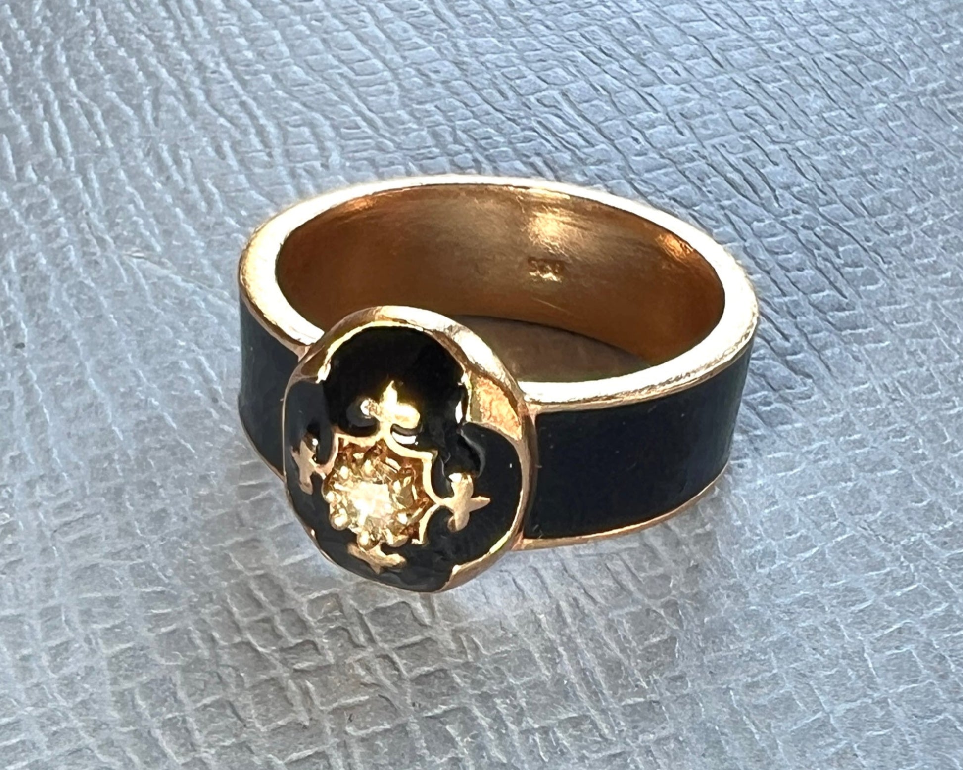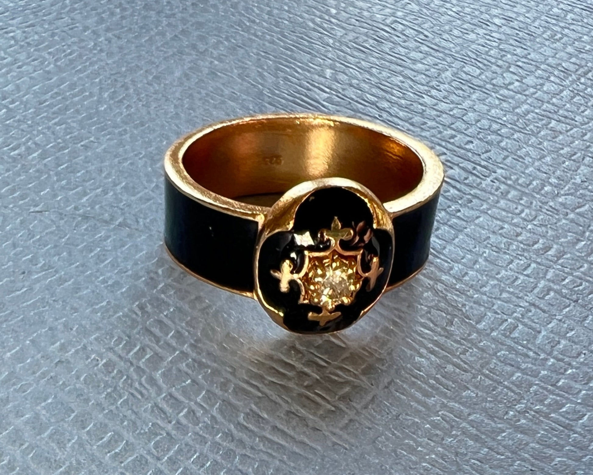 Diamond Fleur de Lis Ring Black Enamel  –  14K Gold Plated Silver