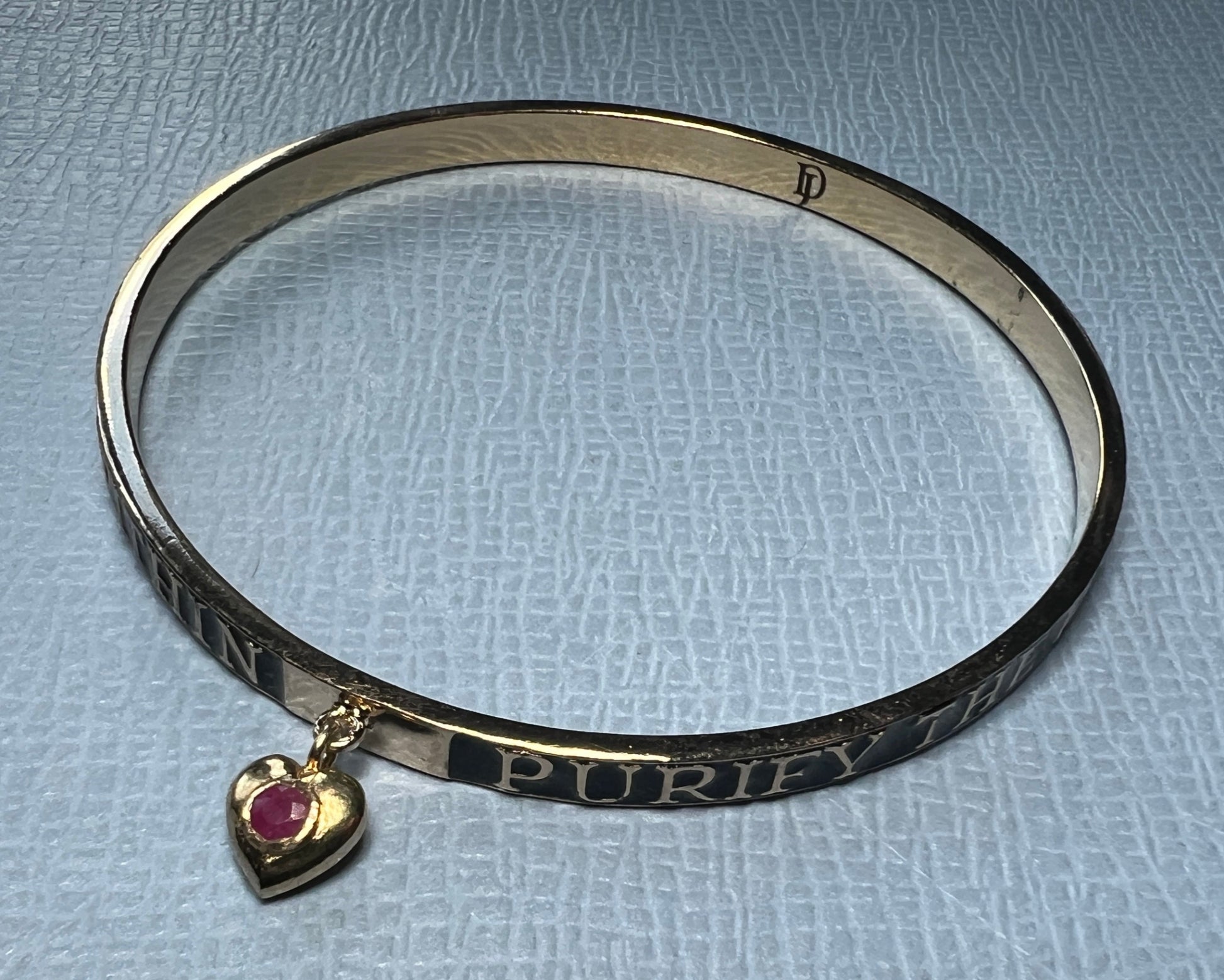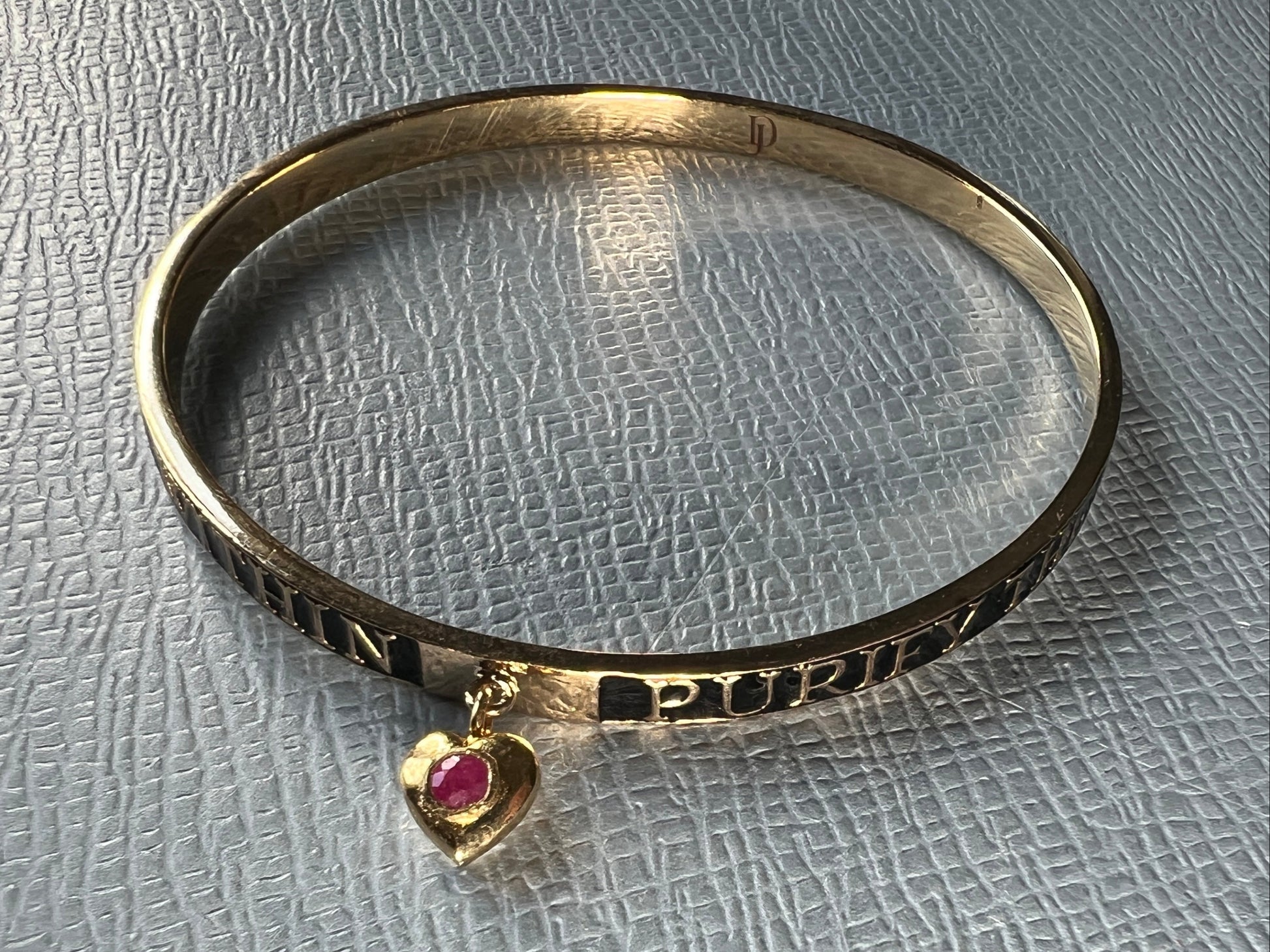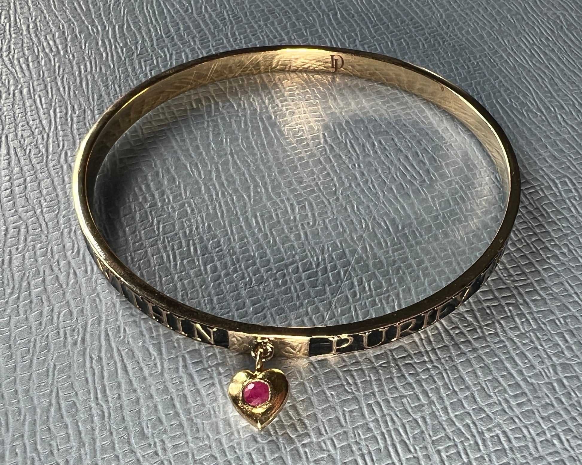 Ruby Heart Bangle Bracelet, made in 14K gold-plated brass with Black Enamel