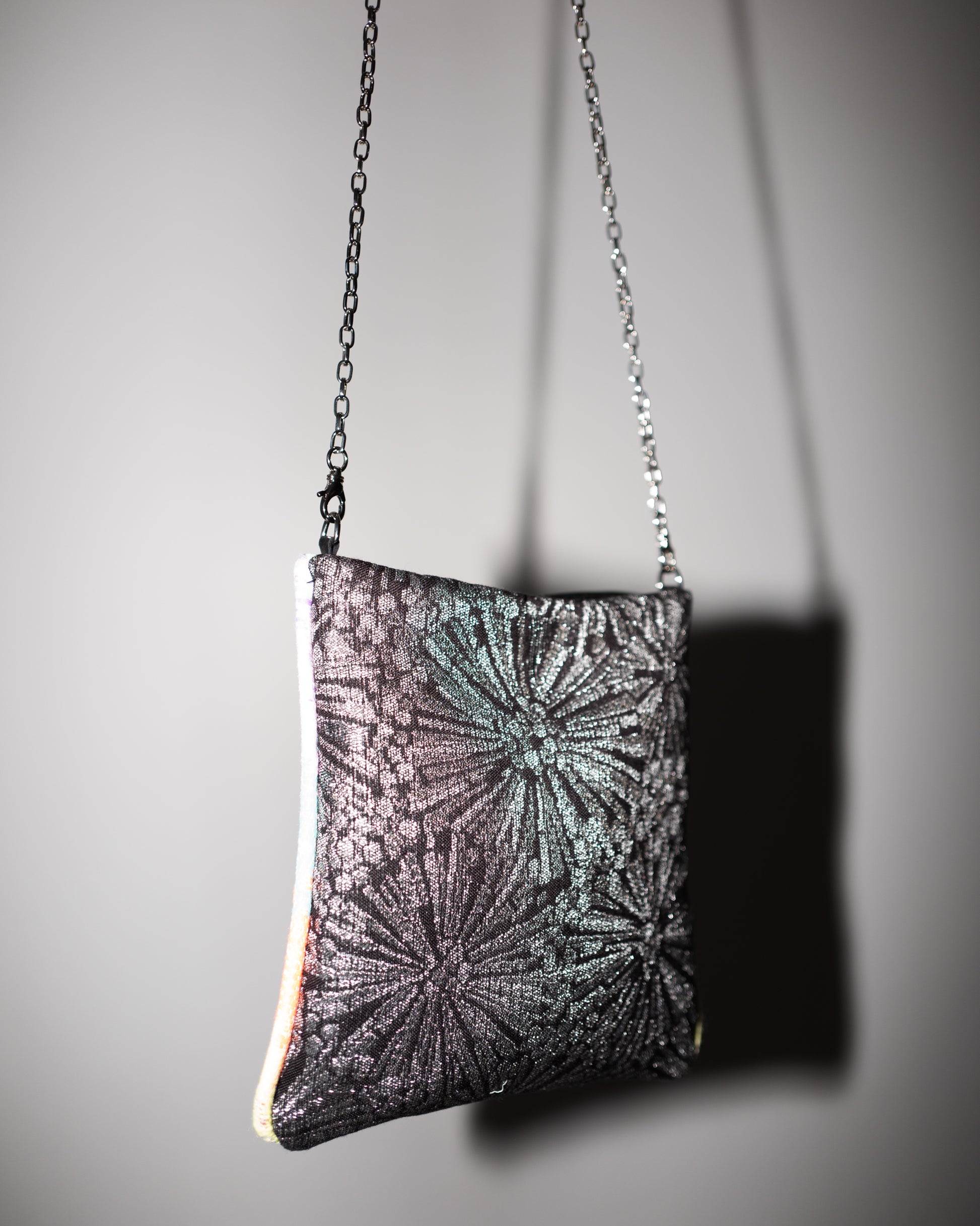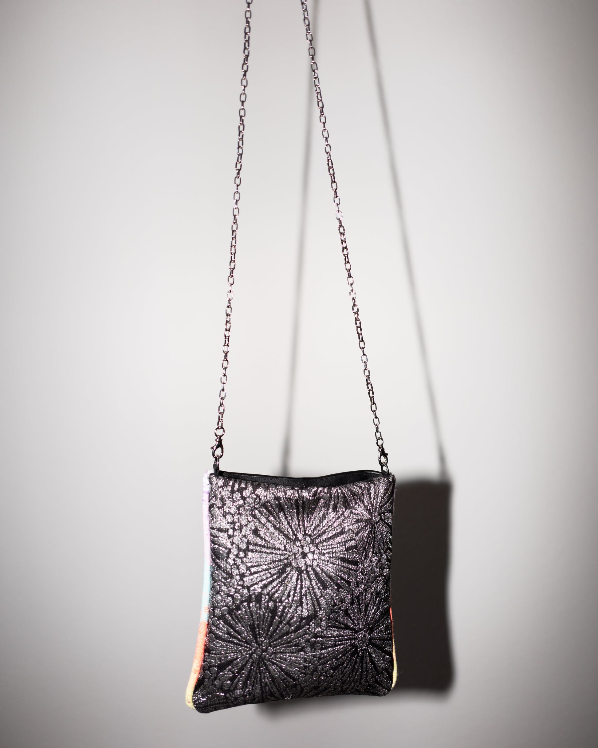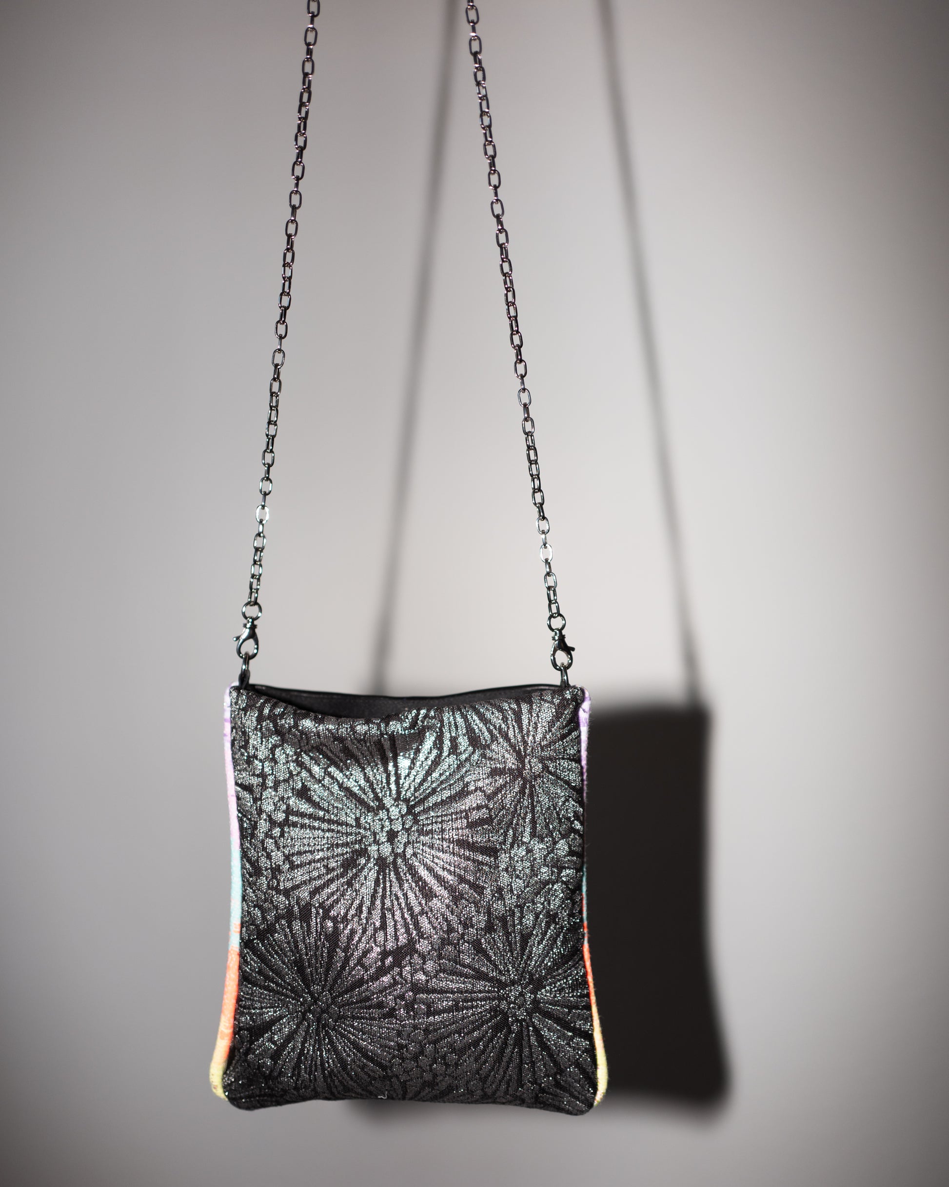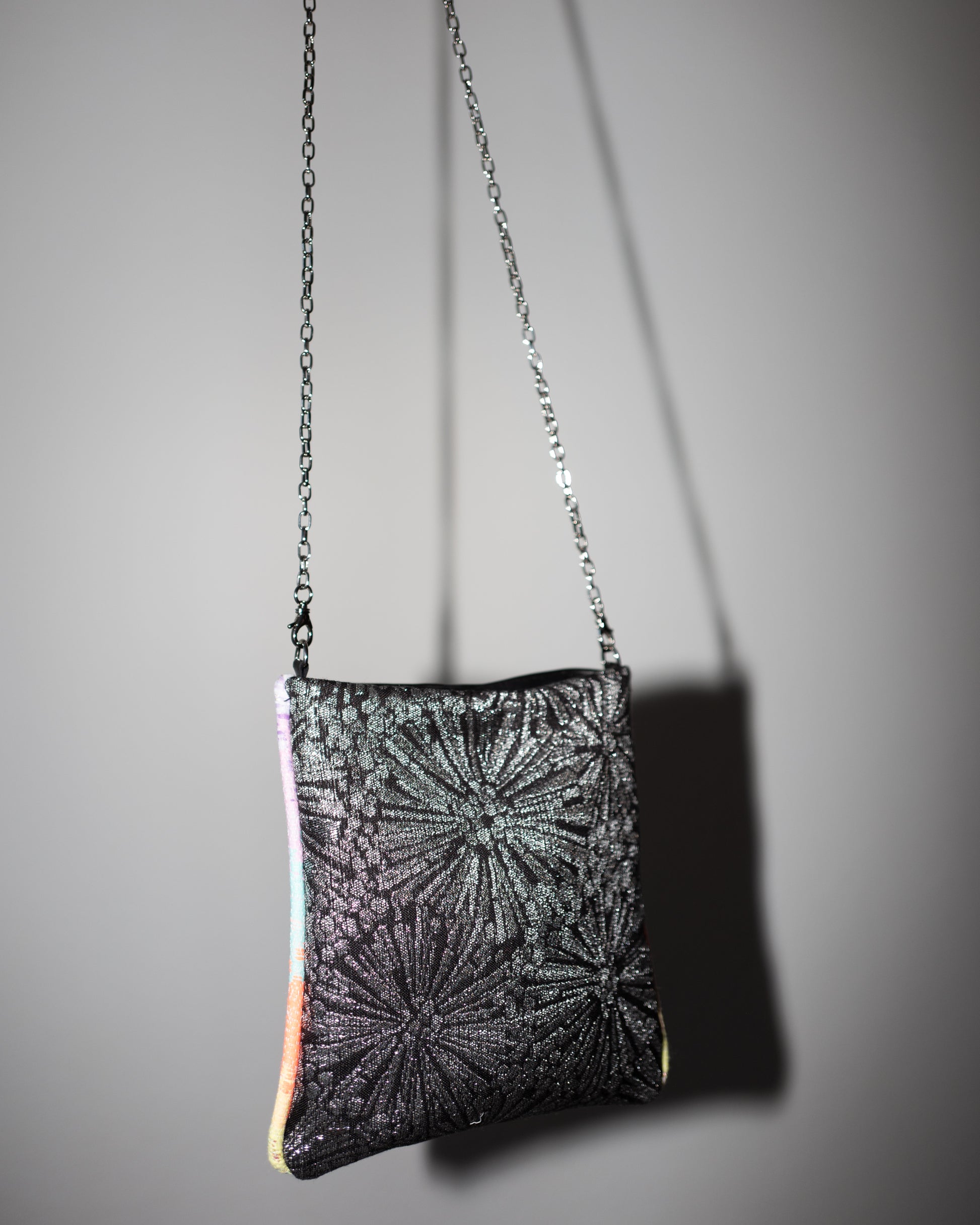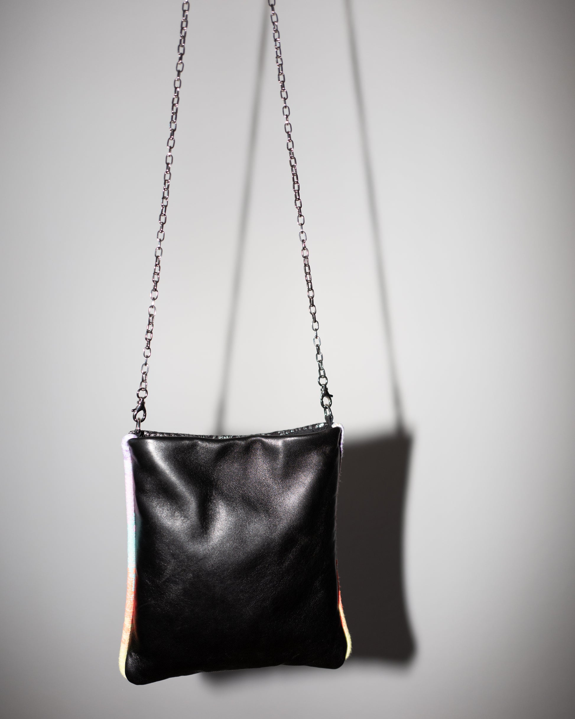 Silver Lurex Black Bag with Black Leather Silver Neon Rainbow Piping Silver Chain
