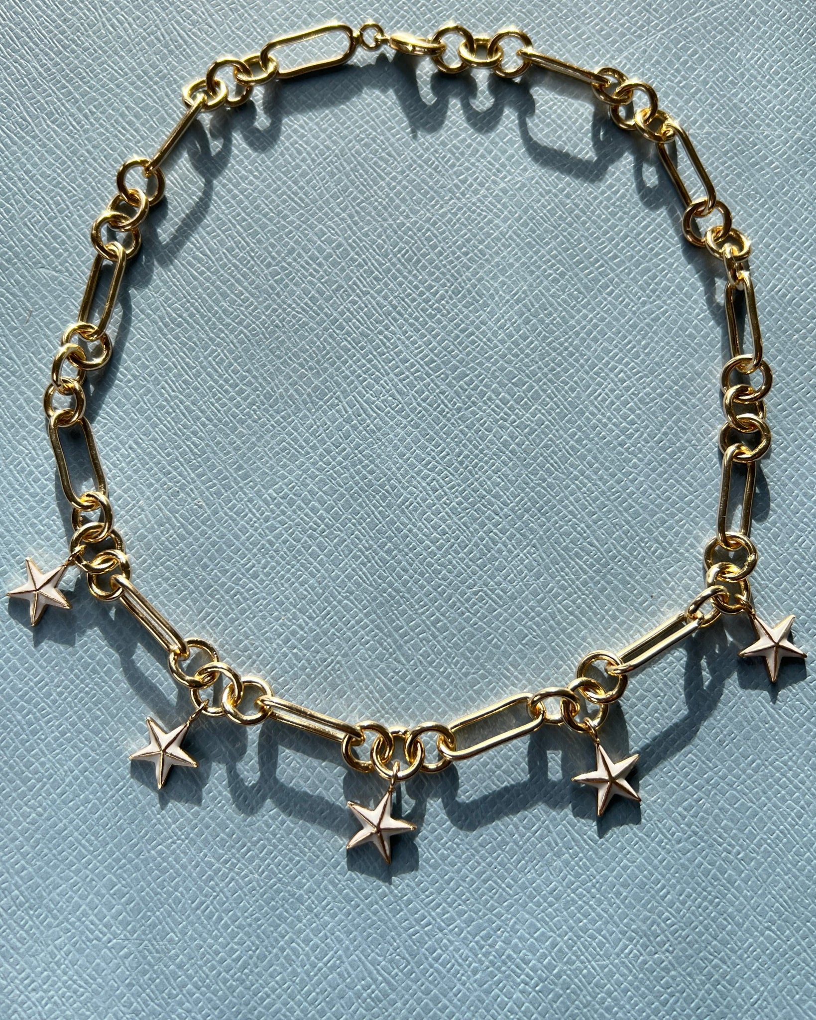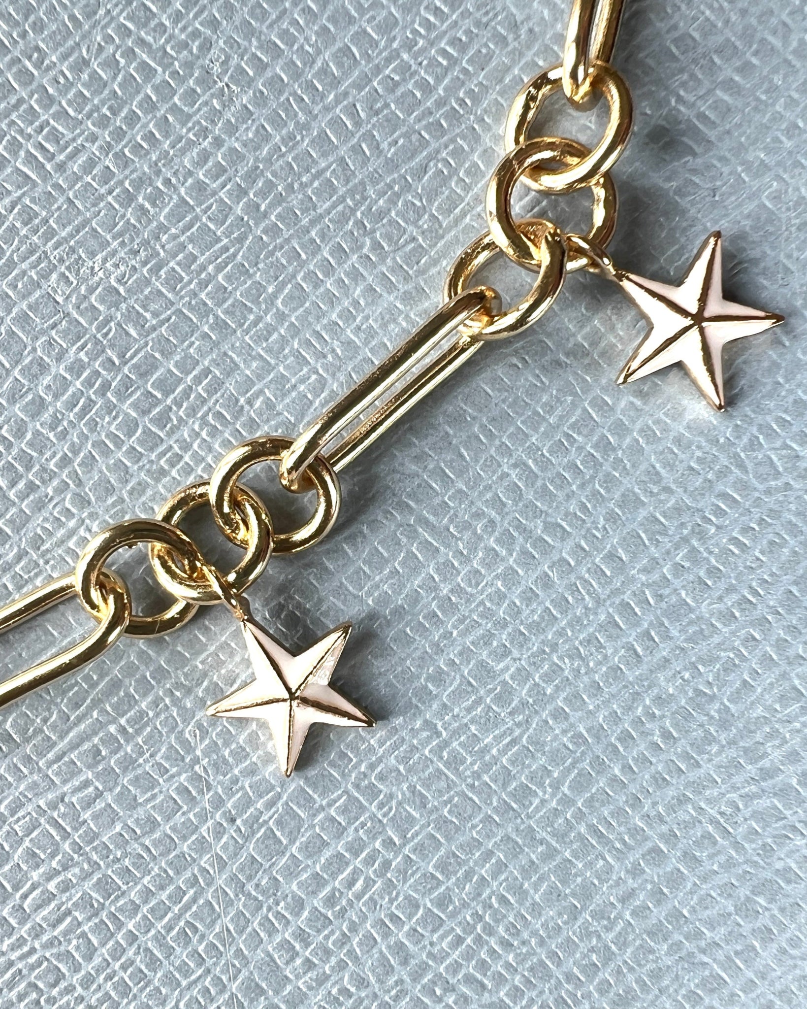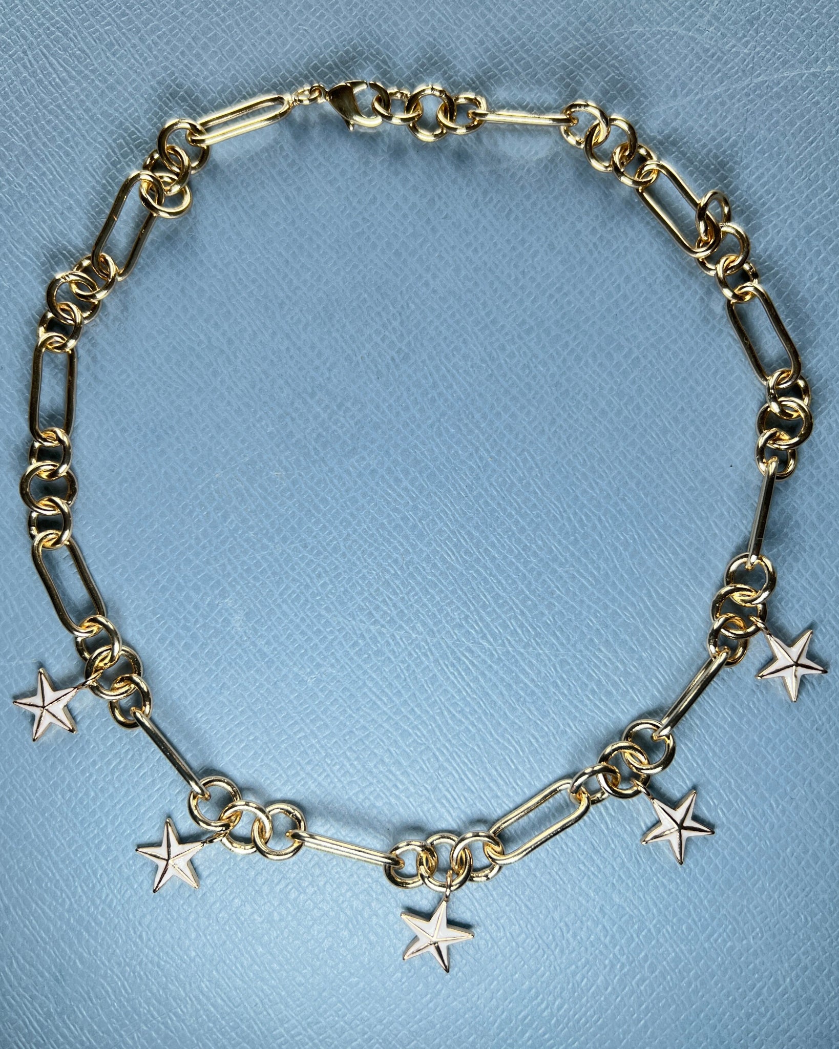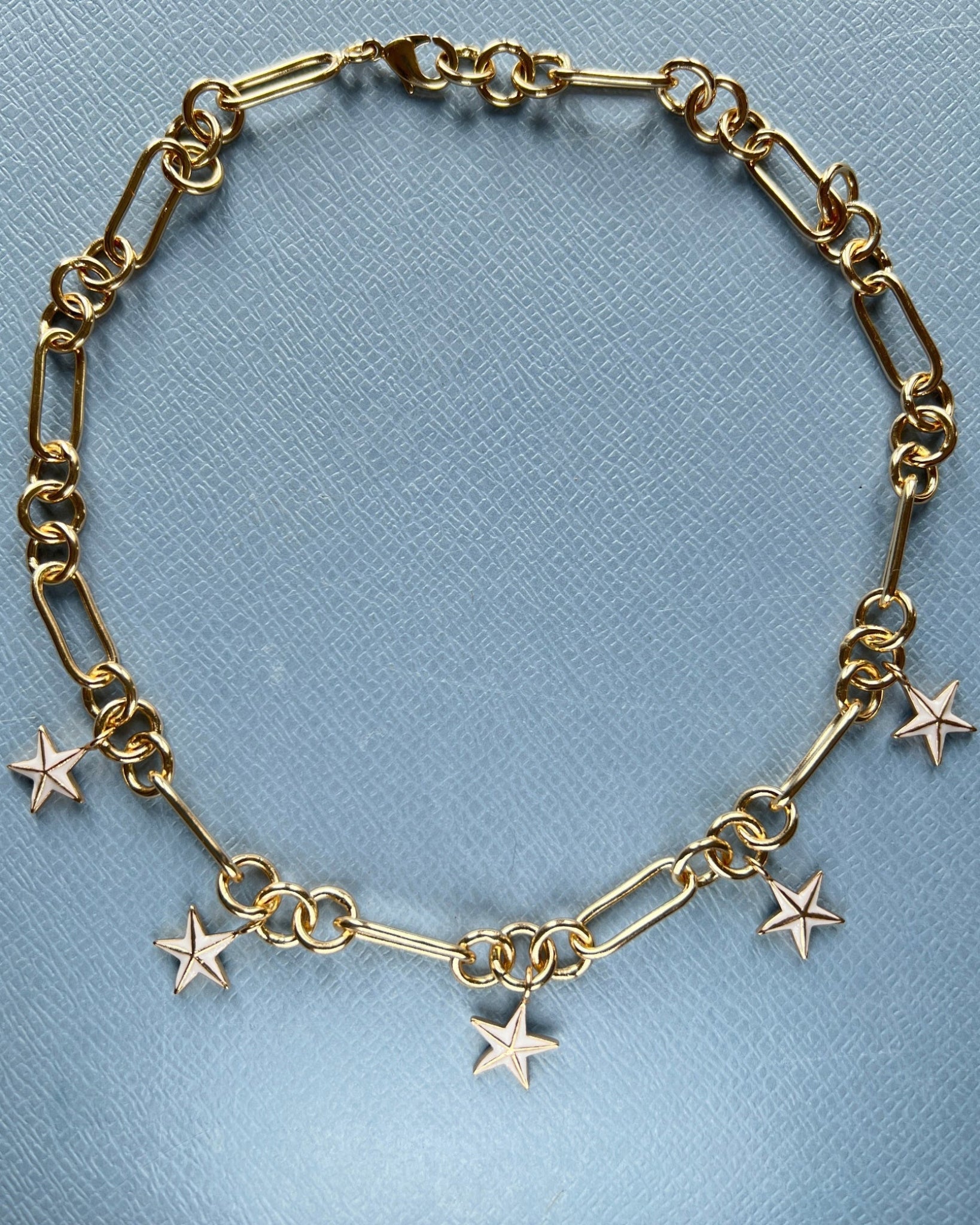 A unique star charm choker, crafted from 14K gold-plated metal and adorned with White enamel stars.