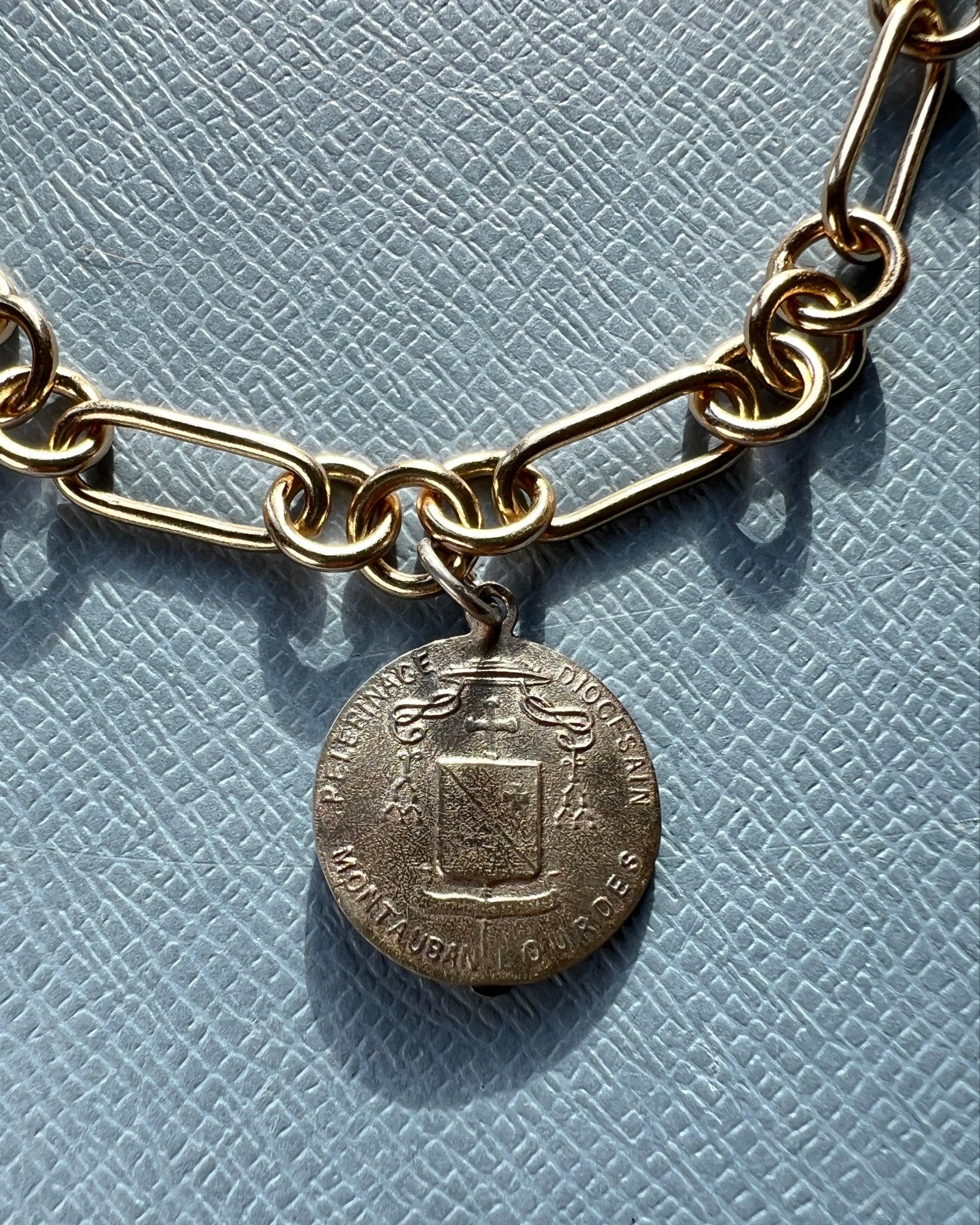 A Gold plated Choker Necklace, with a Tanzanite Set Virgin Mary Medal crafted in Silver.